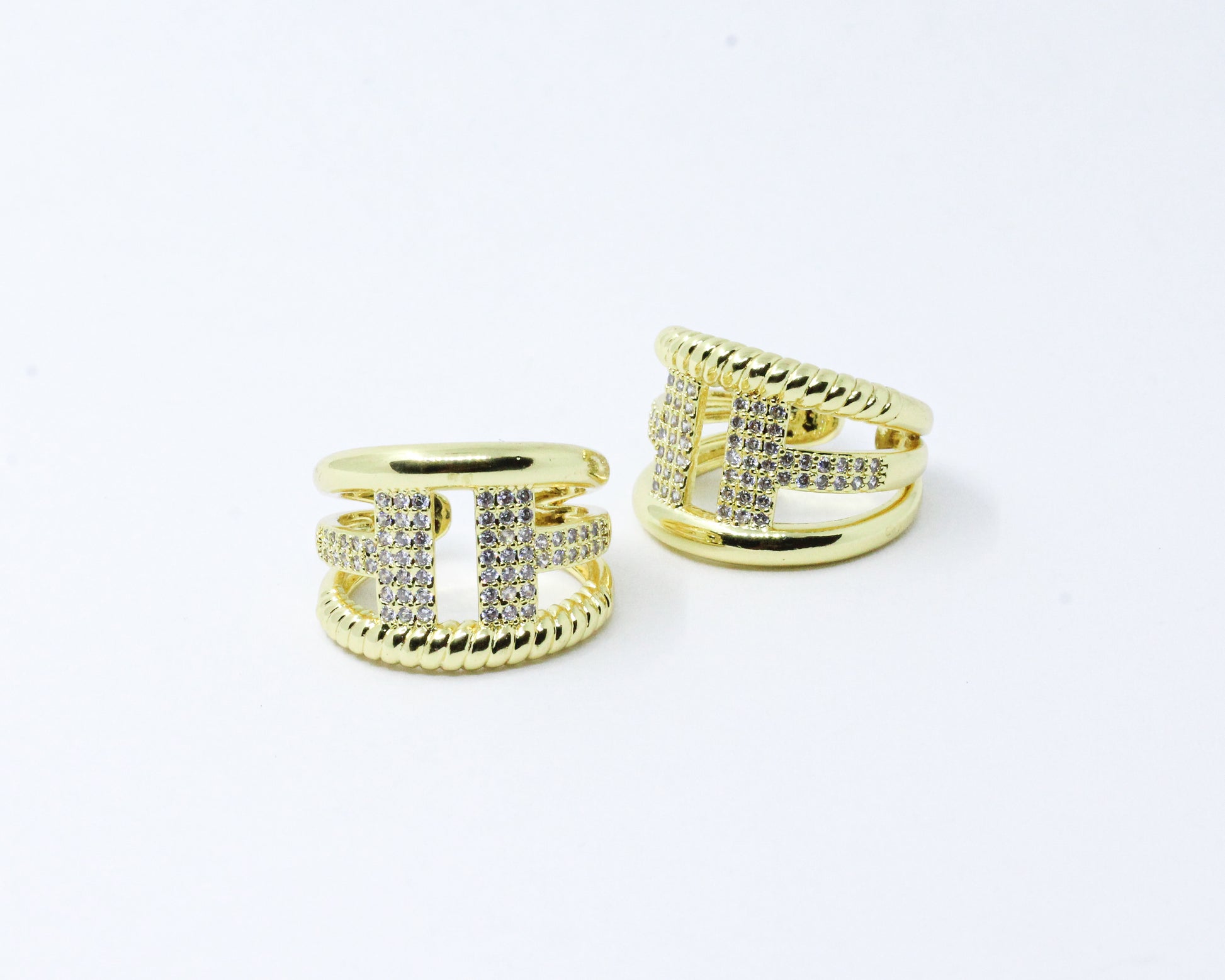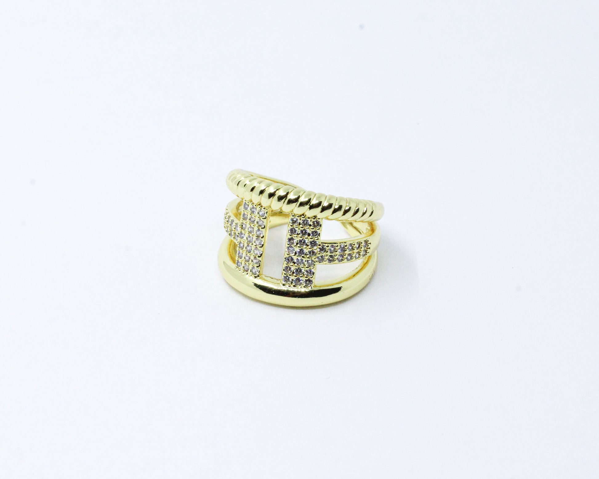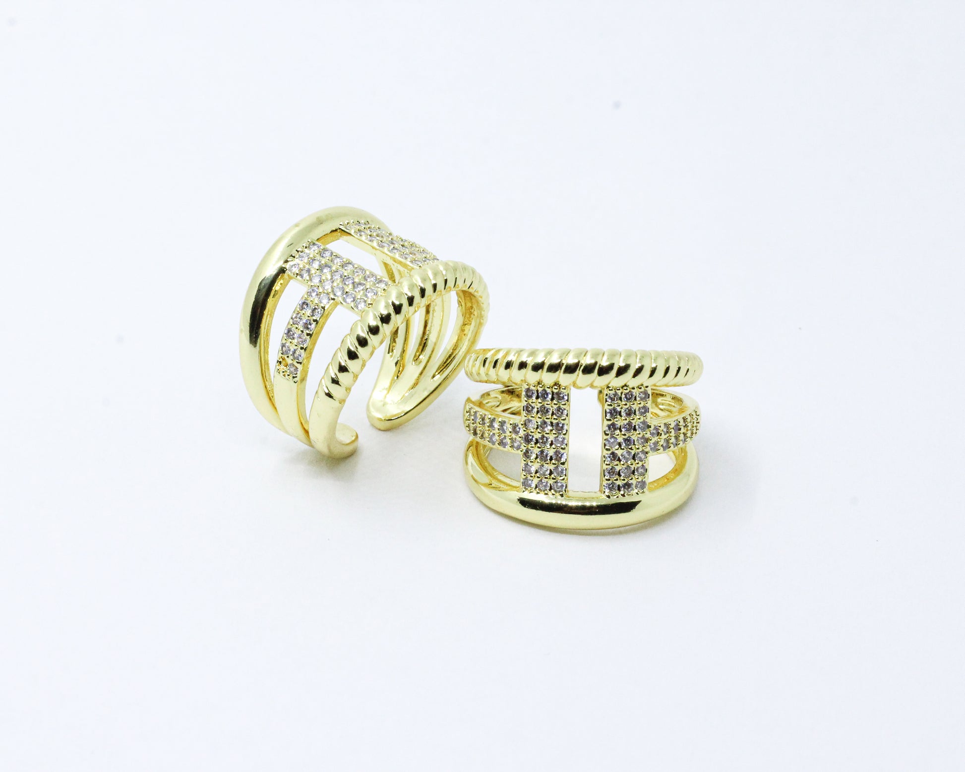Un anillo graduable en talla con un diseño abierto, acentuado por filas de circones brillantes y detalles texturizados, que lo convierten en una pieza llamativa y sofisticada.