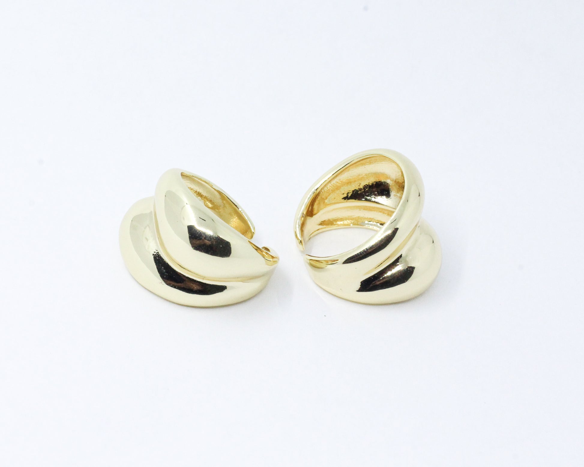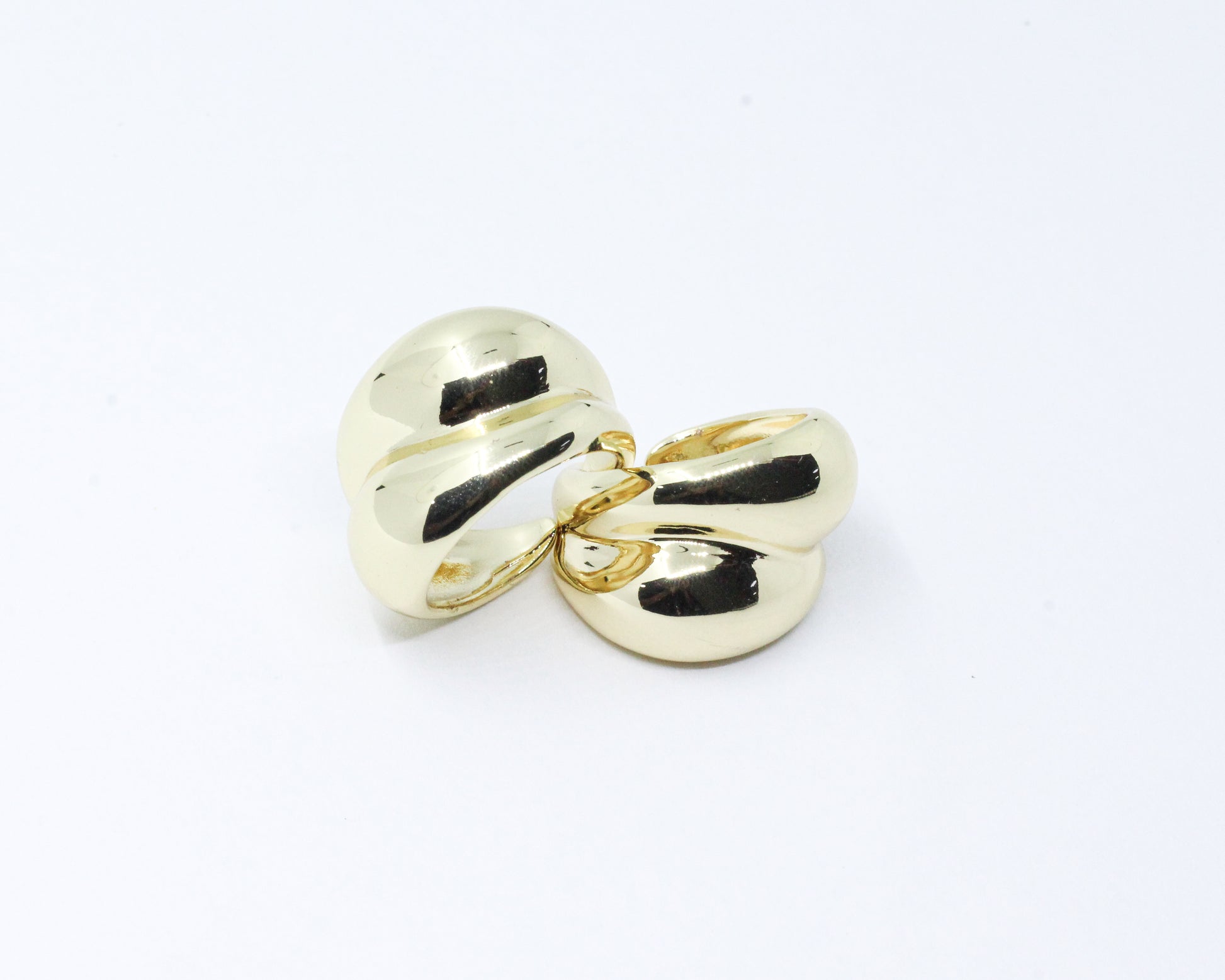 Un anillo graduable en talla, estilo chunky, compuesto por dos bandas lisas que se entrelazan de manera asimétrica, creando un efecto visual moderno.