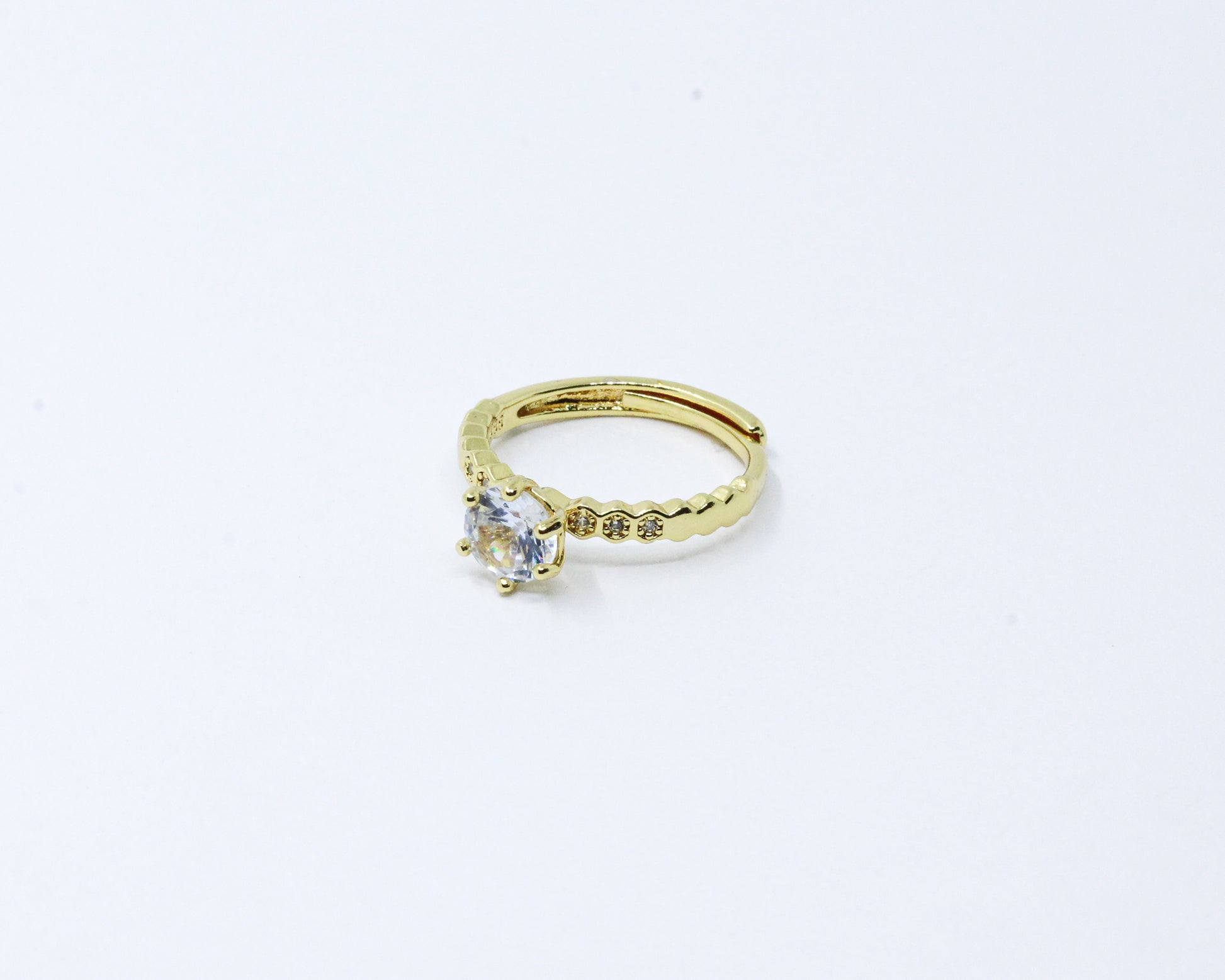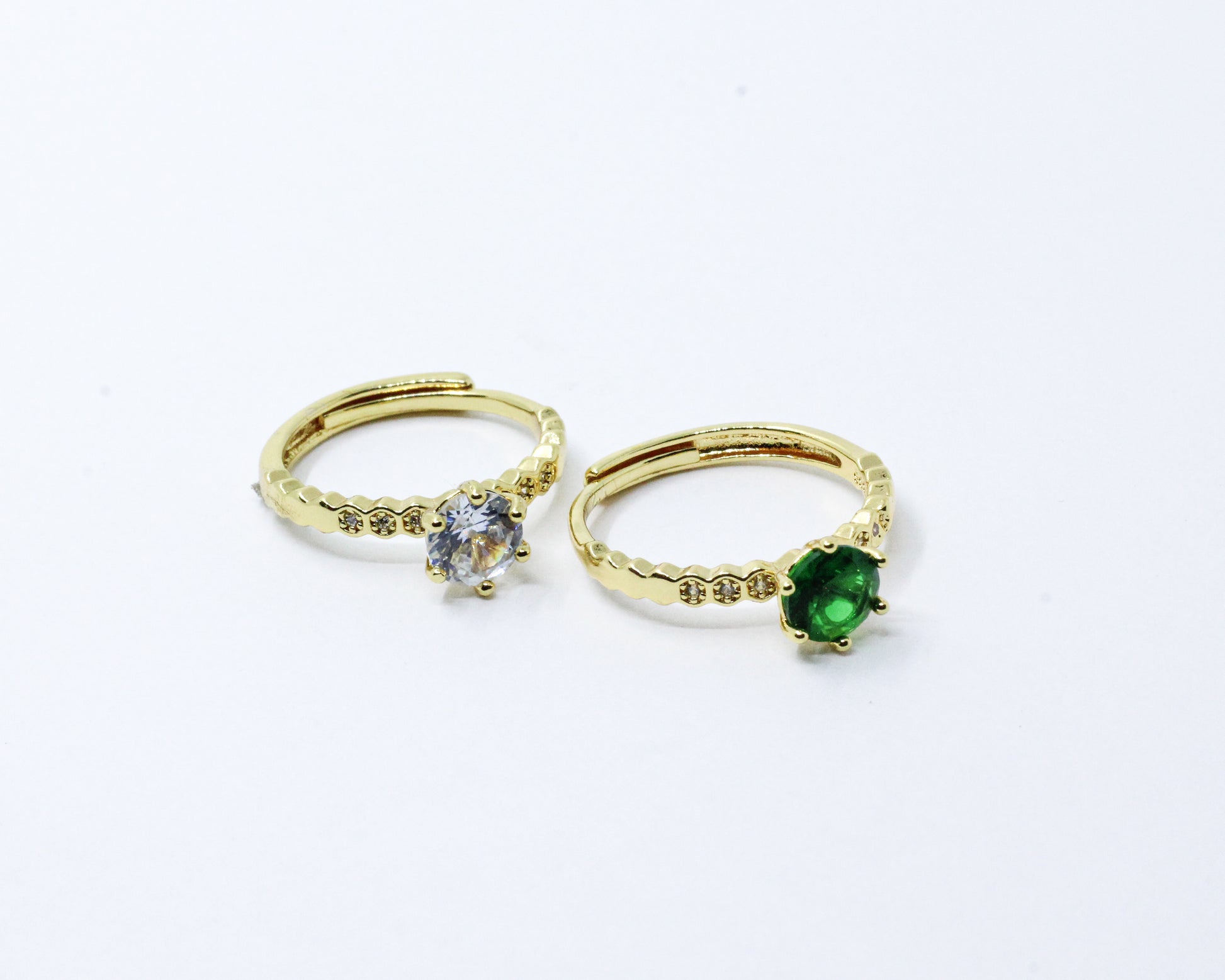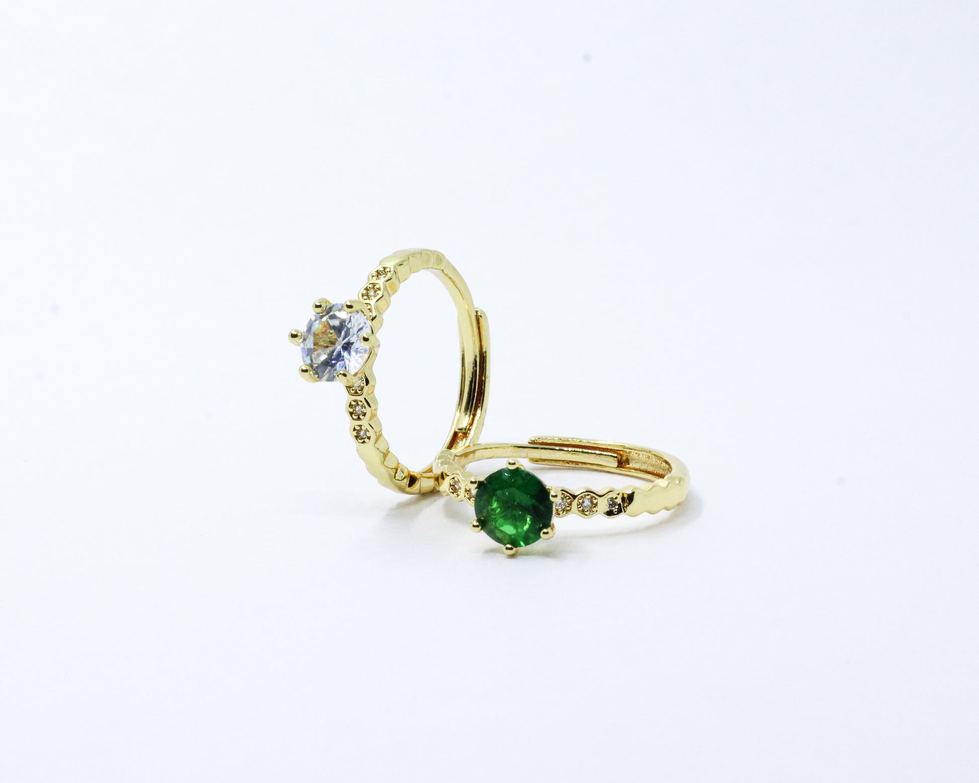 Un anillo graduable en talla tipo solitario, disponible con circón blanco o verde esmeralda (según elección) de estilo diamante, adornado con microcircones en sus lados. Un diseño que eleva su elegancia y simetría.