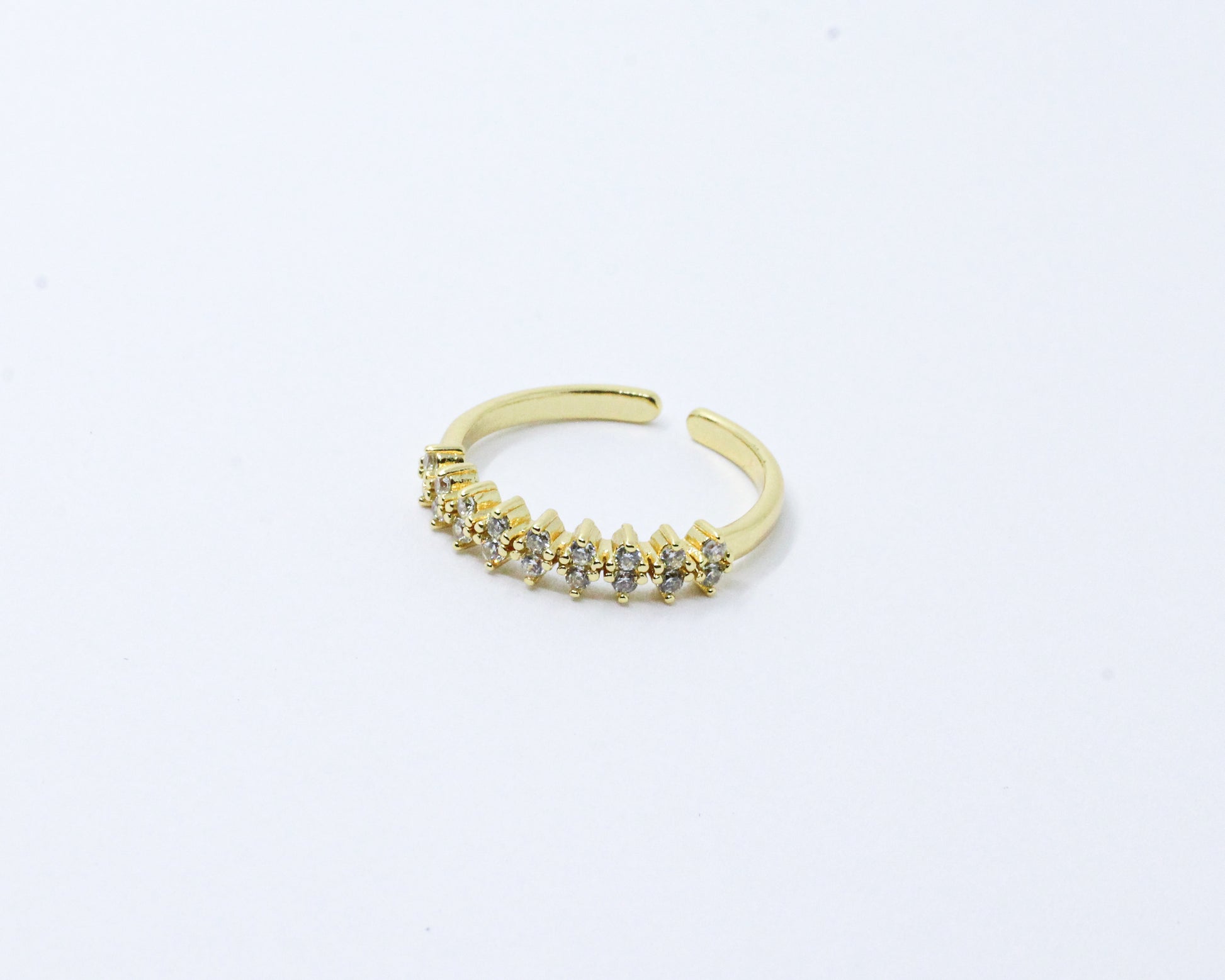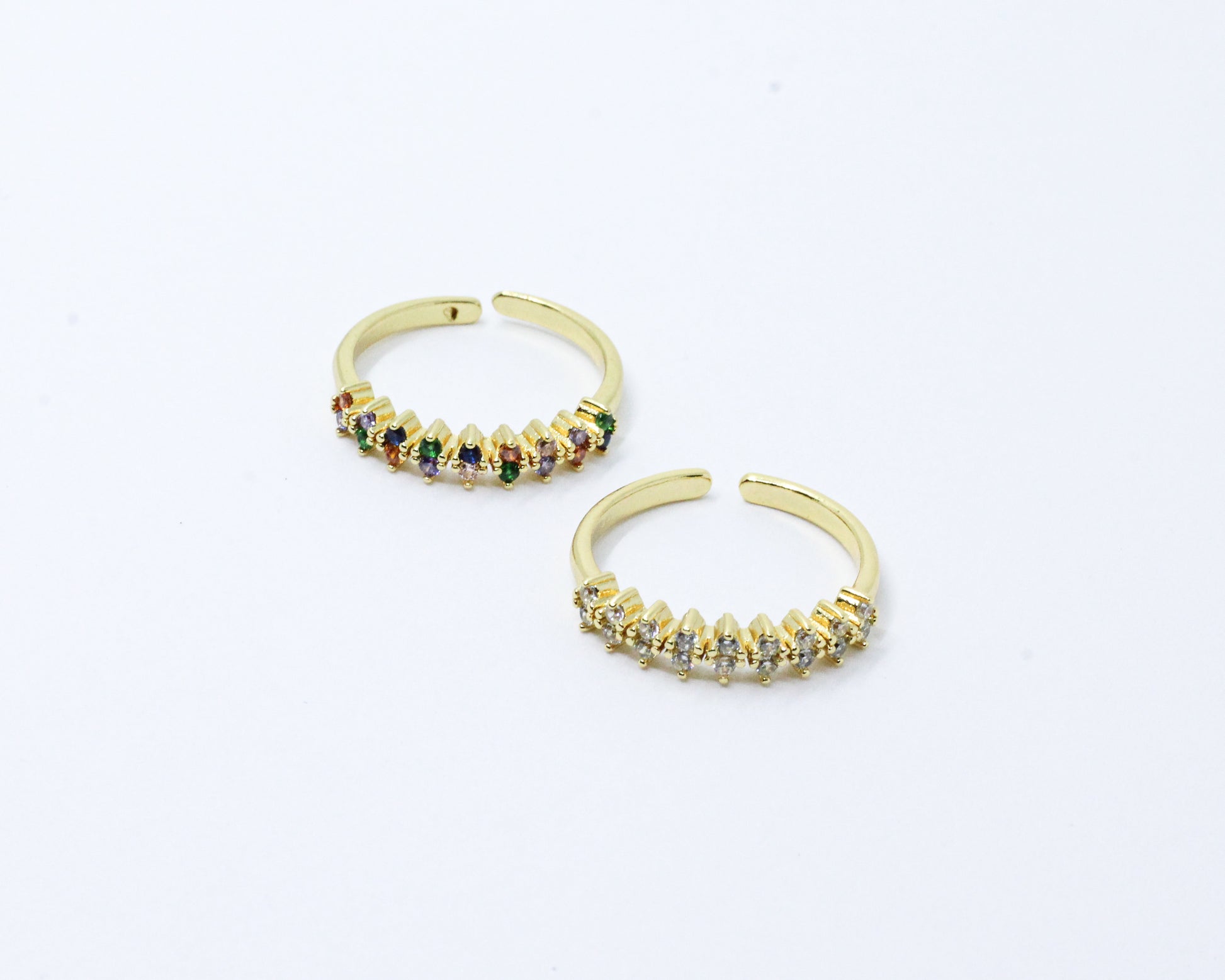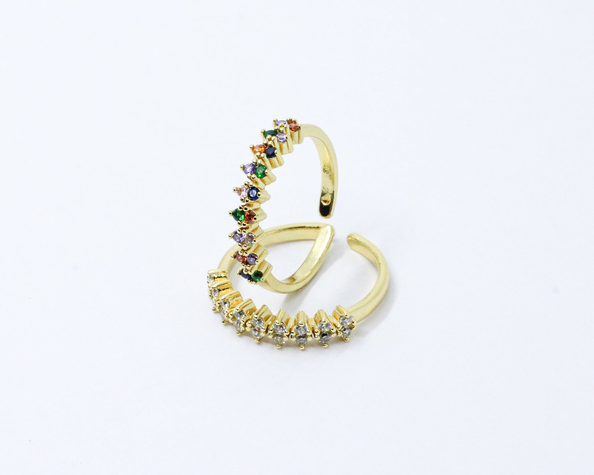 Un anillo graduable en talla, disponible con secuencia de circones blancos o multicolor, (según elección), creando un efecto armonioso y alegre. Resalta tu estilo y añade un toque de brillo a tu atuendo con este increíble accesorio.