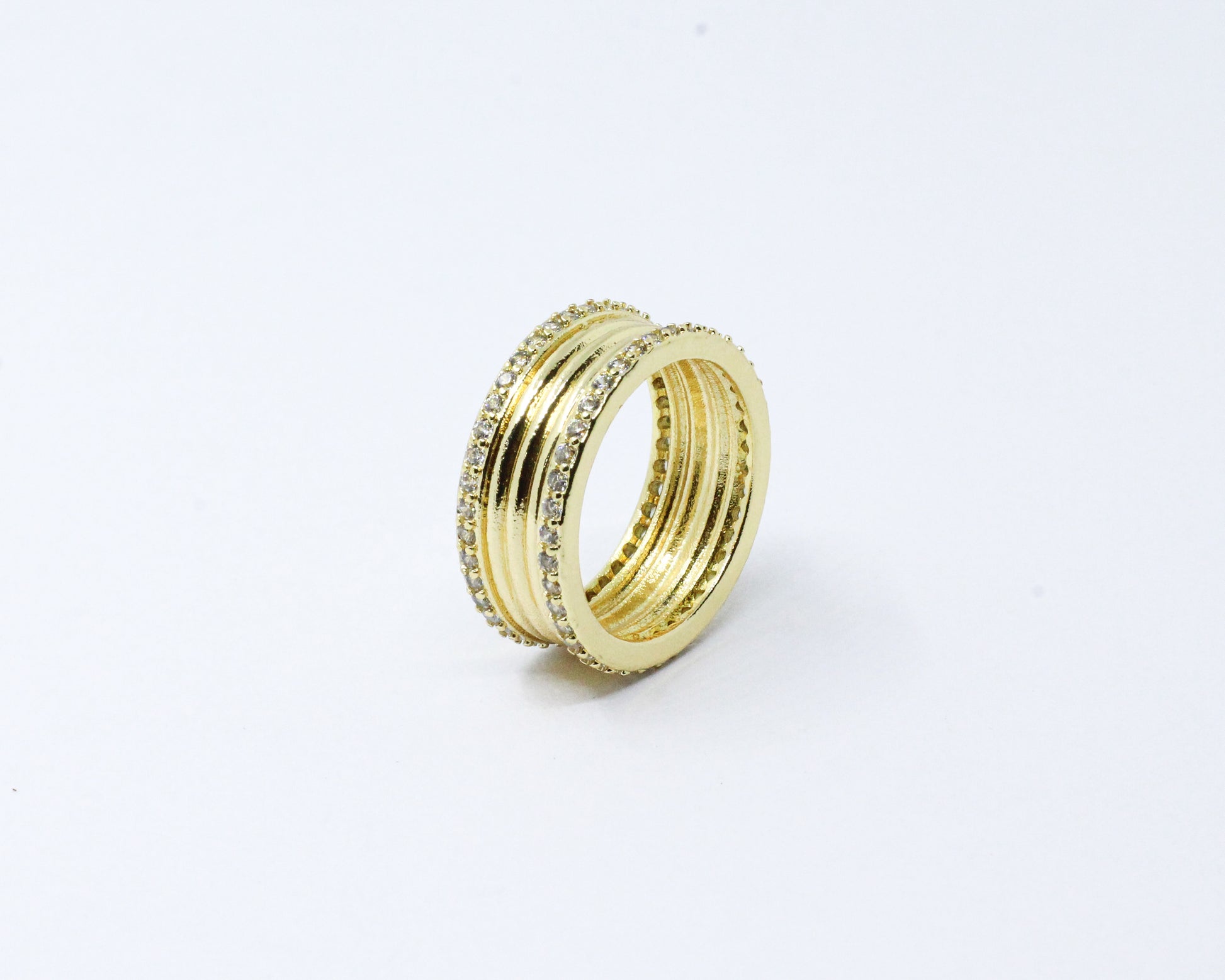 Un anillo talla única en estilo argolla con lineas definidas, bordes con microcircones que aportan un brillo único y trazan un destello sutil. Este anillo es una muestra de elegancia y estilo.