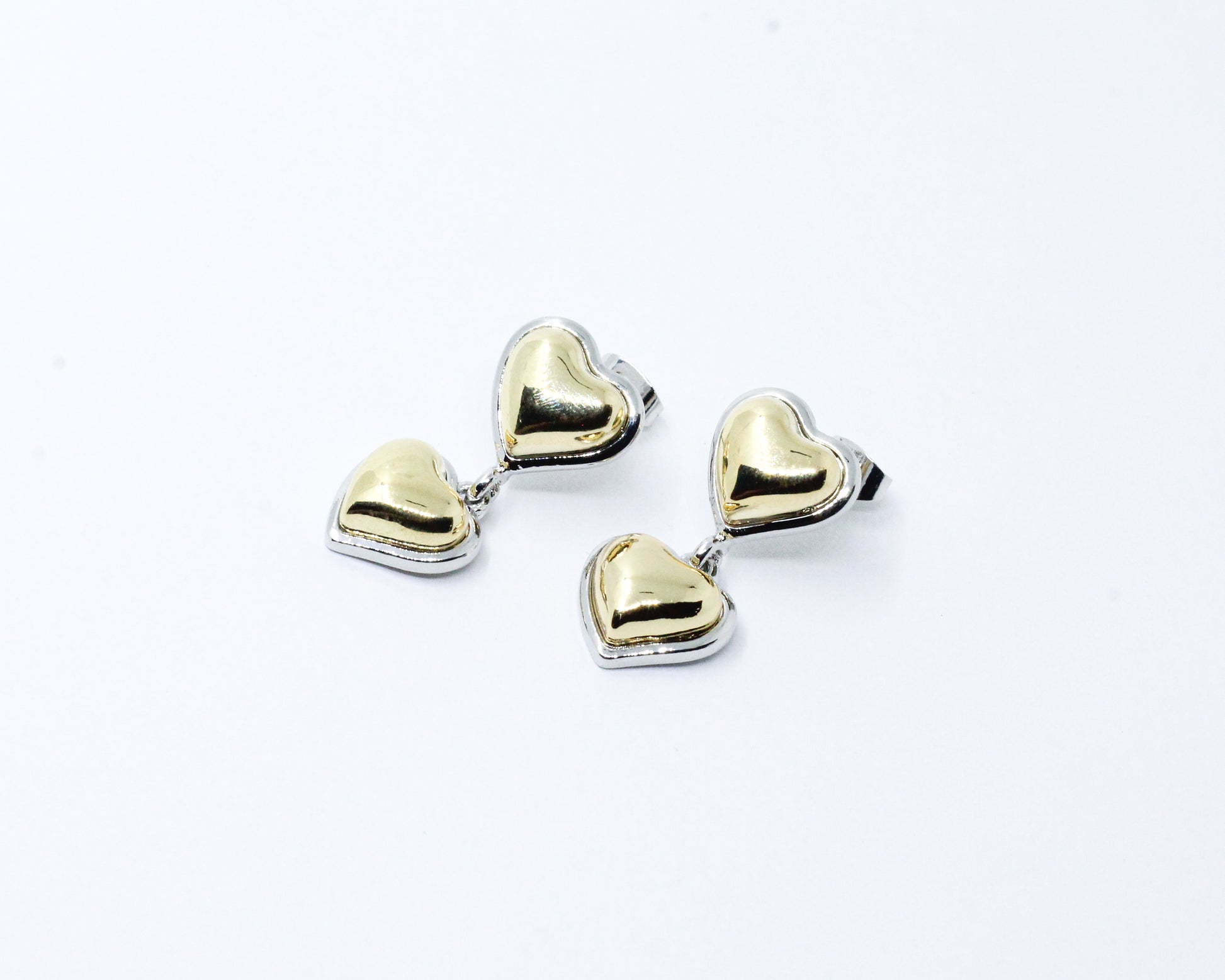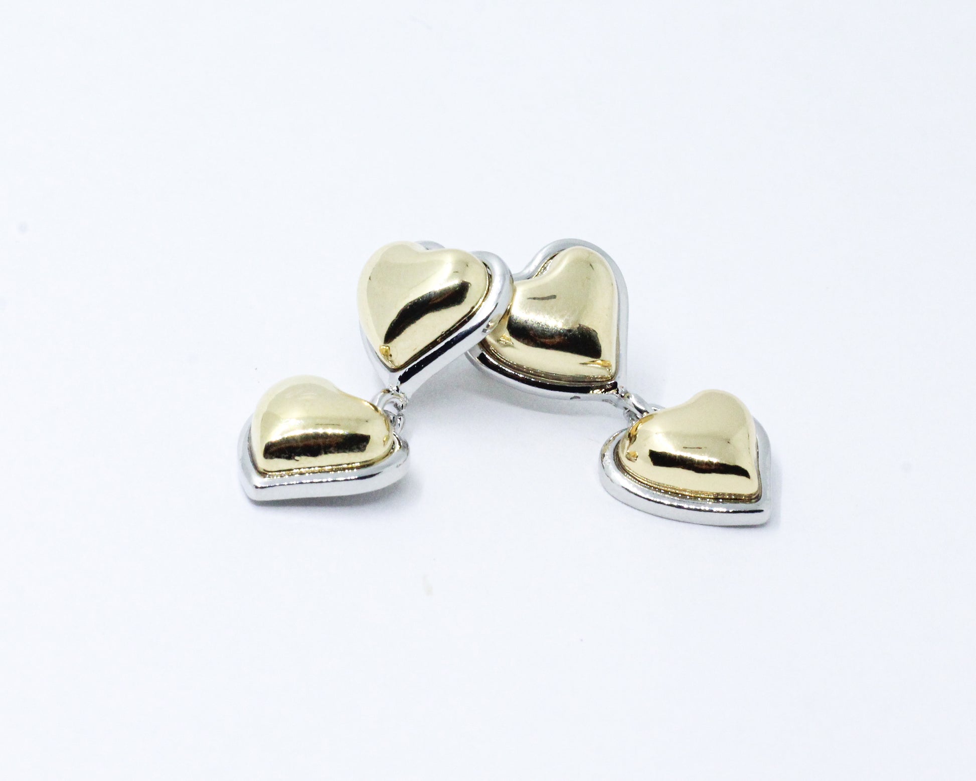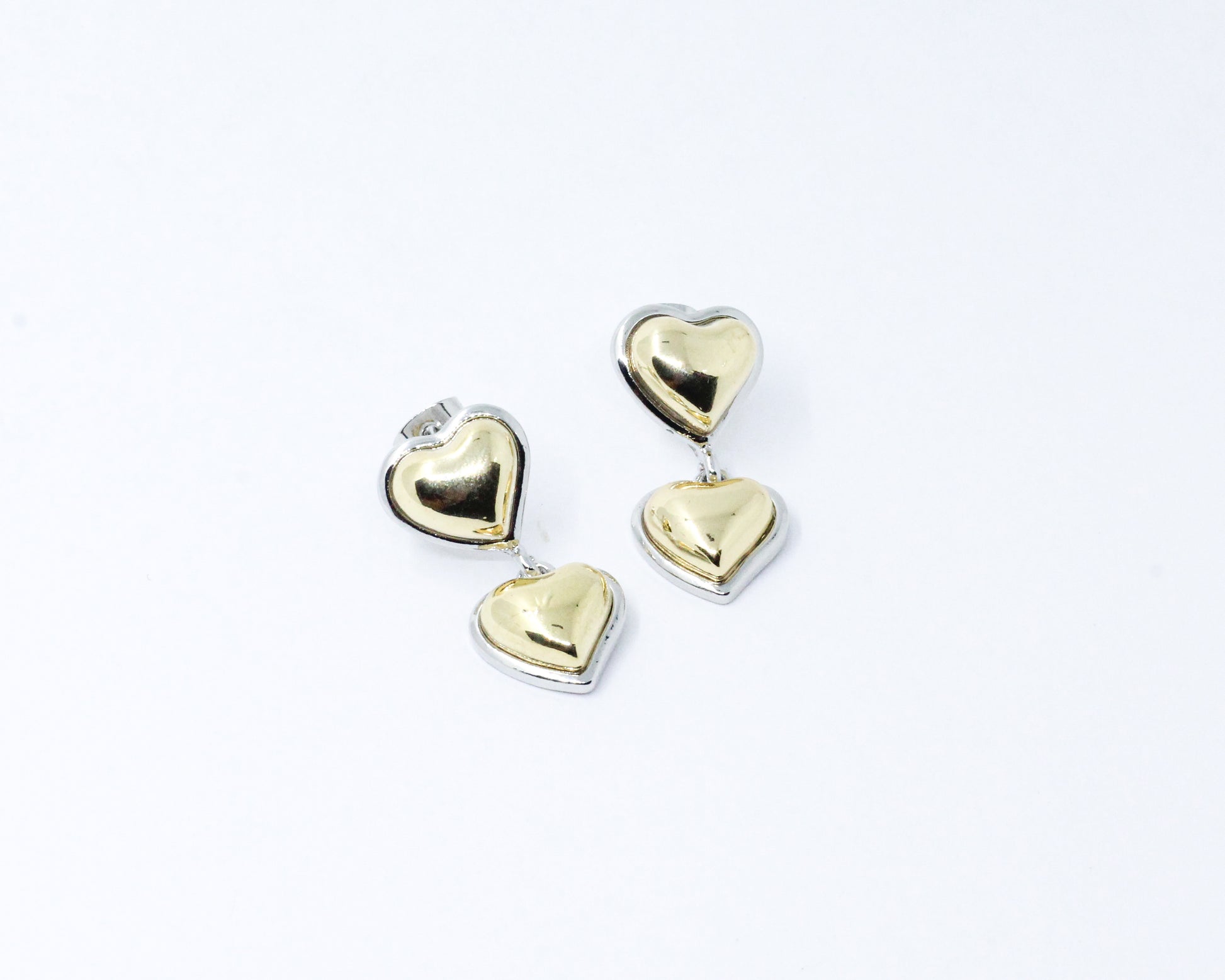 Un par de aretes en forma de doble corazón articulado, con una silueta suavemente abombada y una tonalidad bicolor que aporta dinamismo visual y originalidad al diseño. ¡Haz que tus ojos brillen con estos aretes de doble corazón que representan el amor y la pasión en su máxima expresión!