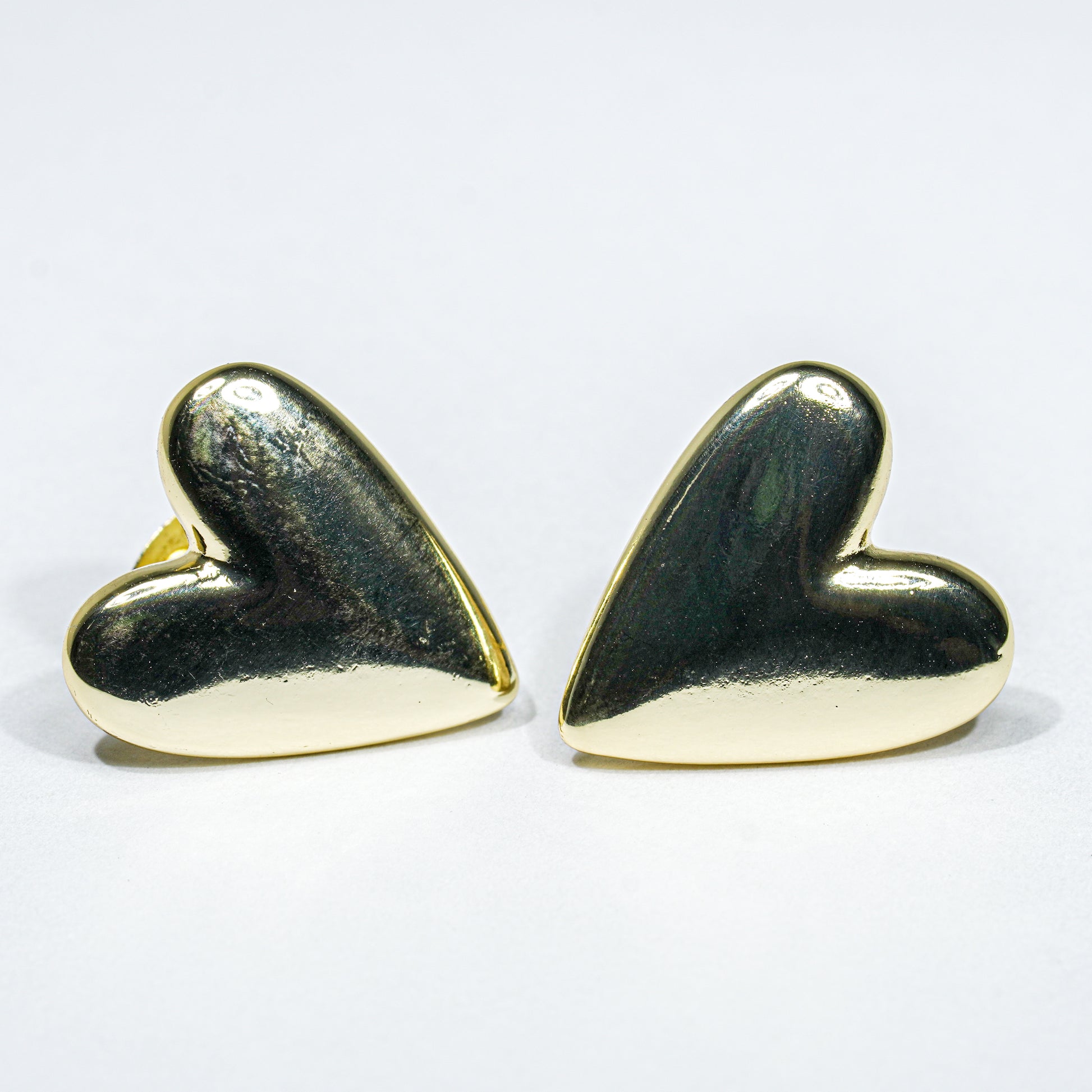 Un par de aretes en forma de corazón con acabados redondeados y una textura lisa y brillante. Un diseño delicado que resalta por su suavidad y luminosidad sutil.