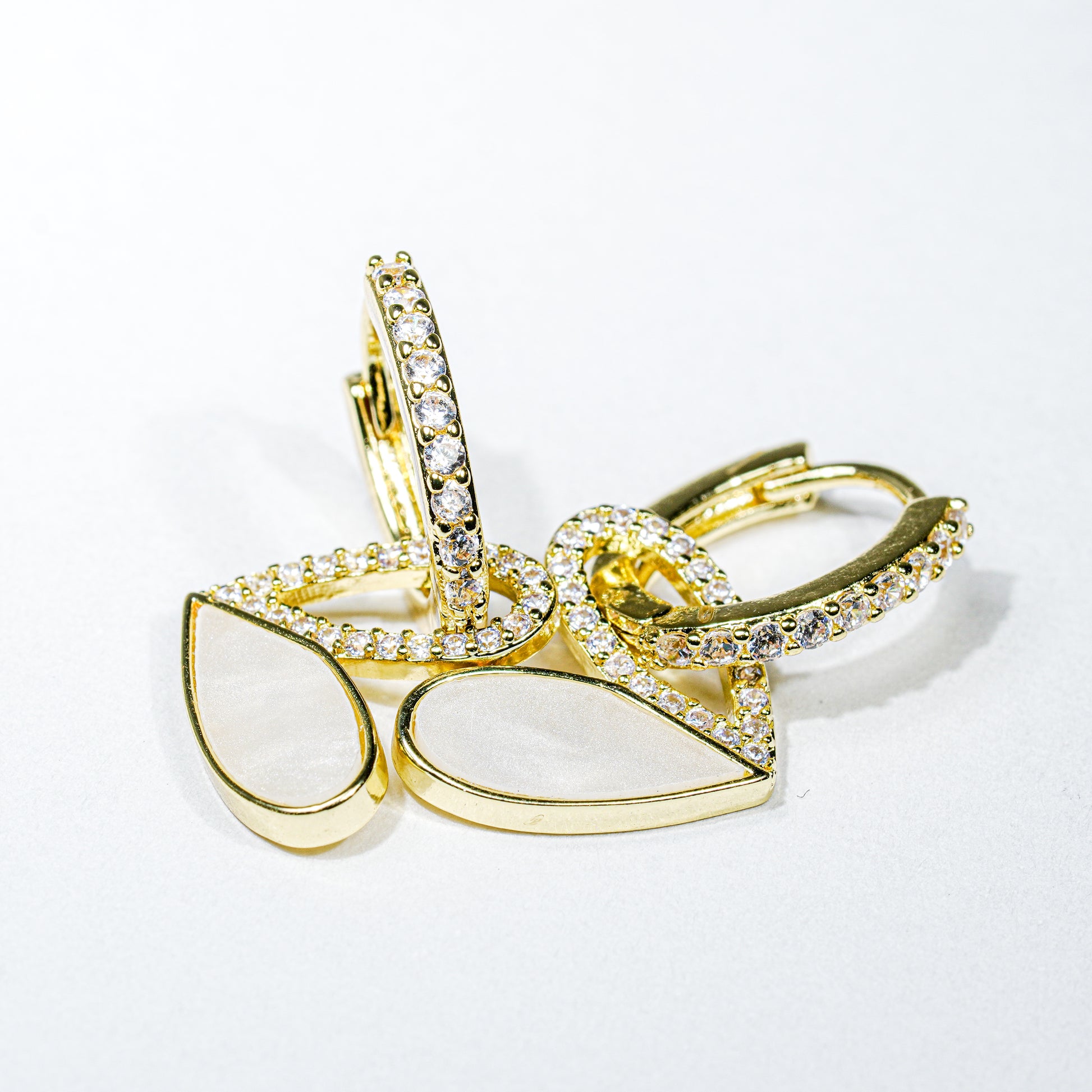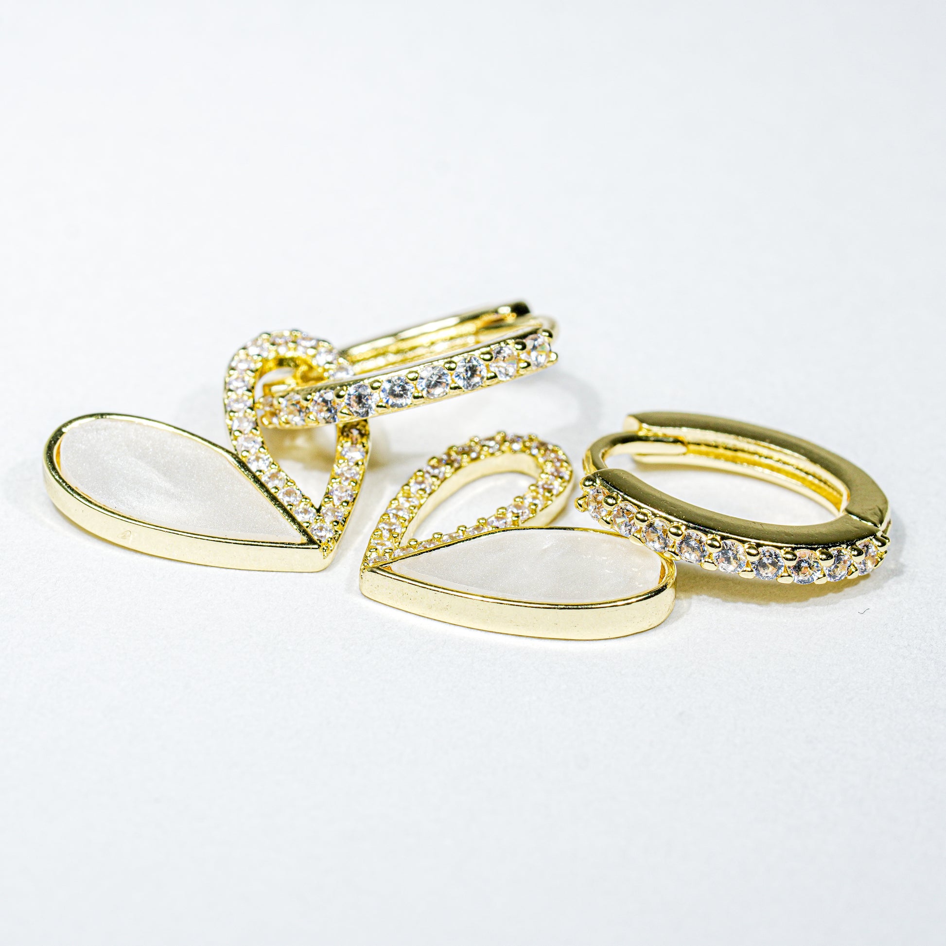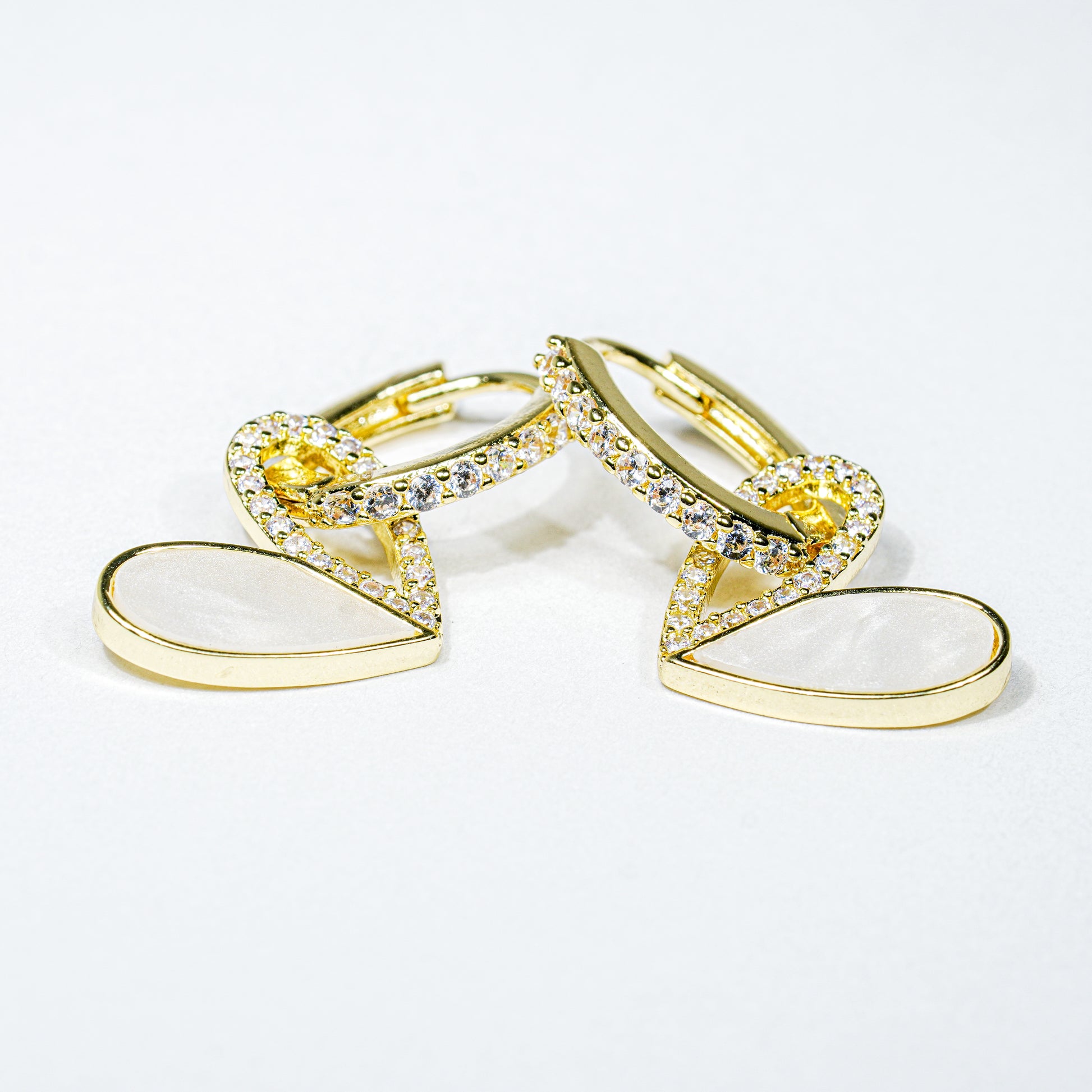 Un par de aretes en forma de aro, engastados con microcircones, con un colgante en forma de corazón. Un lado del corazón presenta un acabado en nácar, mientras que el otro lado se destaca con una silueta adornada con microcircones. Un diseño que combina suavidad y brillo en perfecta armonía.