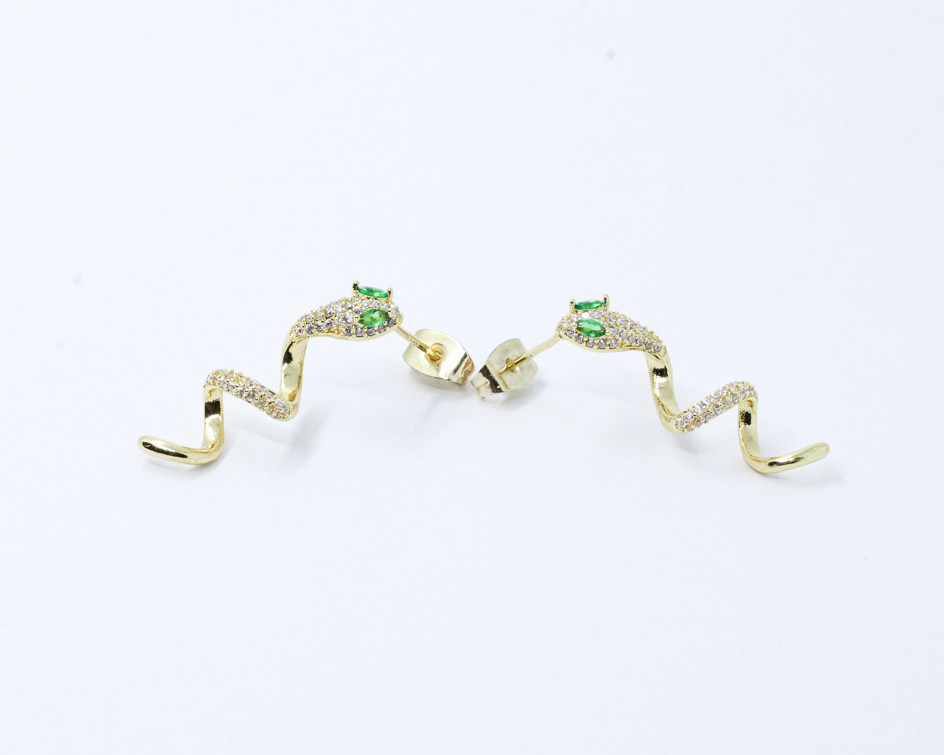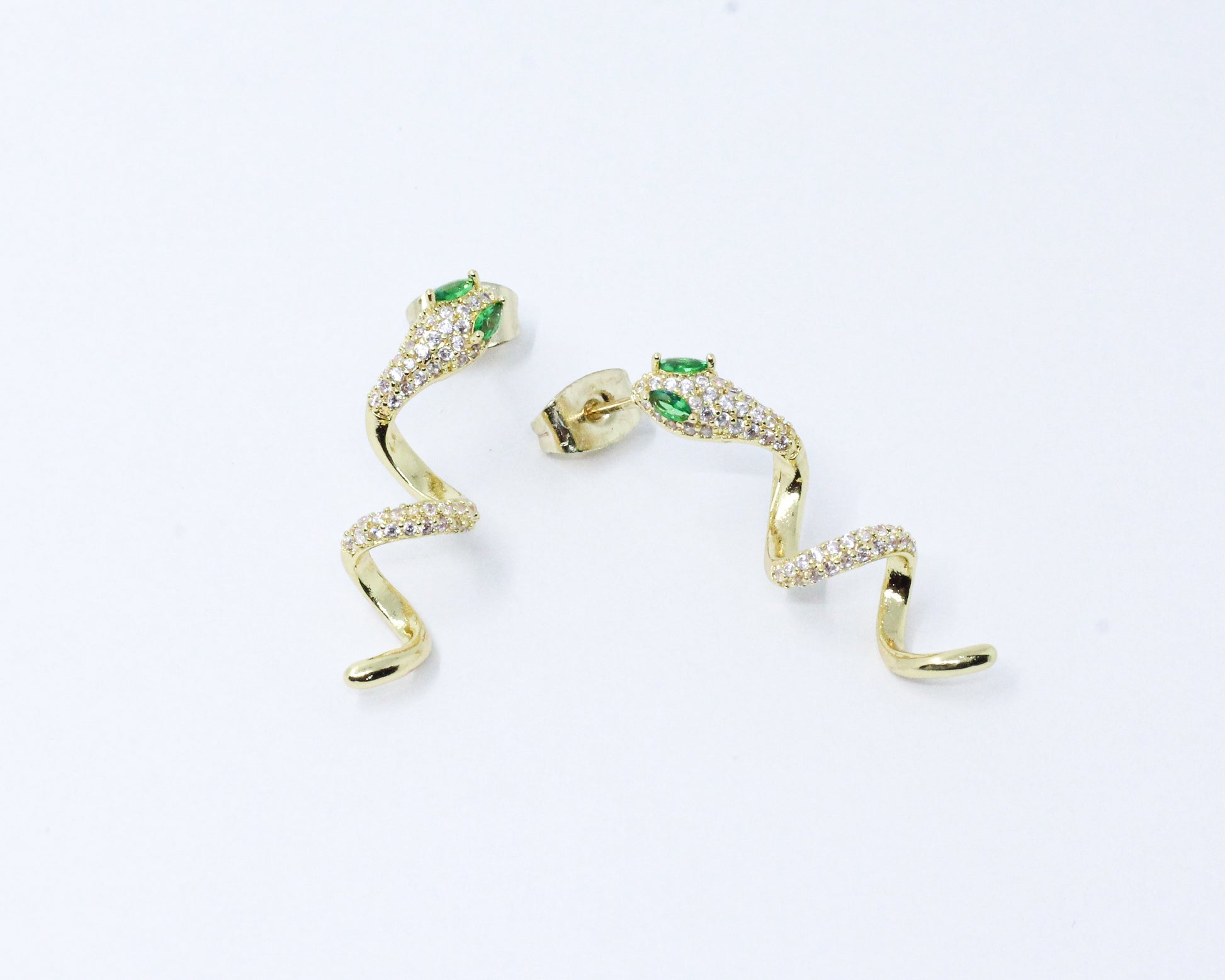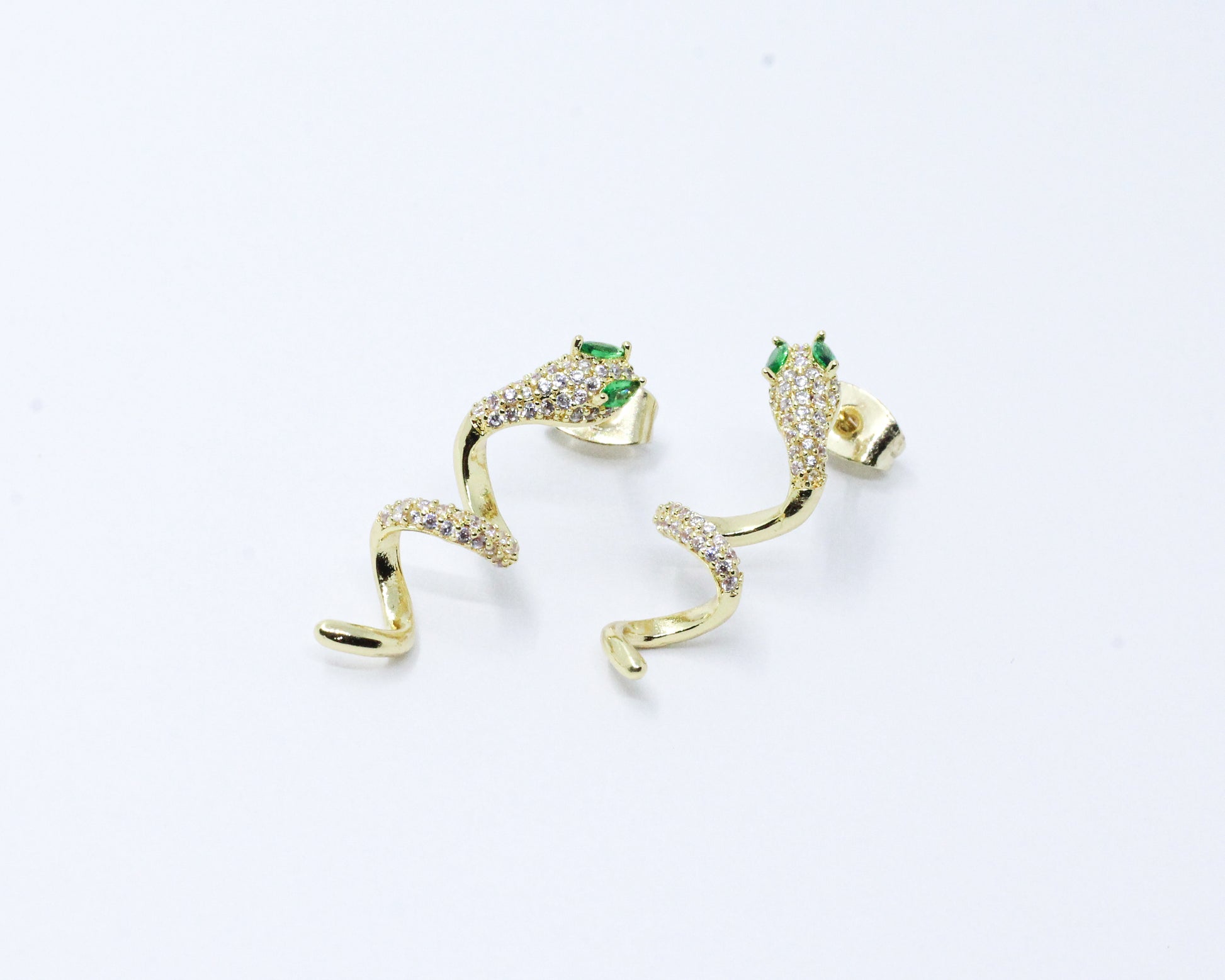 Un par de aretes dorados en forma de serpiente, con ojos de circones verdes y microcircones que recorren el resto de su silueta. Su diseño en espiral se adapta armoniosamente a la forma de la oreja, combinando audacia y elegancia.