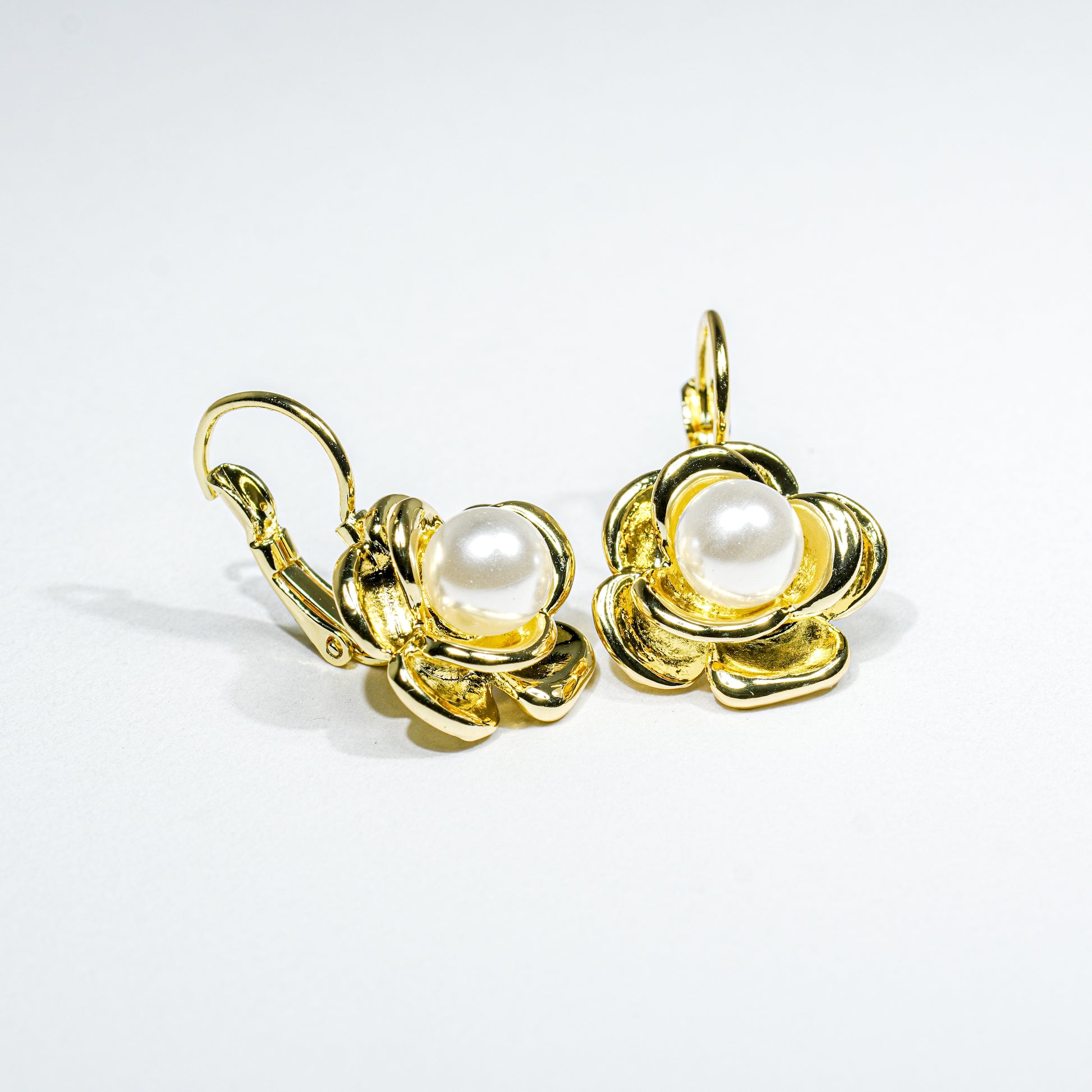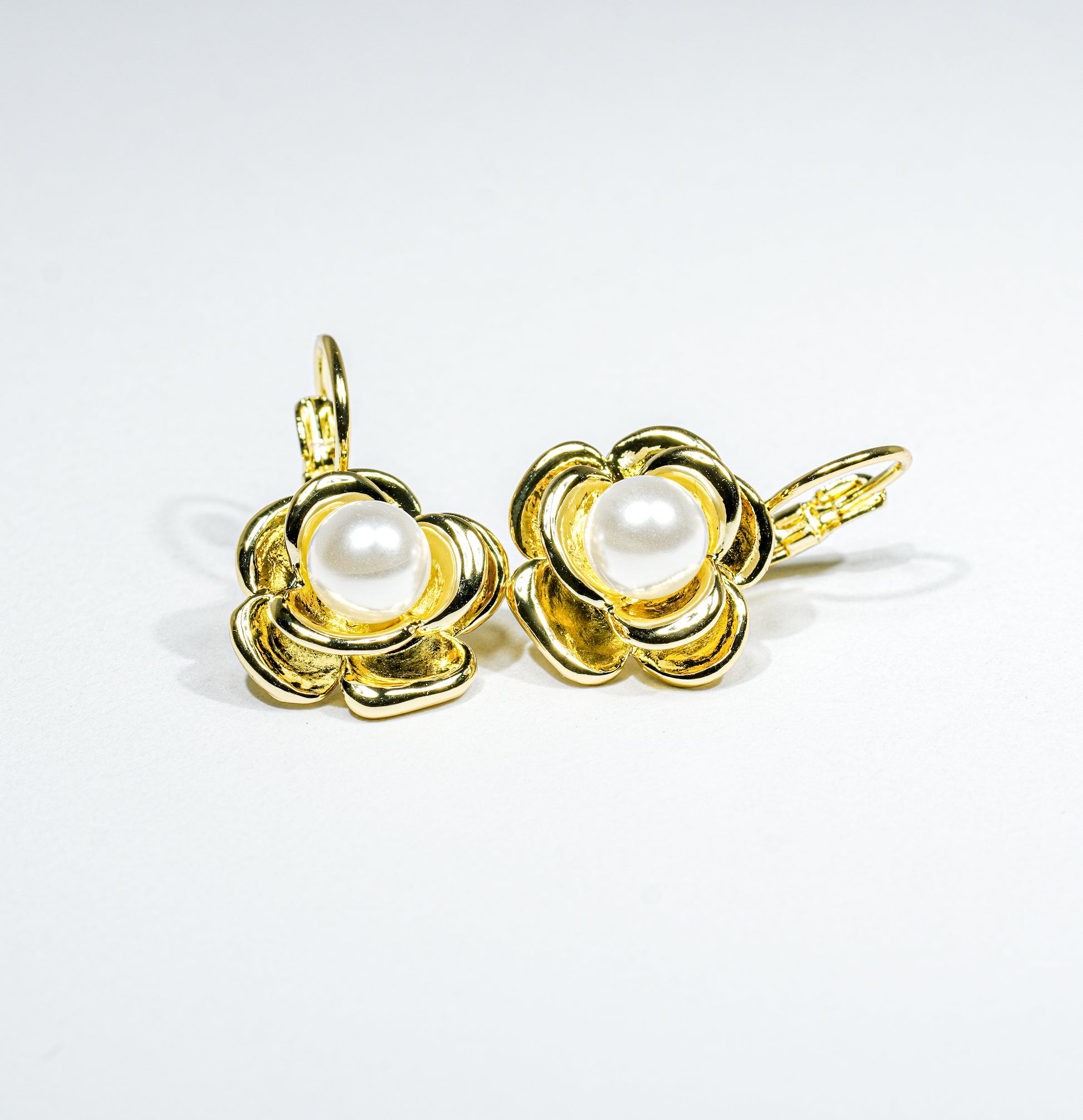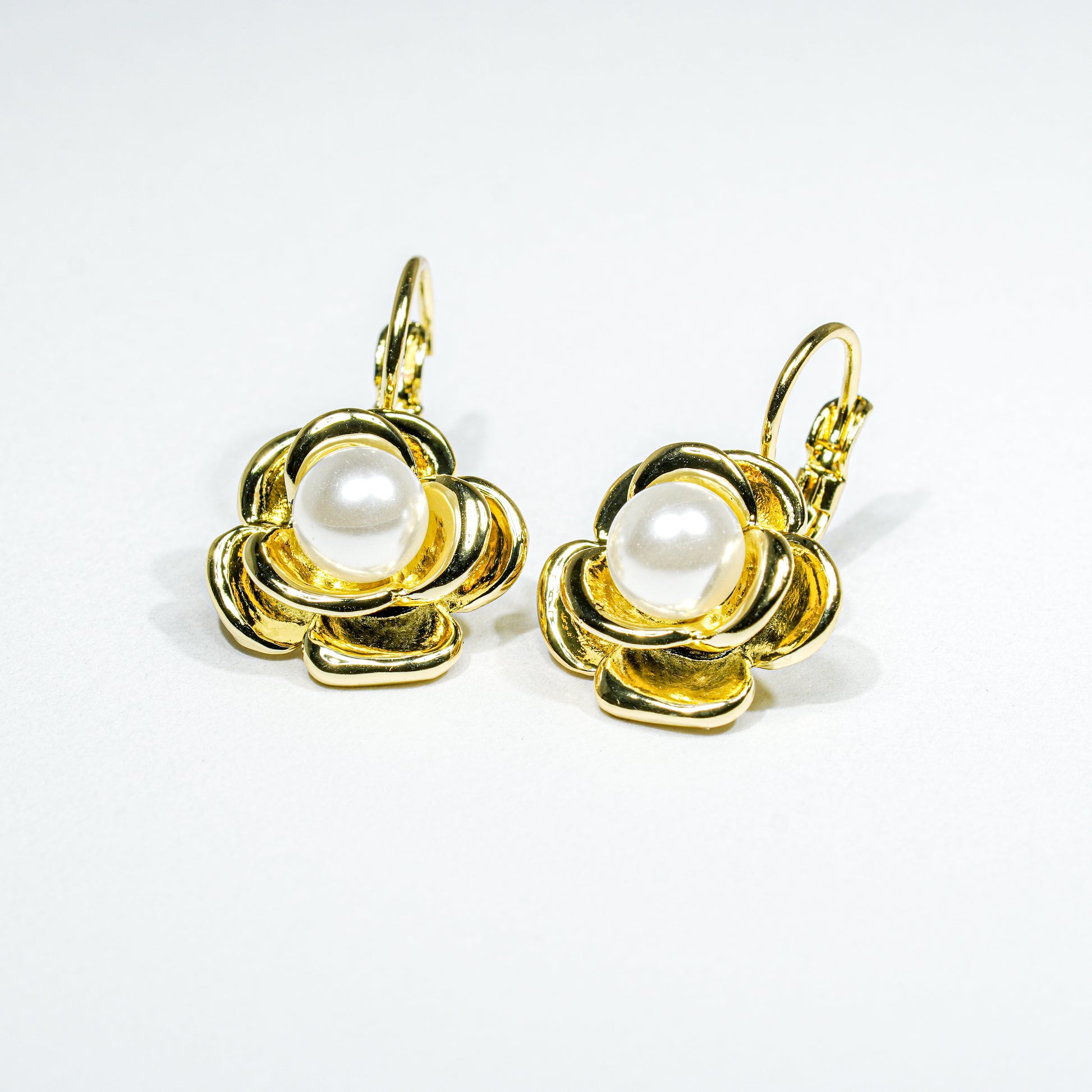 Un par de aretes tipo gancho con diseño de flor doble en relieve, de bordes redondeados y una perla delicadamente ubicada en el centro. Una pieza que resalta por su feminidad, suavidad y encanto natural.
