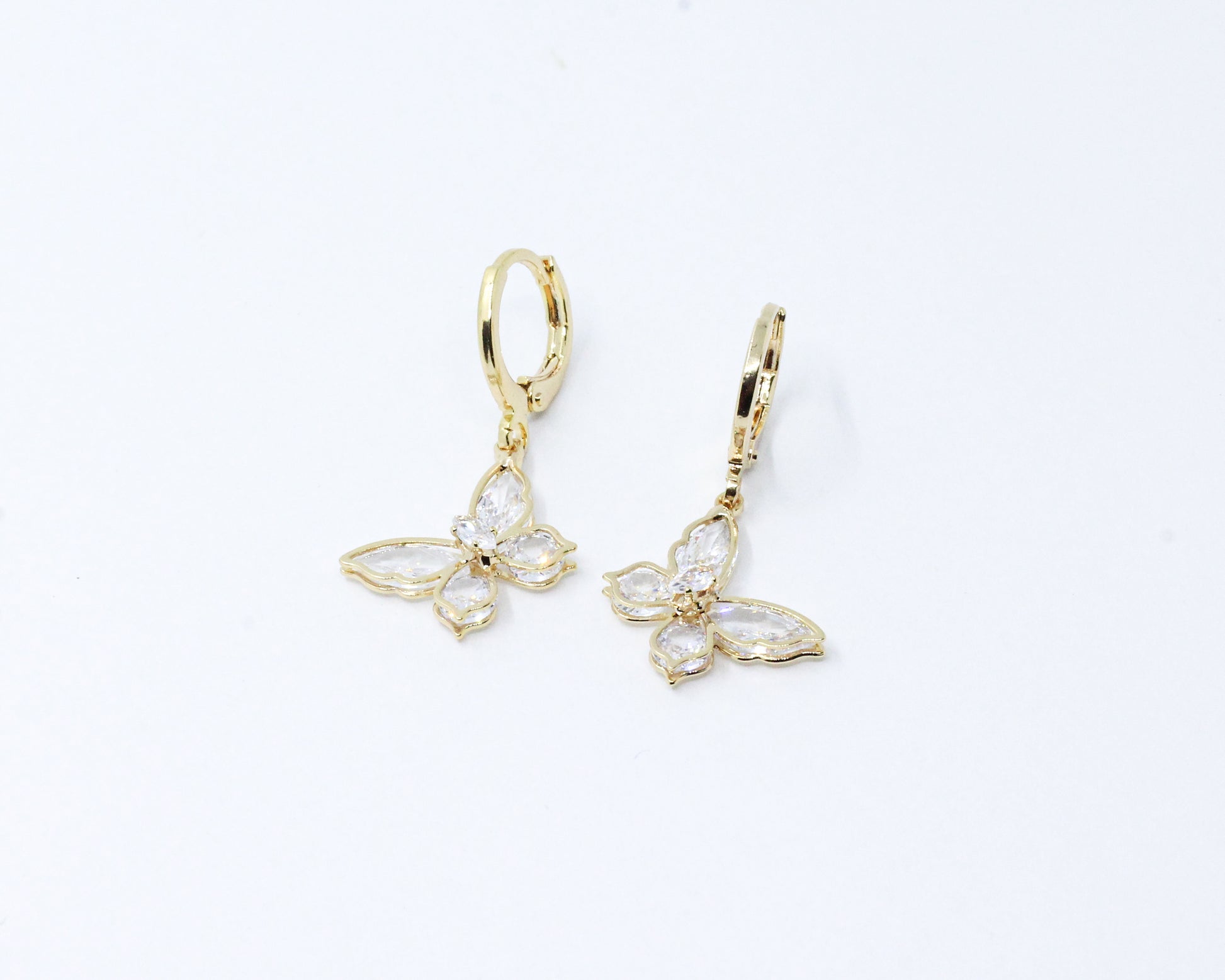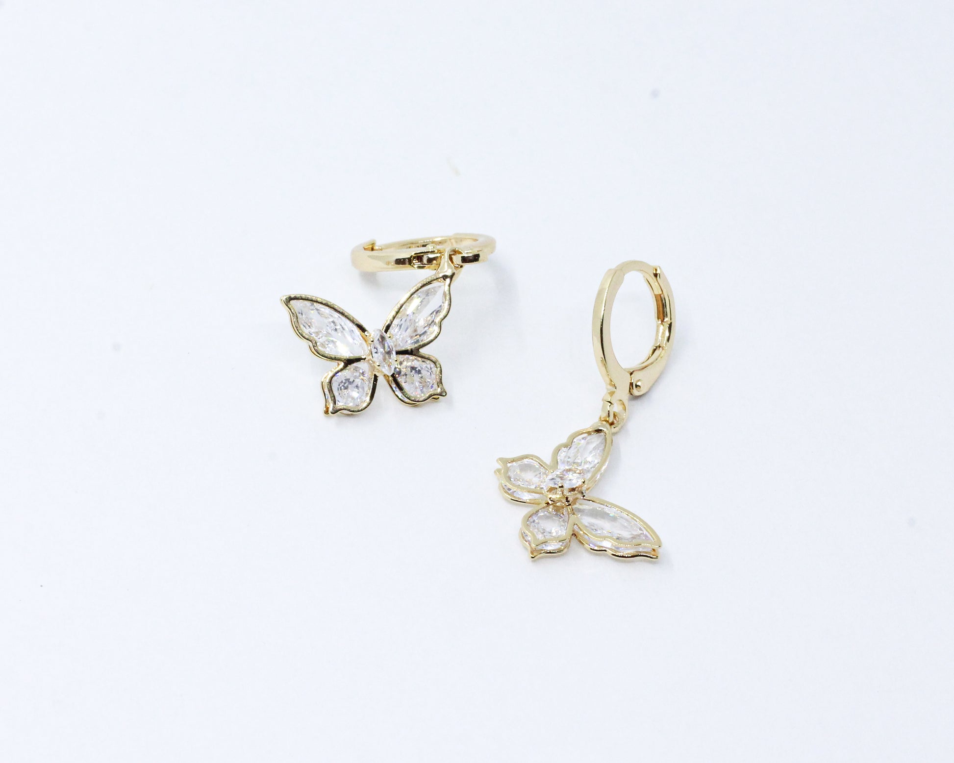 Un par de aretes dorados en forma de mariposa, estilo baguette, con circones en cada uno de sus extremos. Su estructura ligera y su brillo aportan sutileza al diseño. Haz resaltar tu estilo con estas mariposas brillantes.