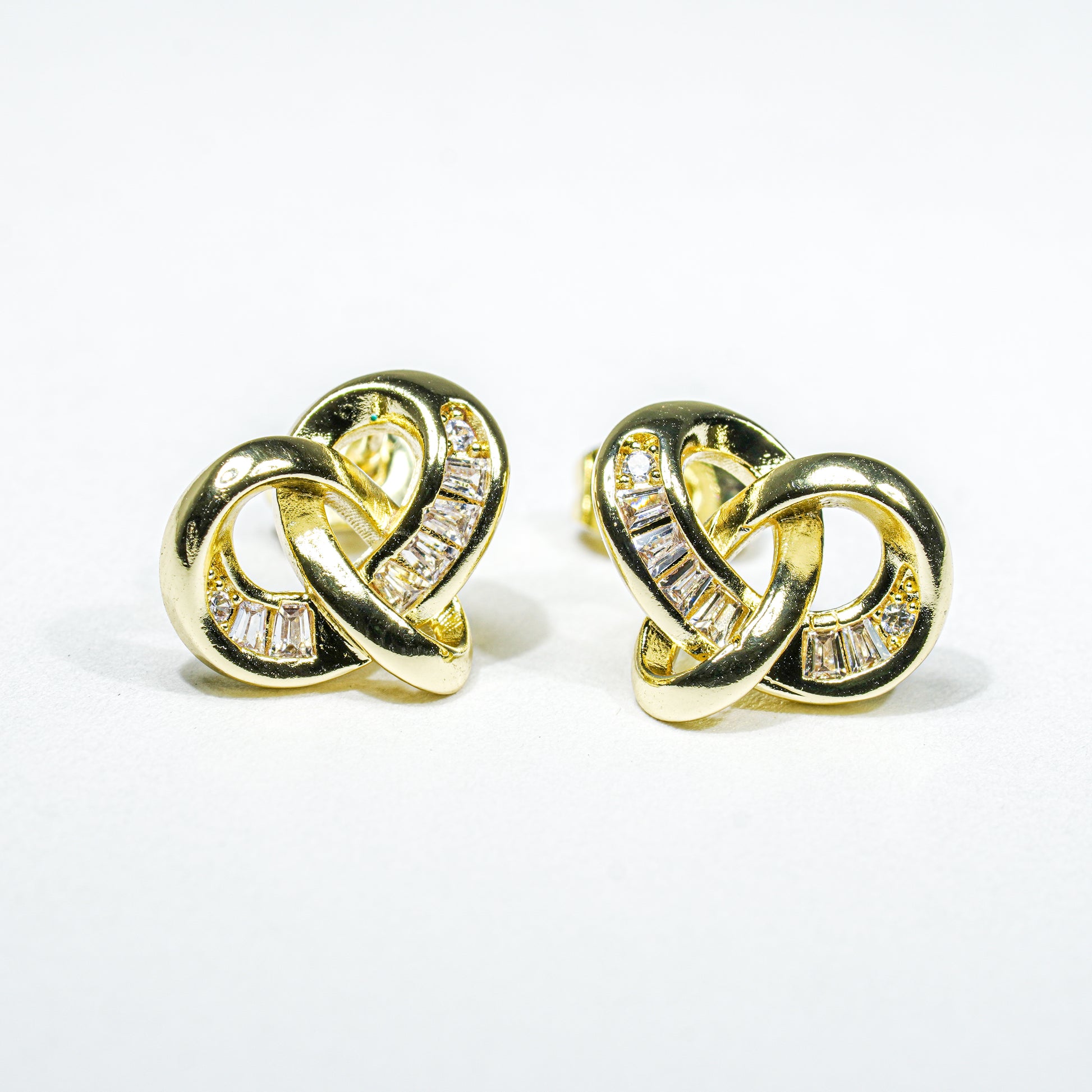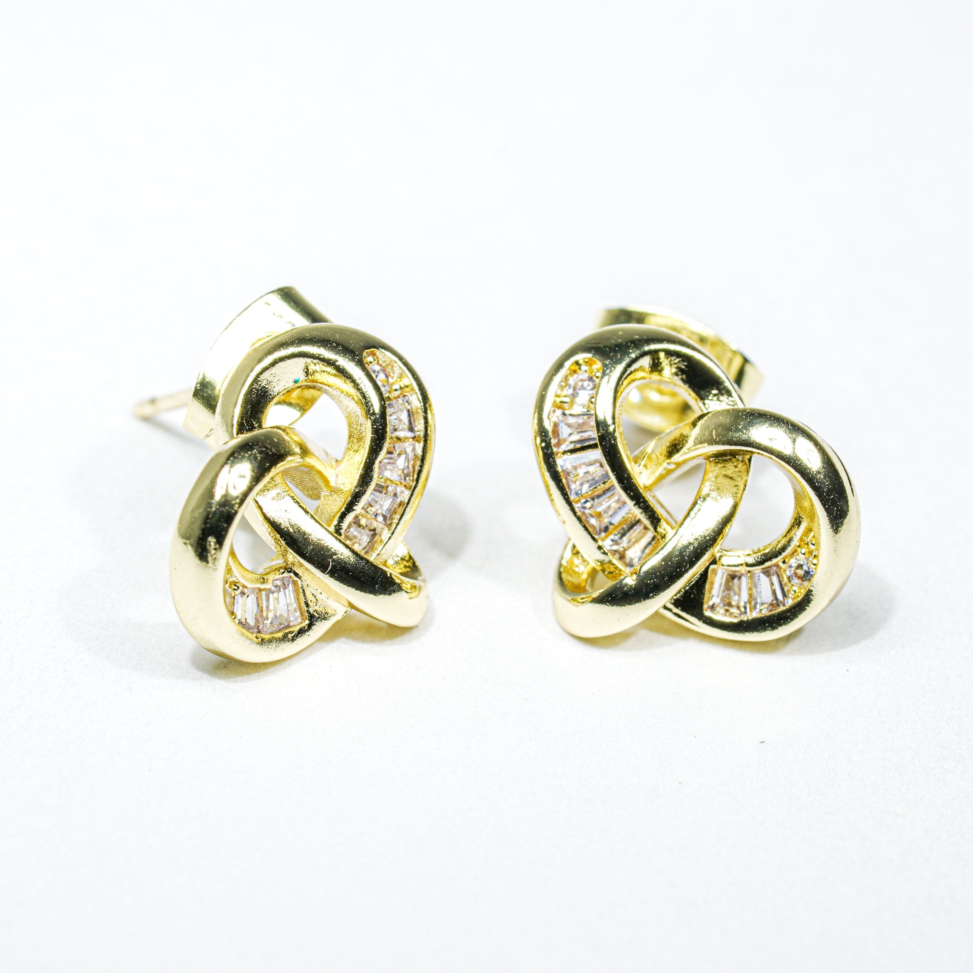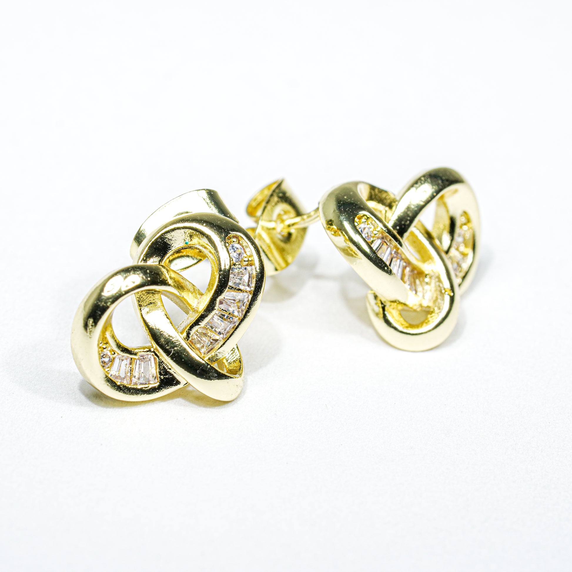 Un par de aretes en forma de nudo, con circones estilo baguette en uno de sus bordes y una línea opuesta completamente lisa pero brillante. Un diseño que mezcla la sofisticación de los circones con la sencillez del acabado pulido.