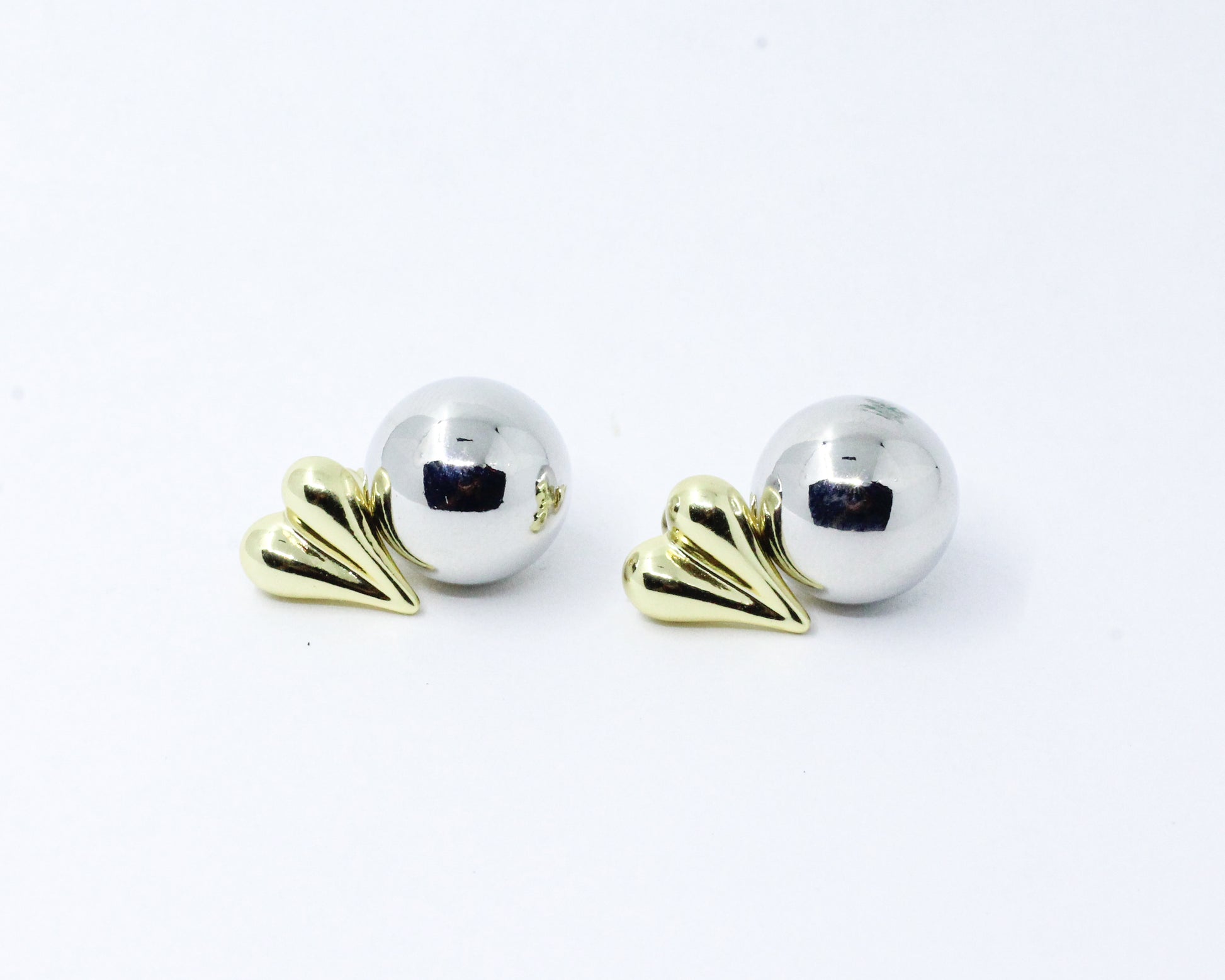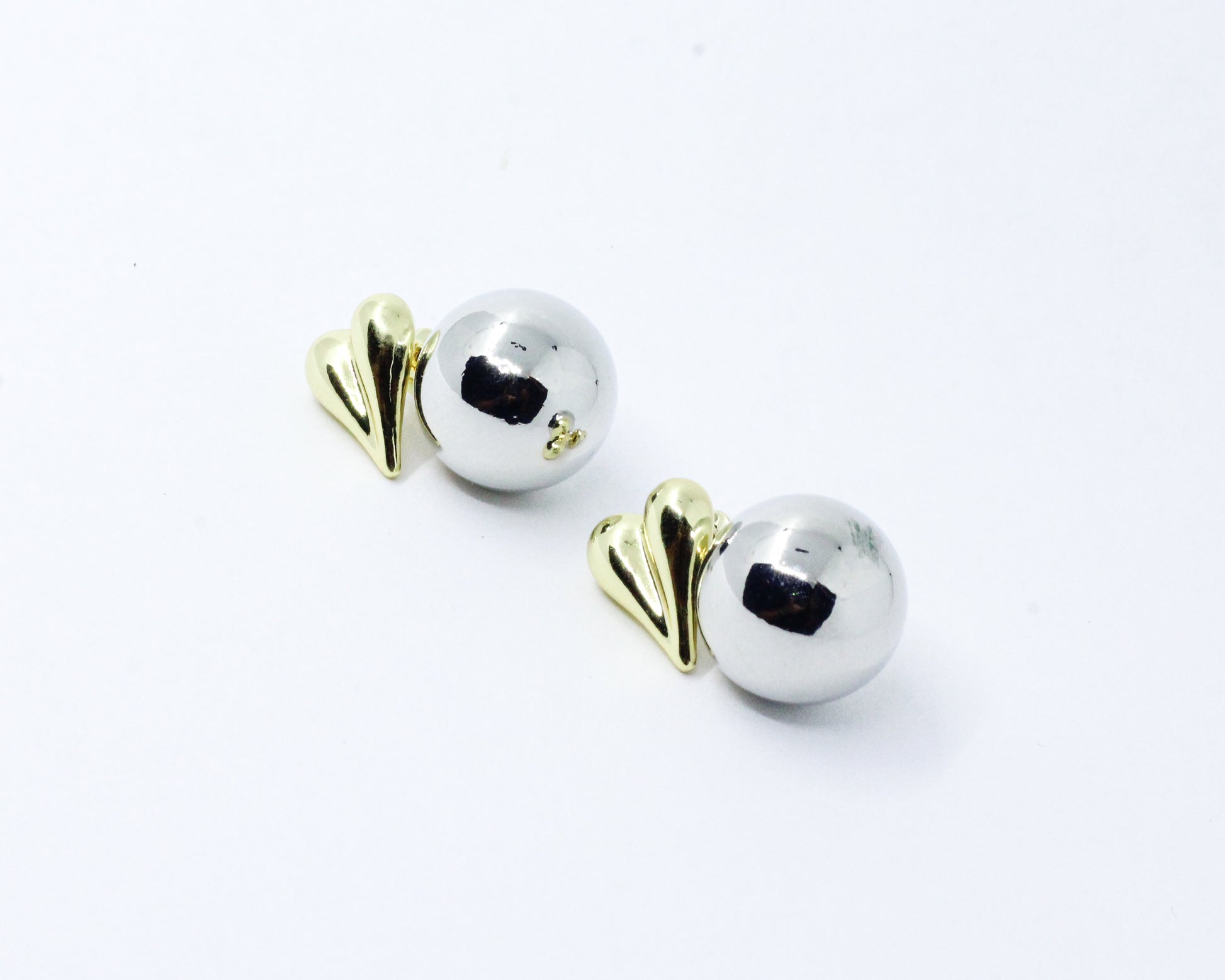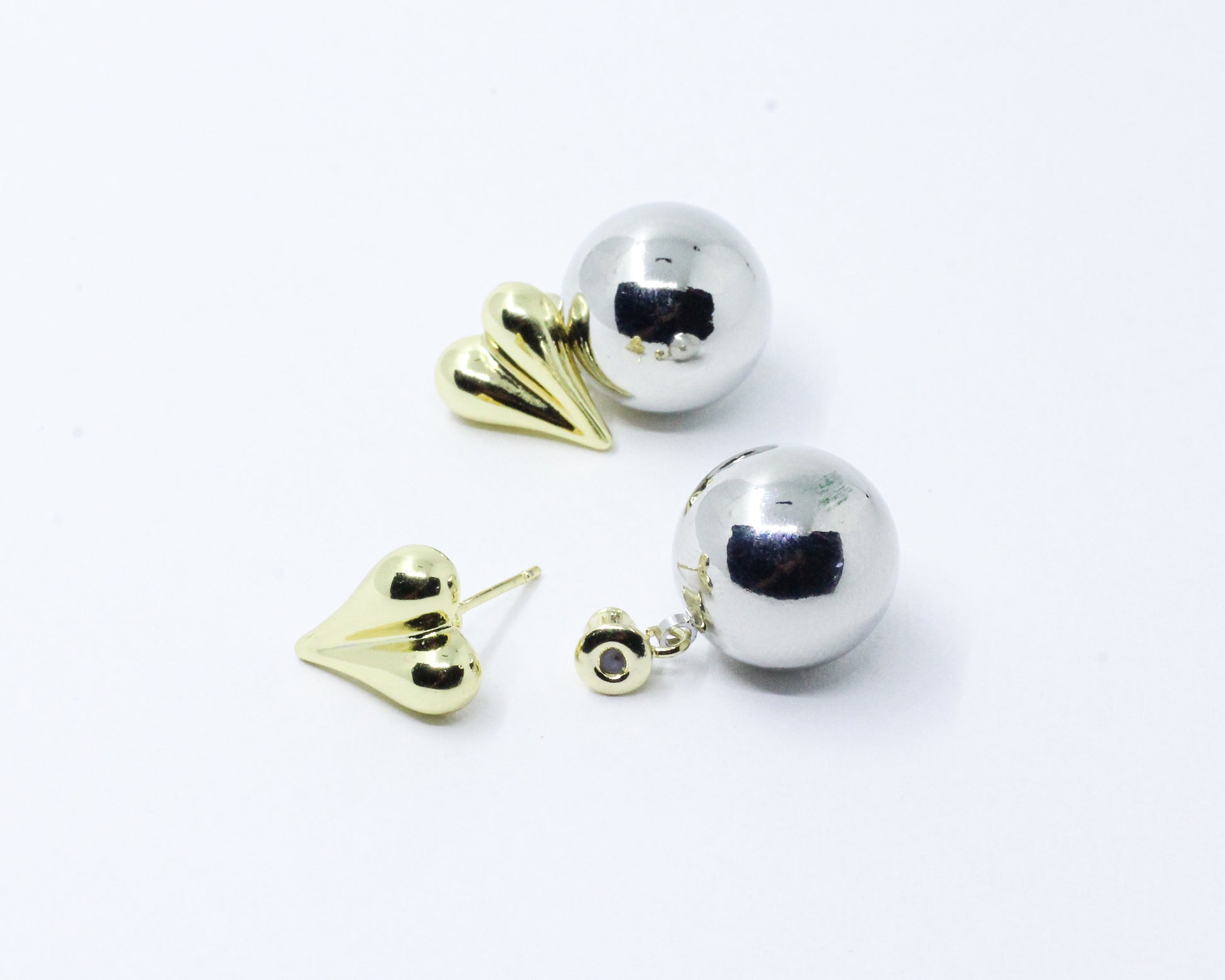 Un par de aretes con una esfera metálica pulida en tono plateado, acompañada de un corazón estilizado de líneas suaves y bordes definidos que evocan un destello simple y elegante.