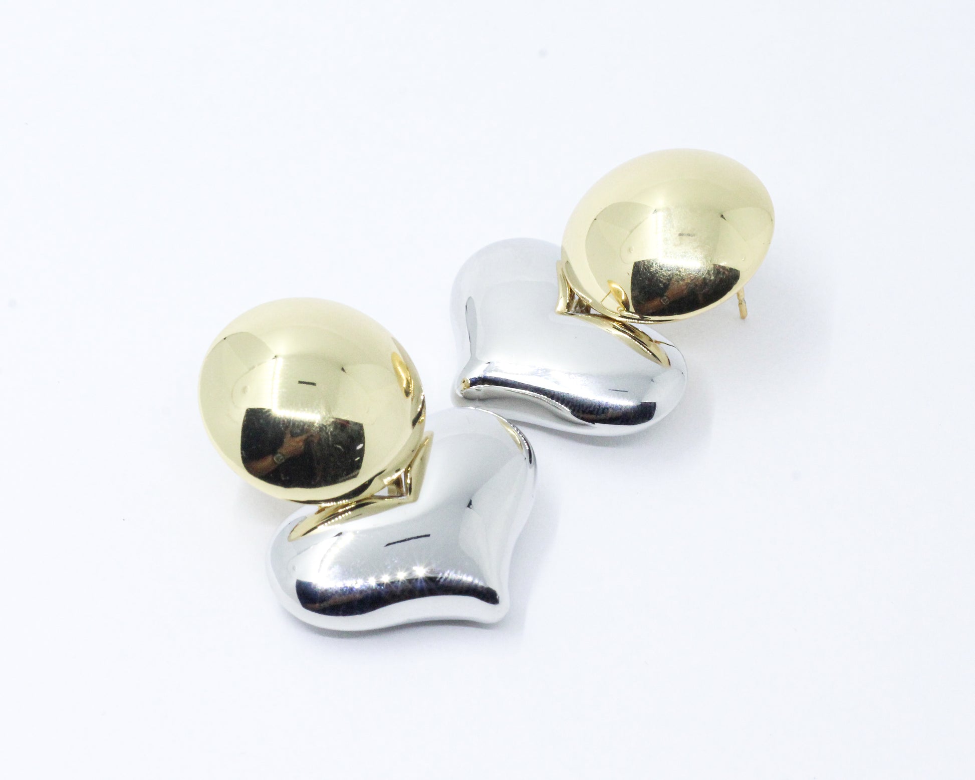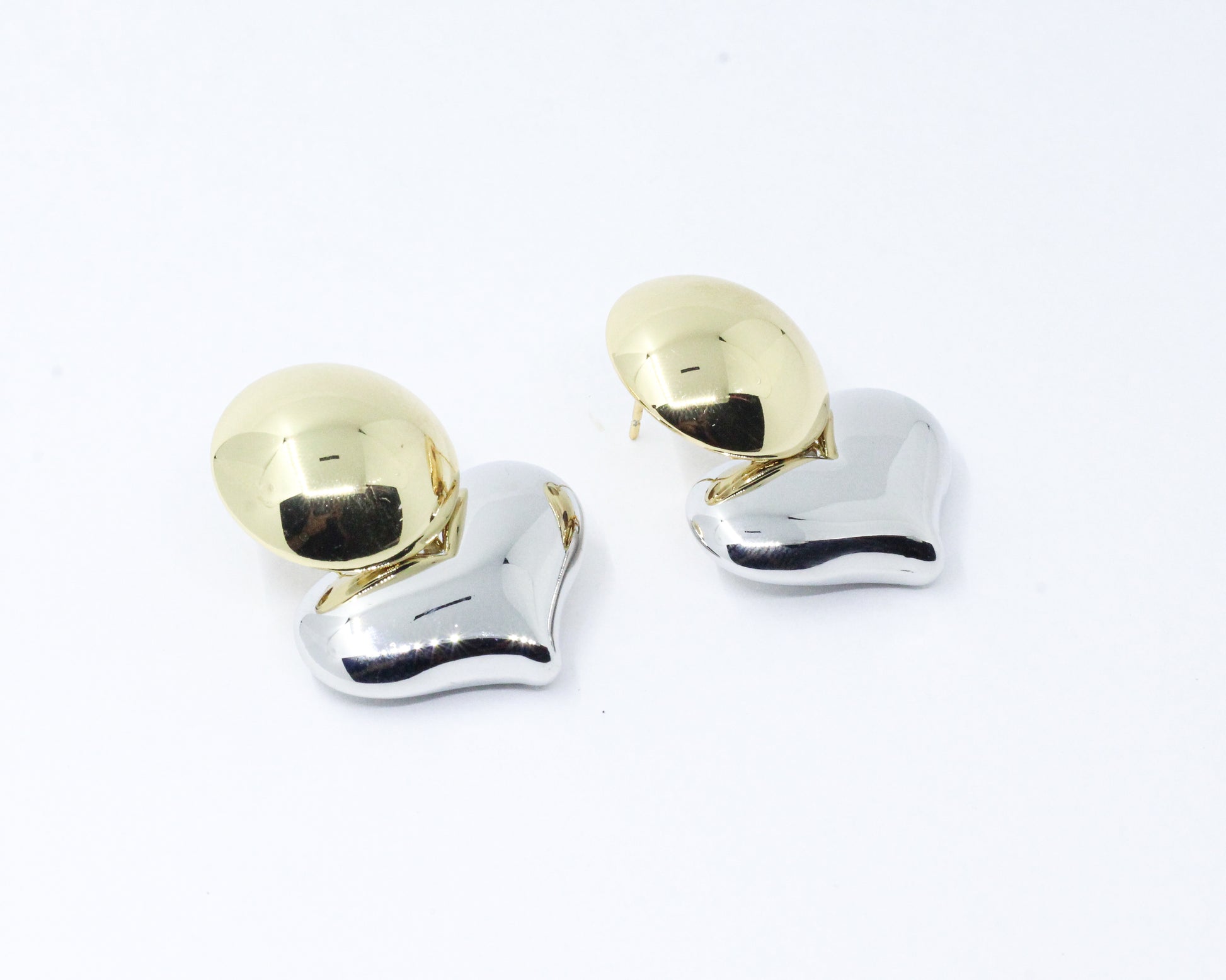 Un par de aretes bicolor con formas suaves y armoniosas: una media esfera dorada en la parte superior que se equilibra con una base plateada en forma de corazón, de contorno envolvente y delicado.