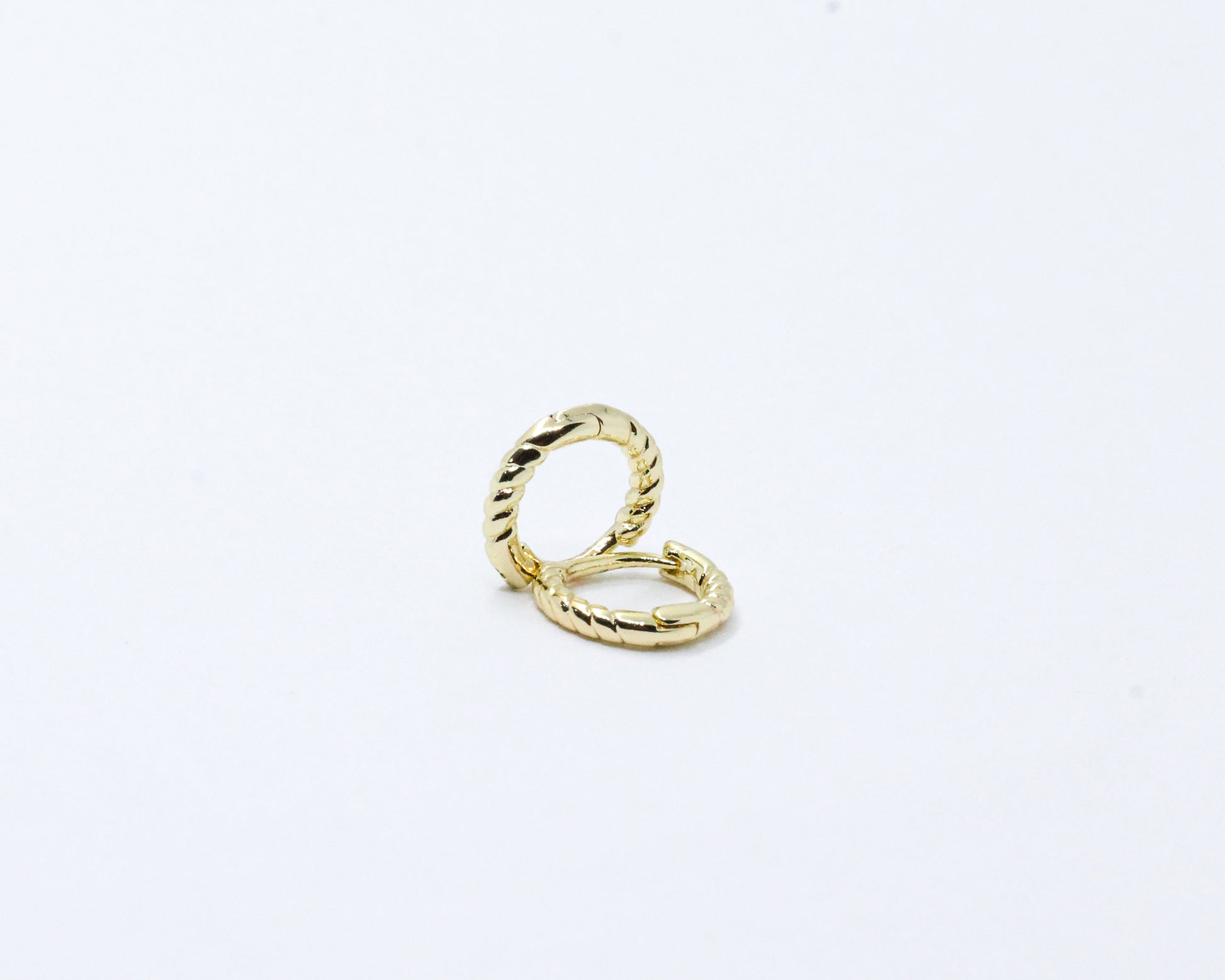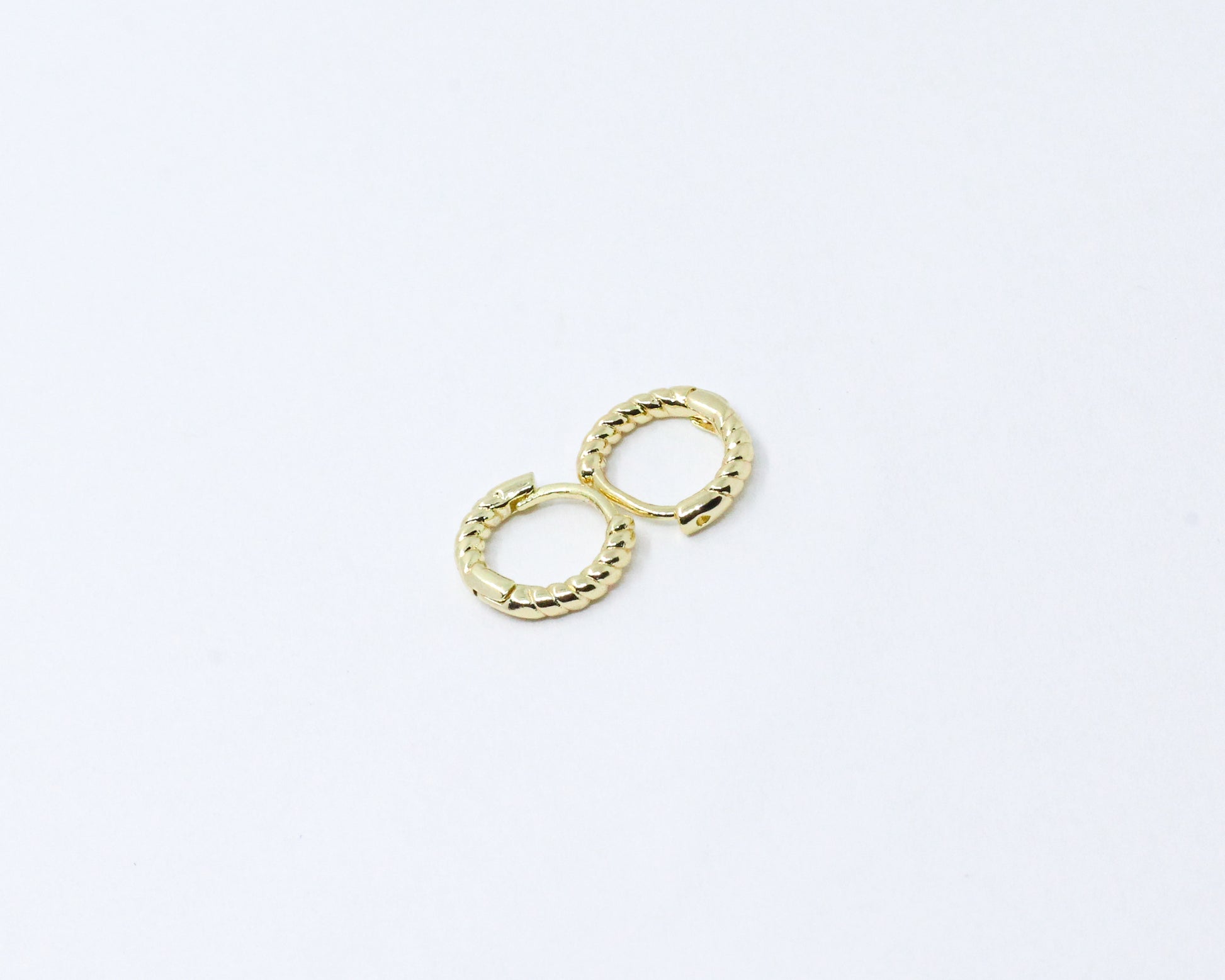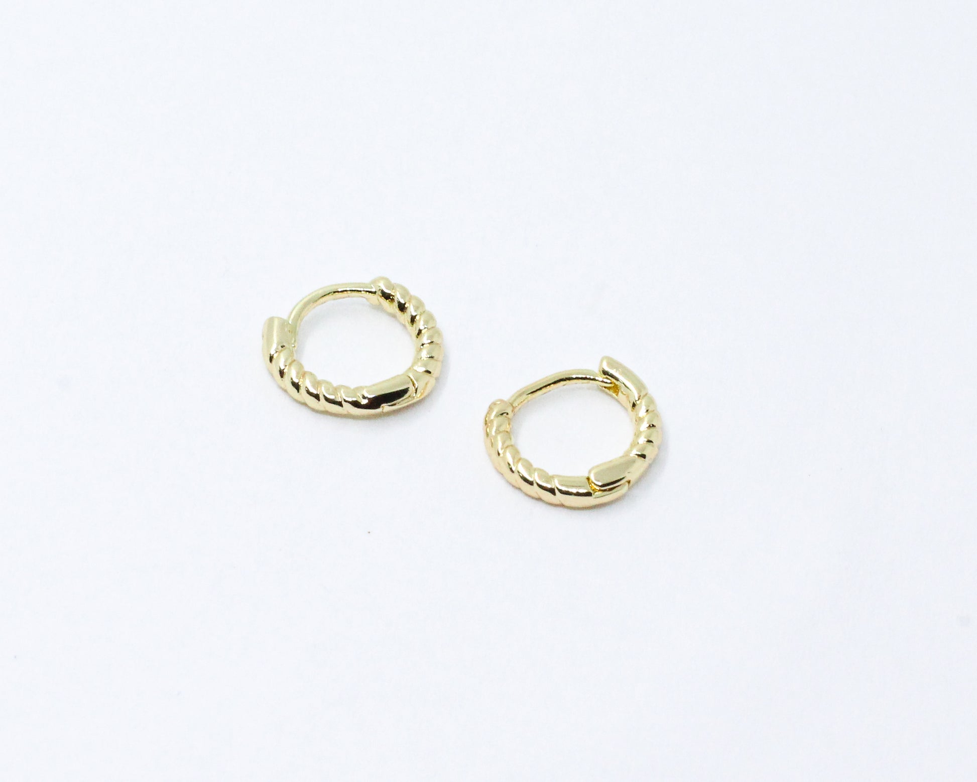 Un par de candongas doradas con diseño entorchado, realzadas por una textura suave que aporta un toque de sofisticación y elegancia atemporal. El accesorio perfecto para brillar en cualquier ocasión.