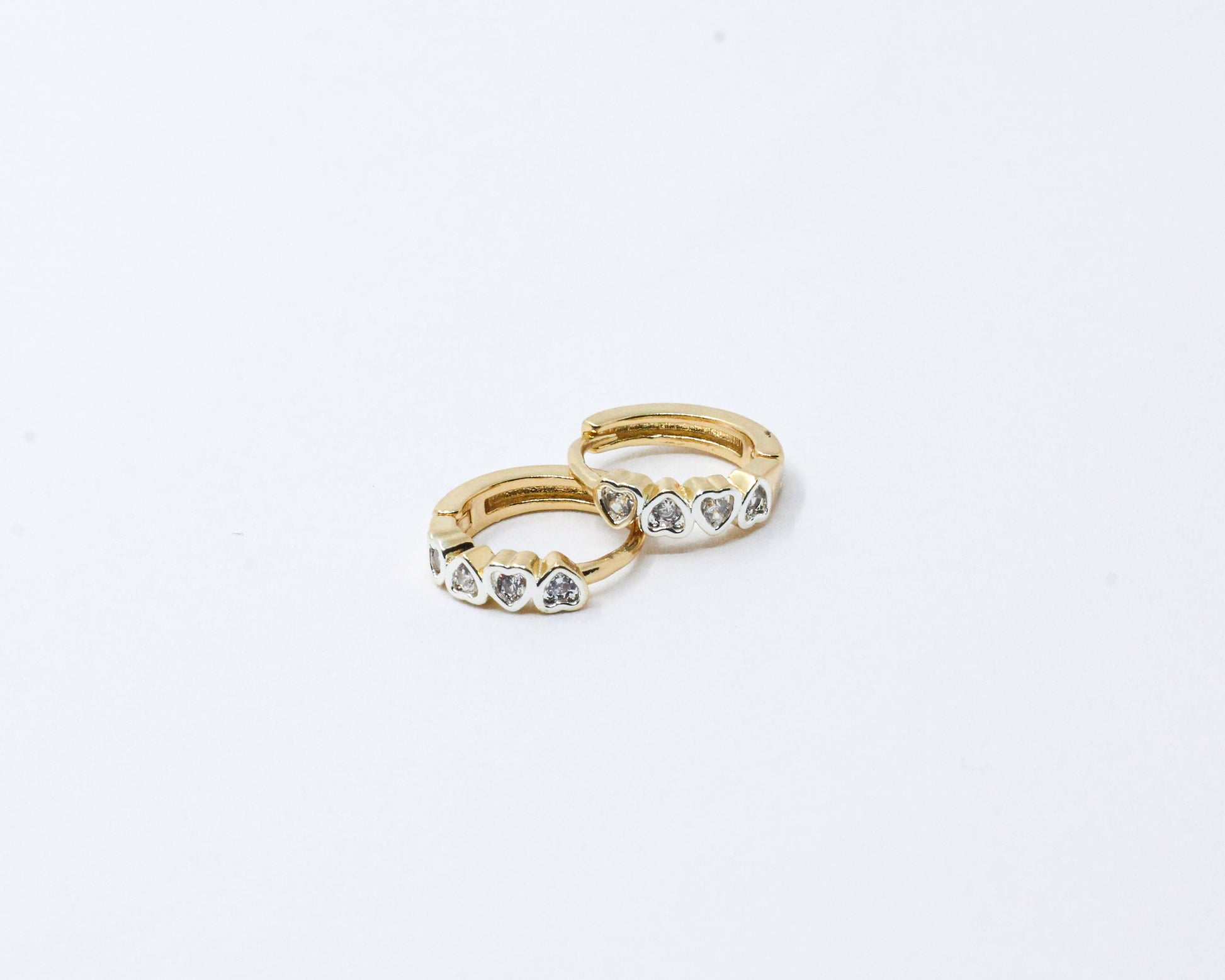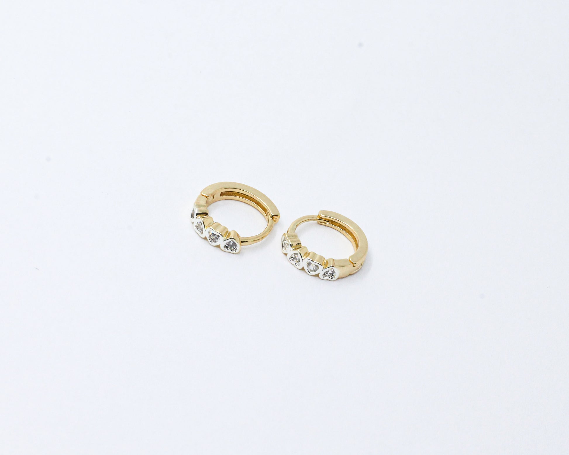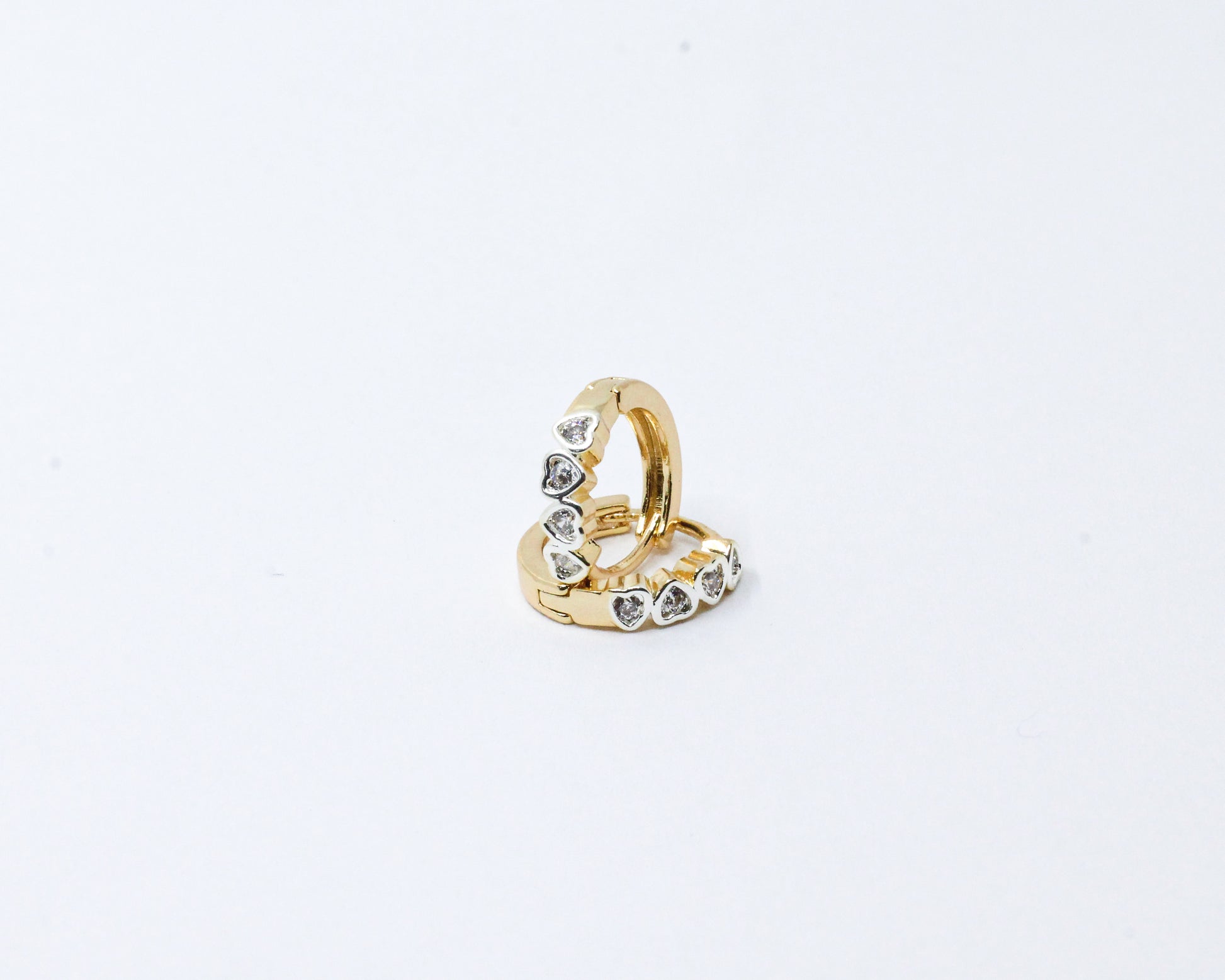 Un par de candongas doradas adornadas con pequeños corazones que suavizan la silueta, realzadas por circones que aportan un destello preciso y delicado. ¡Añádela a tu colección de joyas y sorprende con su elegancia!