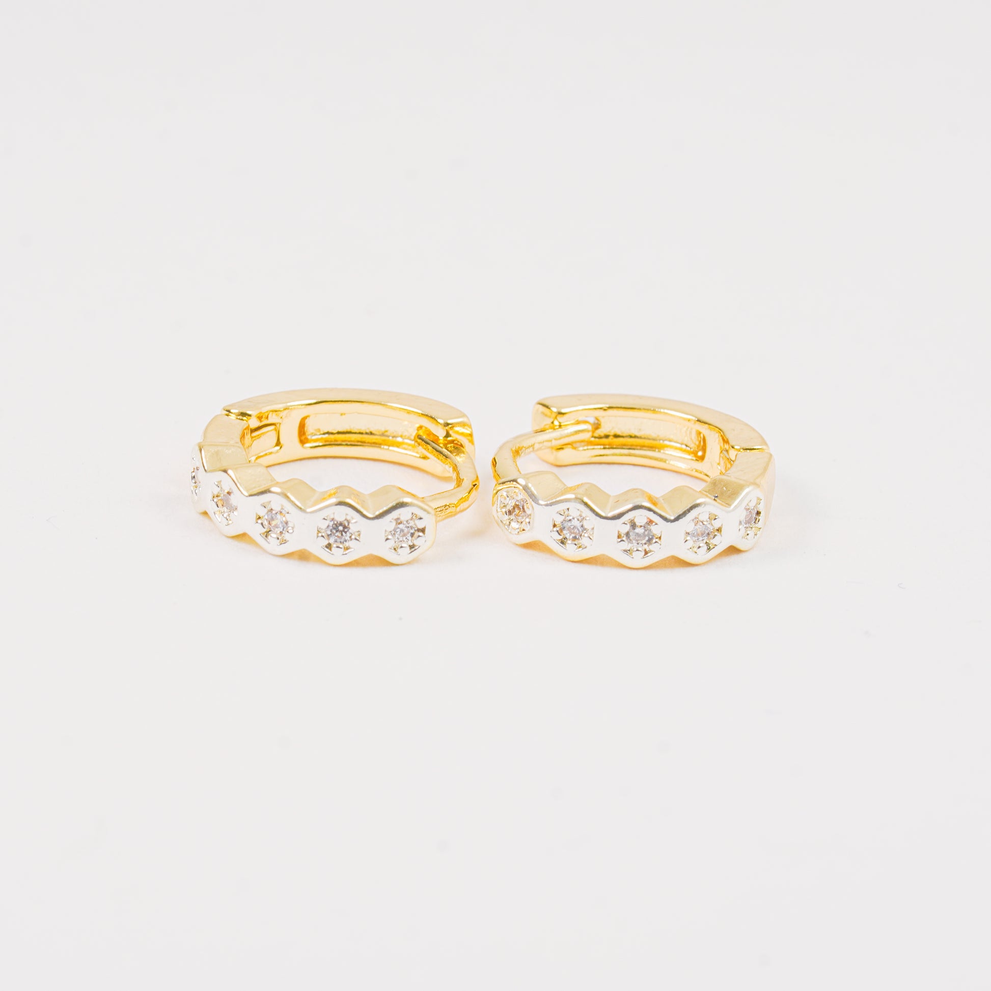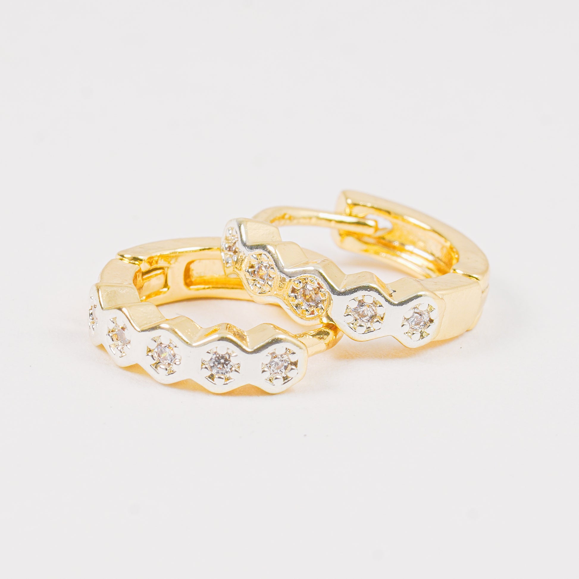 Un par de candongas doradas con silueta ondulada, adornadas con delicados circones blancos y sutiles destellos plateados que realzan su elegancia. Agrega este elemento de lujo a tu colección de joyas para una apariencia exclusiva y refinada.