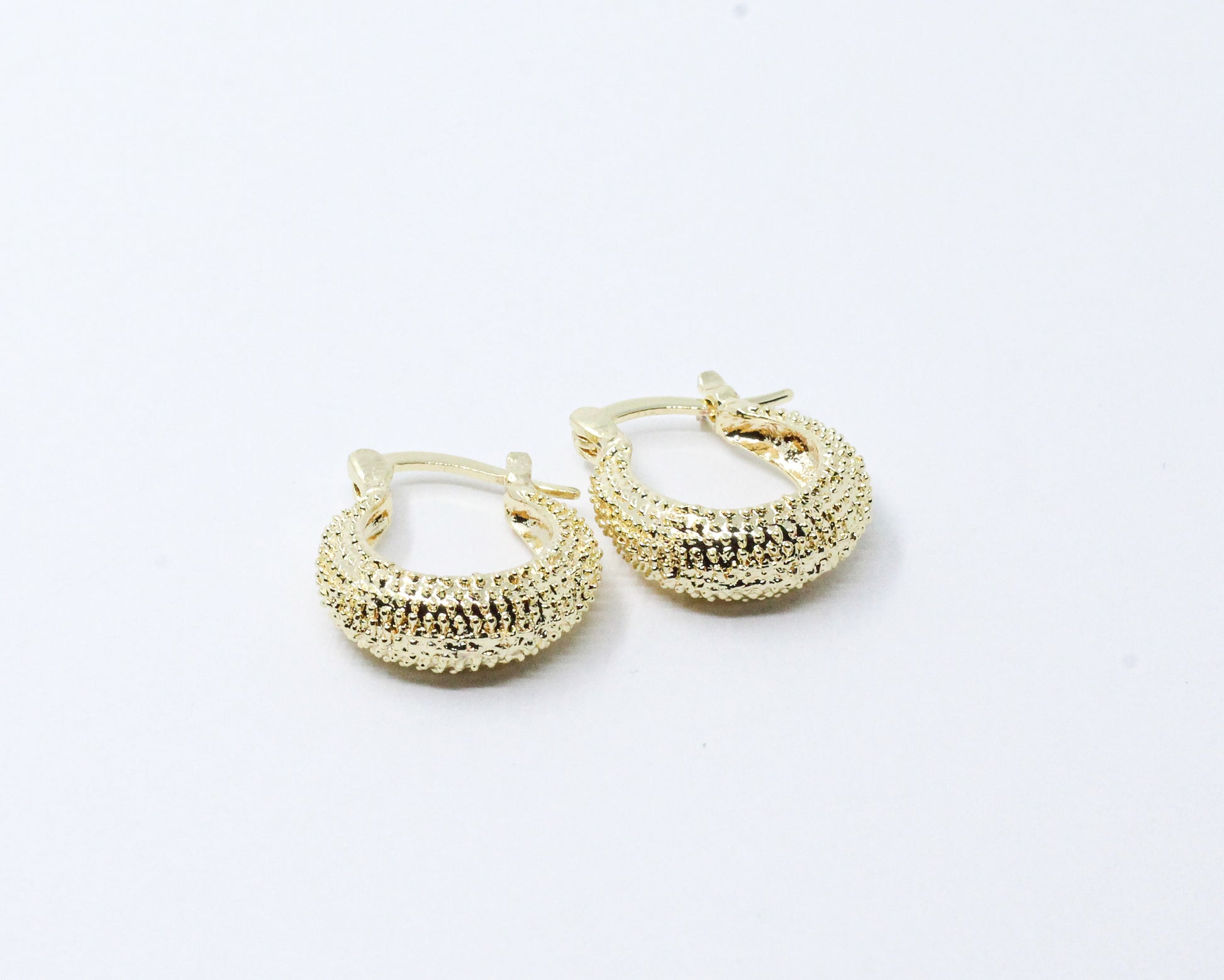 Un par de candongas doradas estilo canasta, con un texturizado de pequeñas esferas y acabados brillantes que aportan elegancia al diseño. Completa tu colección de joyas con esta pieza imprescindible.