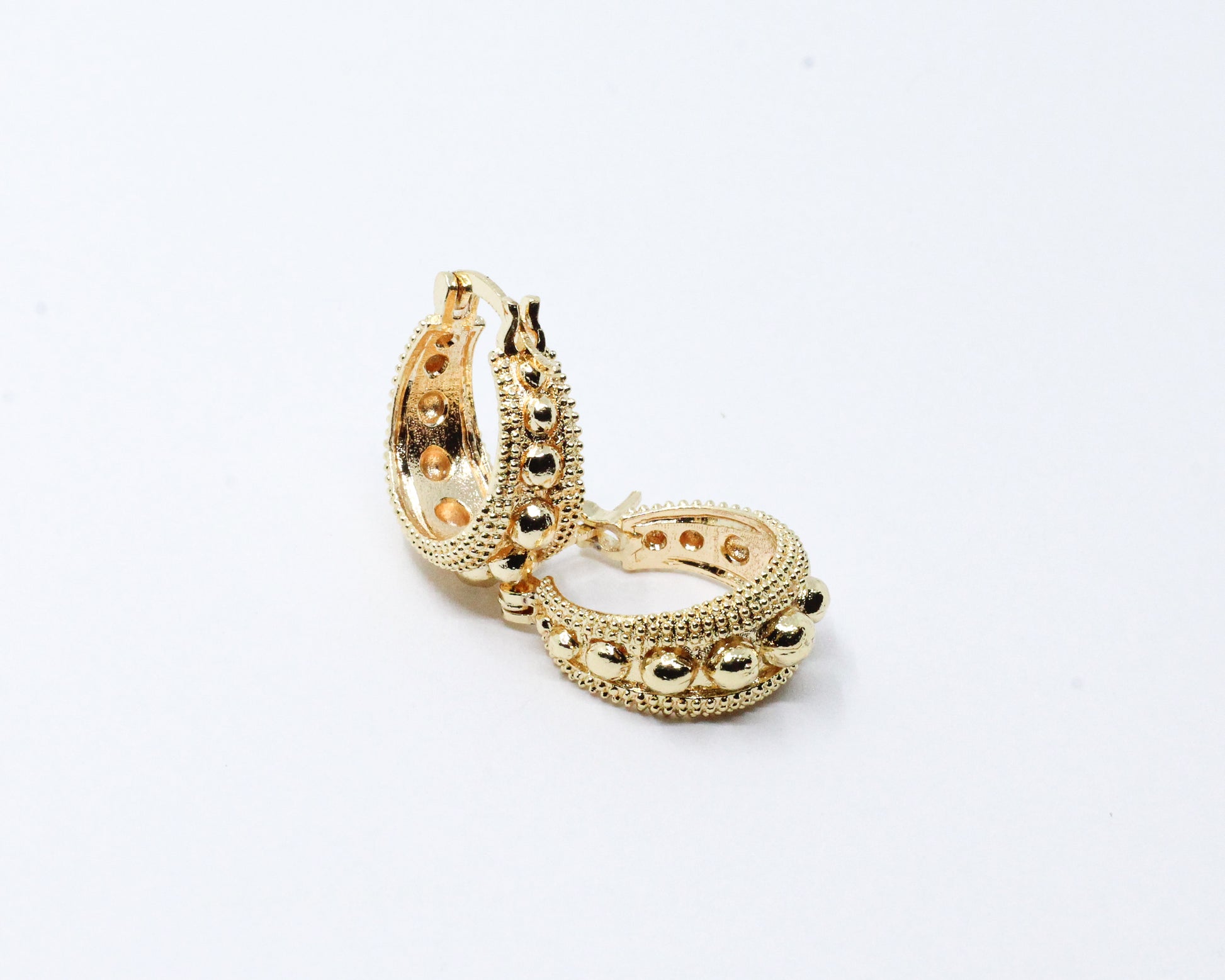 Un par de candongas doradas con un estilo delicadamente decorado, realzadas por pequeñas esferas en alto relieve con un acabado pulido que aporta un brillo sutil y elegante. ¡Hazte notar con esta joya deslumbrante!