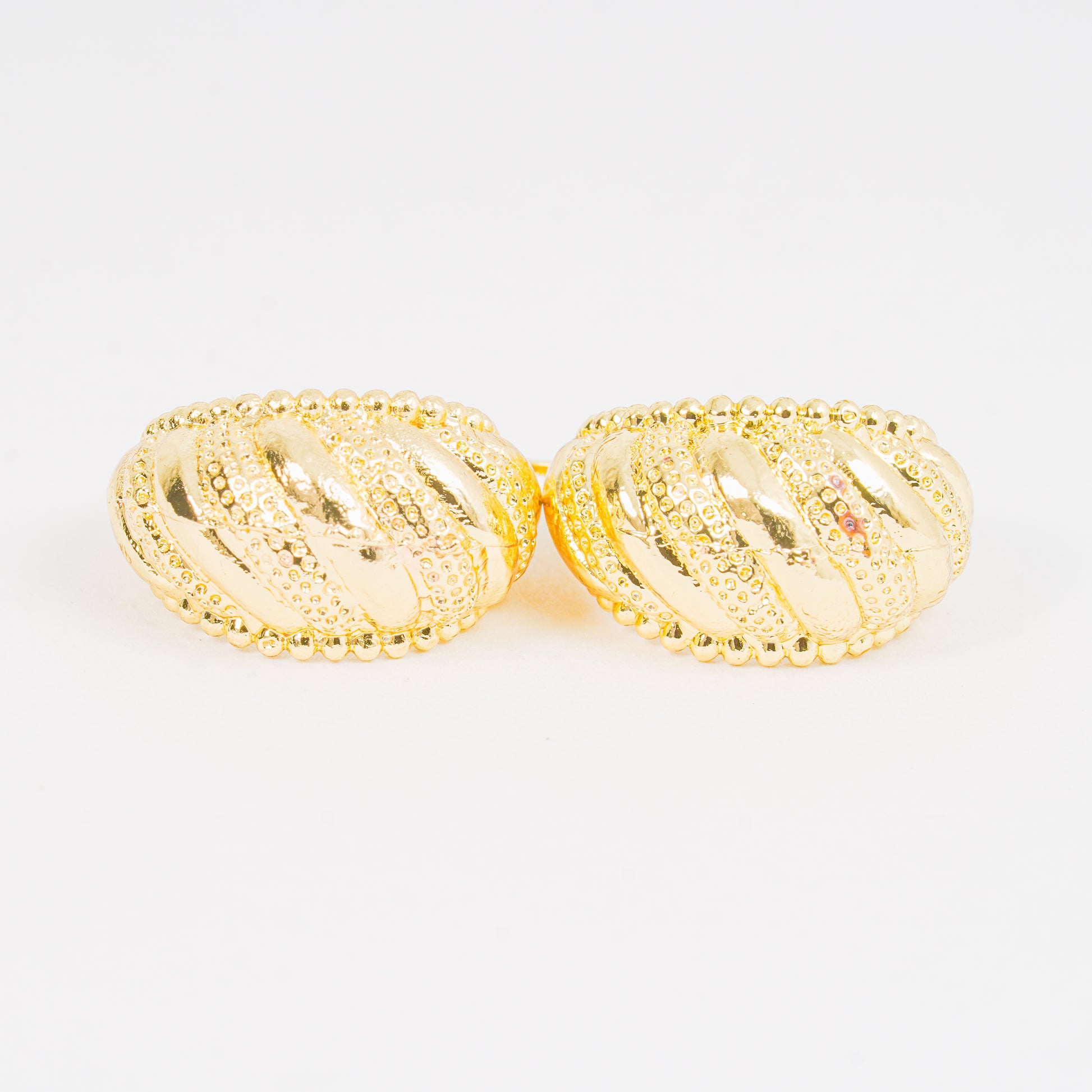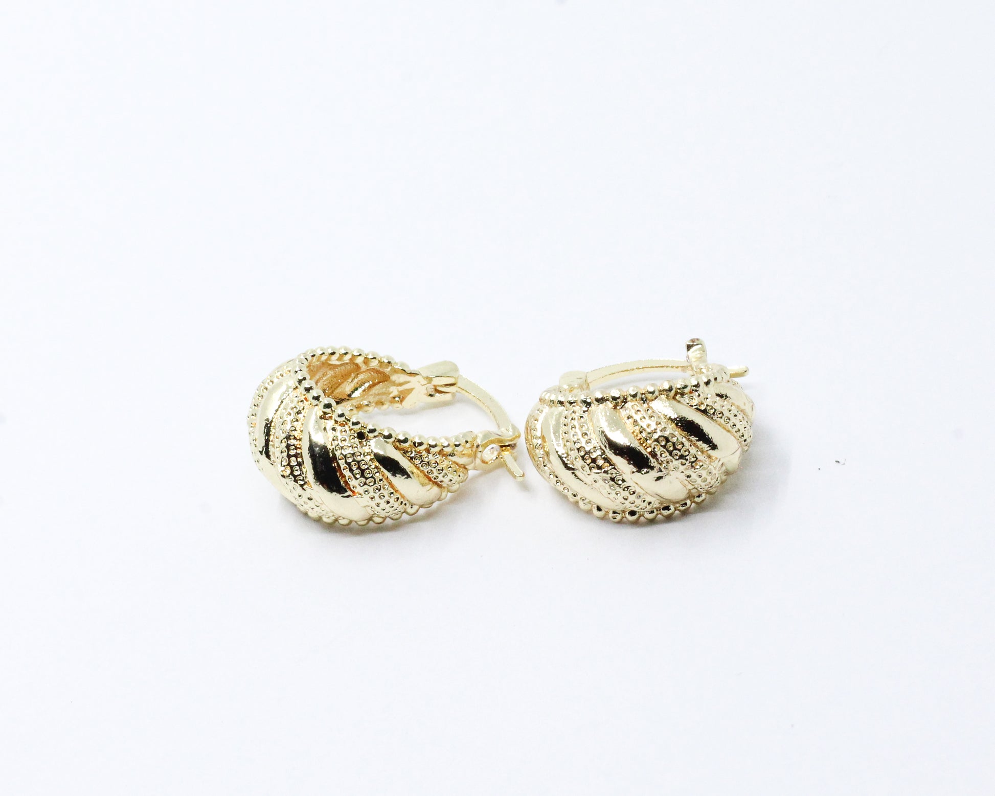Un par de candongas doradas de estilo chunky, con balines en su silueta y una textura diamantada en el centro que aporta carácter y brillo al diseño. Añádela a tu colección para lucir siempre impecable.