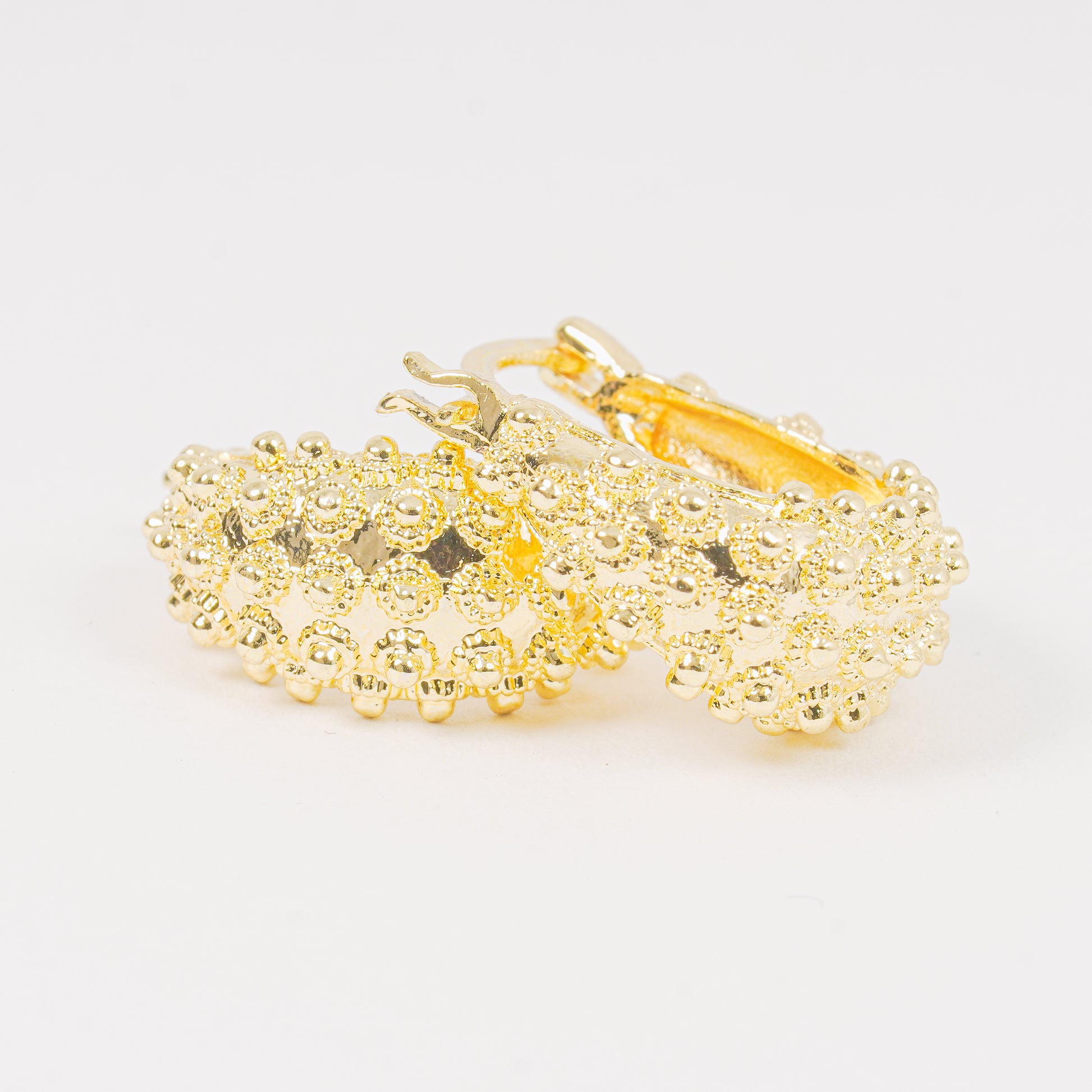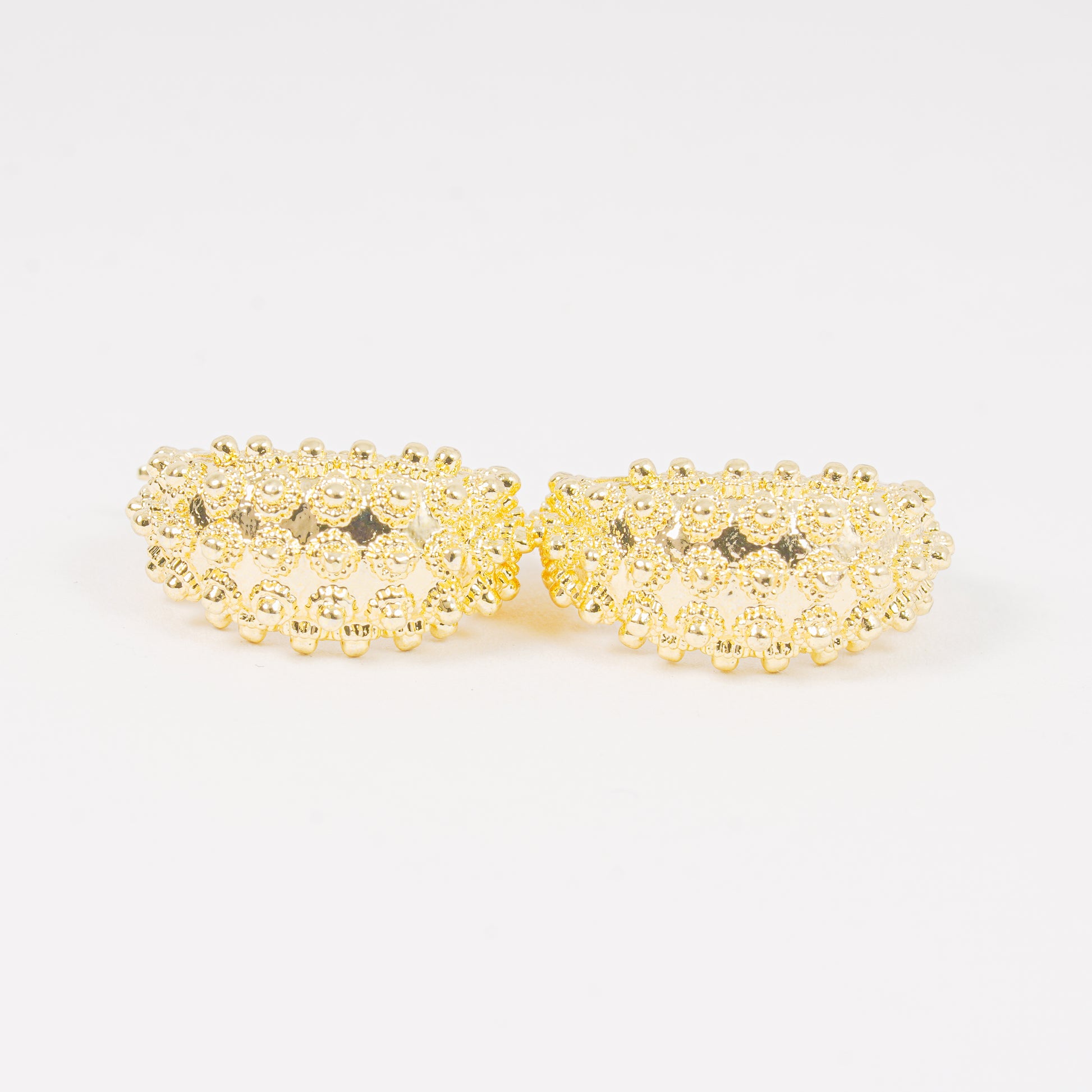 Un par de candongas doradas con un diseño innovador, adornadas con esferas de patrón simétrico que añaden un toque contemporáneo y elegante. Disfruta de un estilo único gracias a nuestras candongas doradas adornadas con balines.
