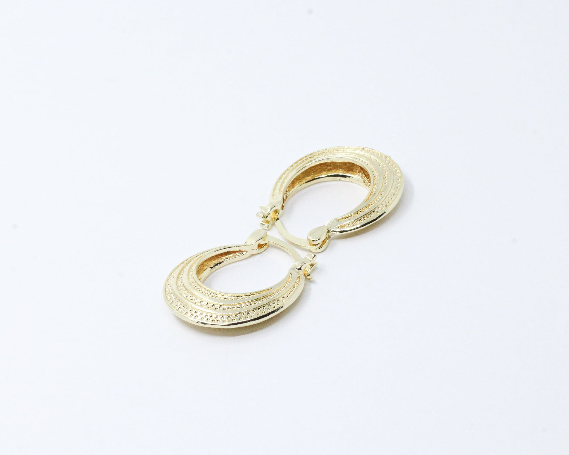 Un par de candongas doradas de forma ovalada, alargadas y diamantadas, con contornos finos que reflejan una elegancia delicada. Añade un toque de glamour a cualquier atuendo con esta elegante candonga.