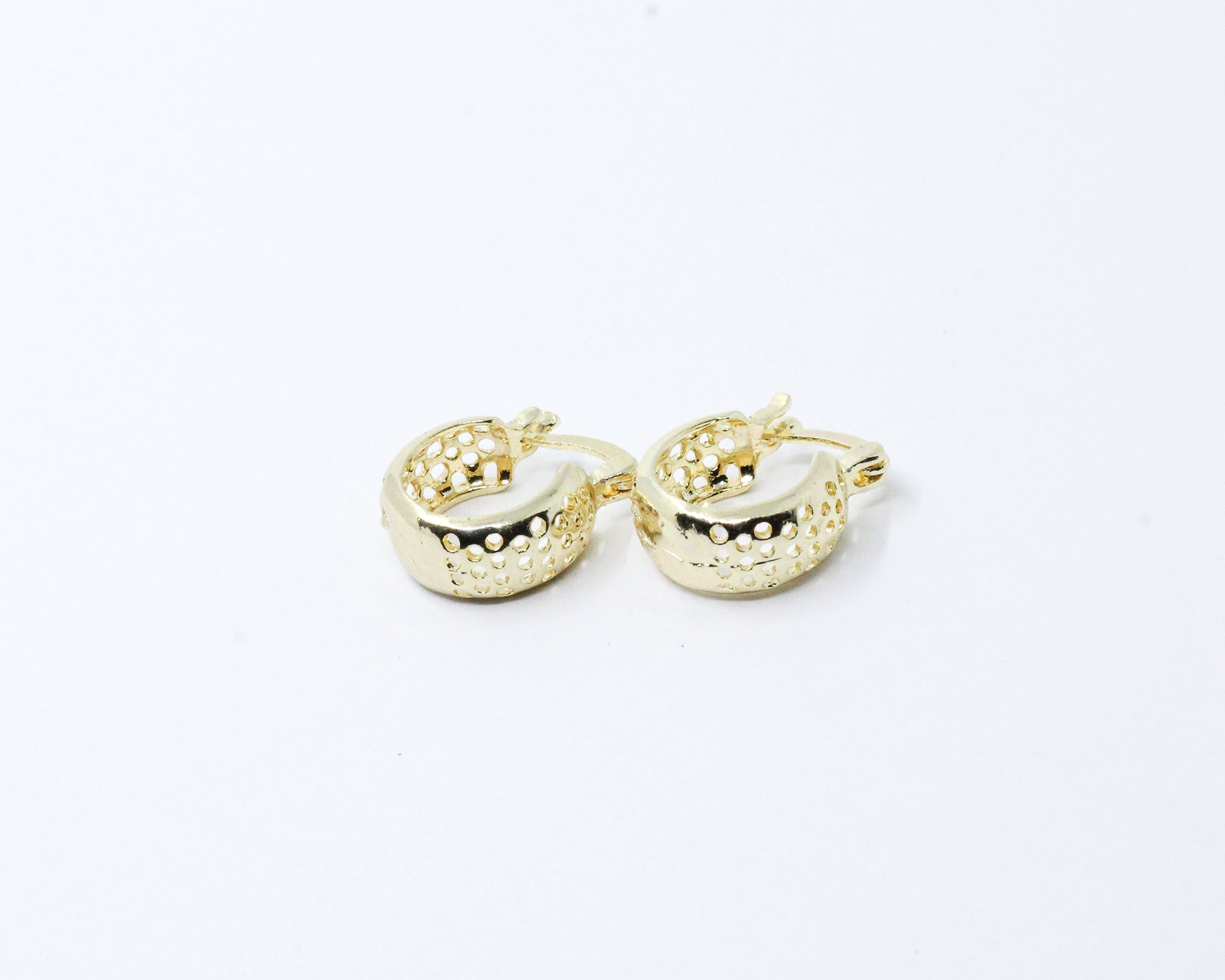 Un par de candongas doradas con una silueta compacta y envolvente, adornadas con orificios circulares finamente elaborados que aportan distinción, sutileza y versatilidad. Añade un toque de glamour a tu atuendo con esta pieza exclusiva.
