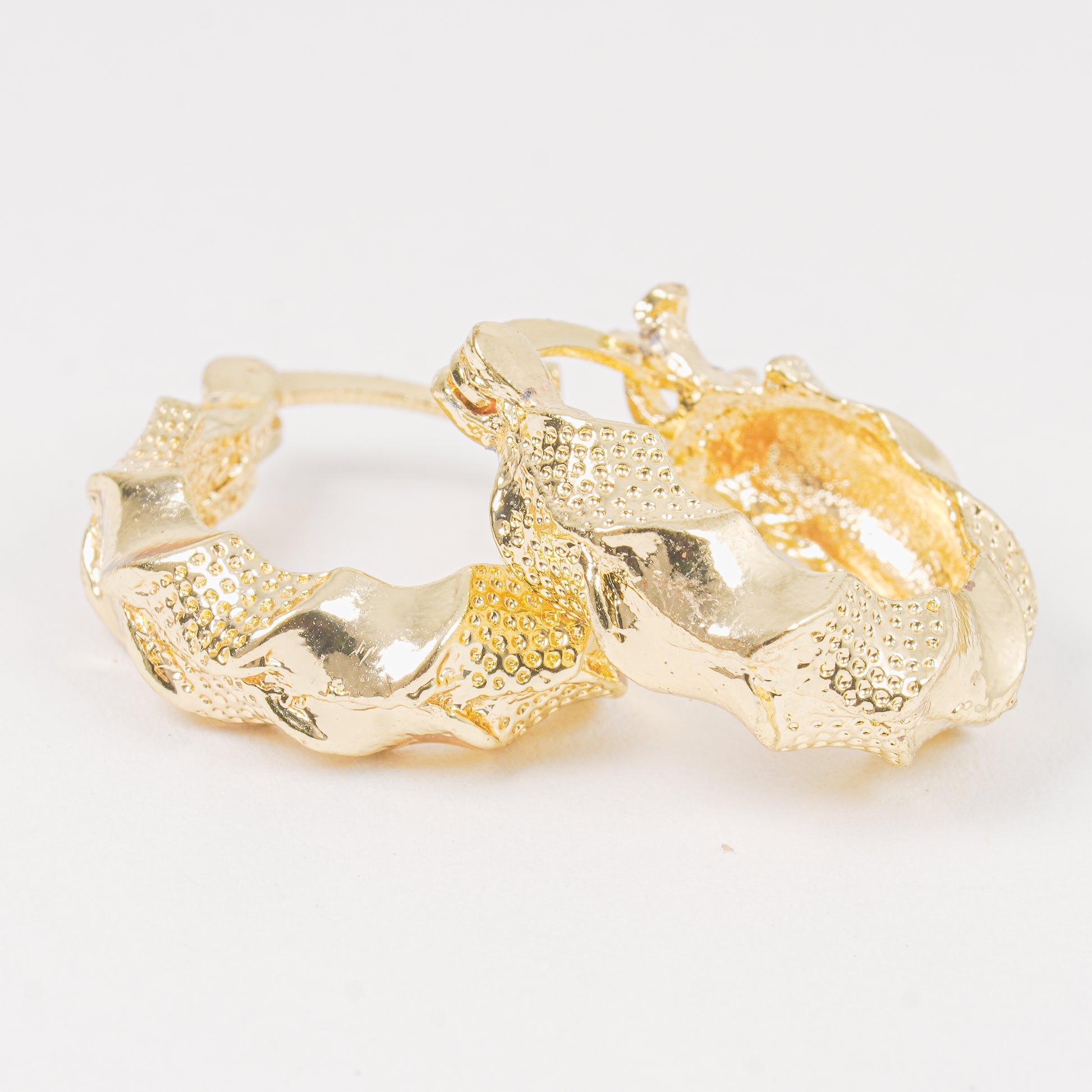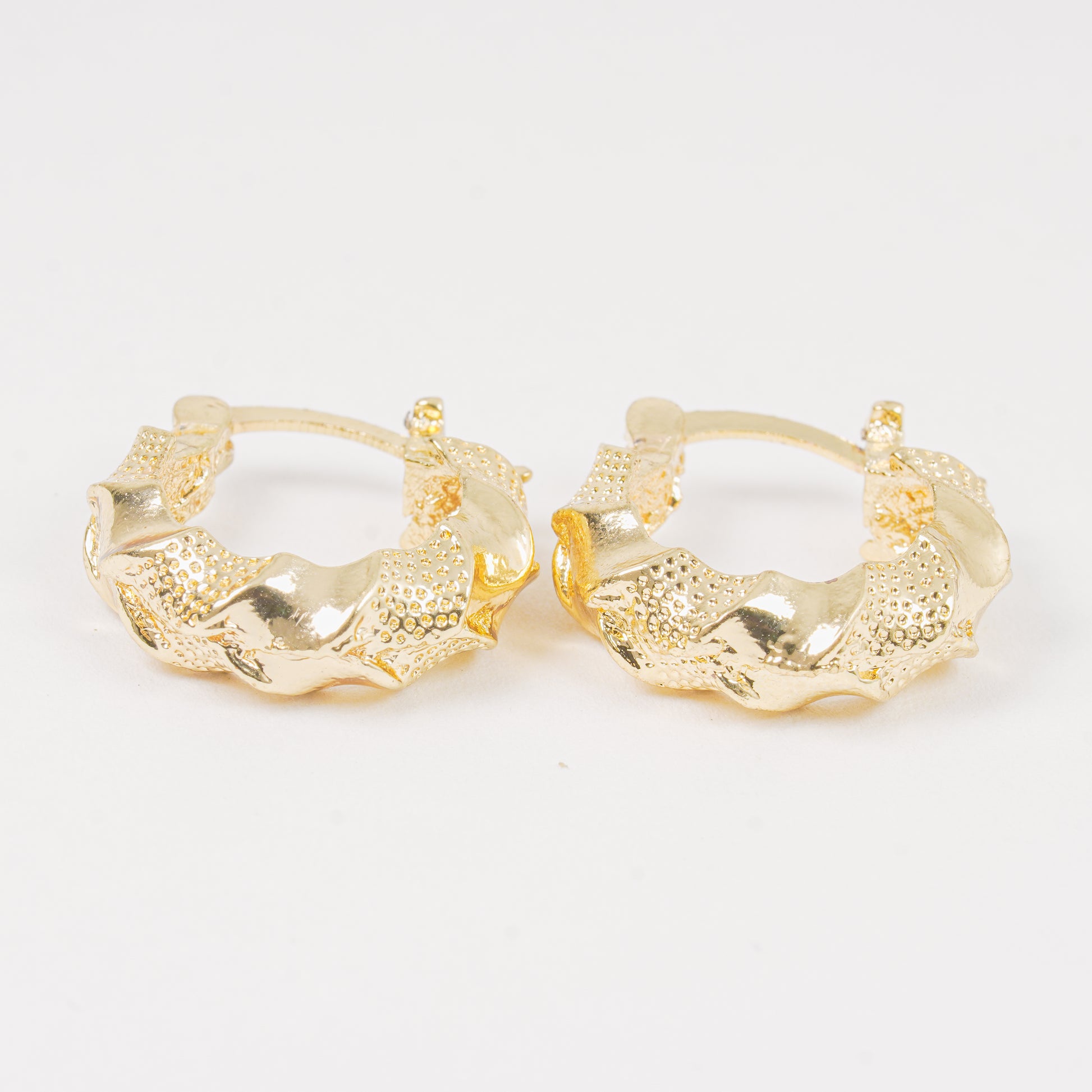 Un par de candongas doradas con un diseño trenzado y ondulado, que alterna superficies lisas con texturas en relieve tipo diamantado, creando un juego visual dinámico y elegante. Añada esta hermosa joya a su colección y realce su estilo.