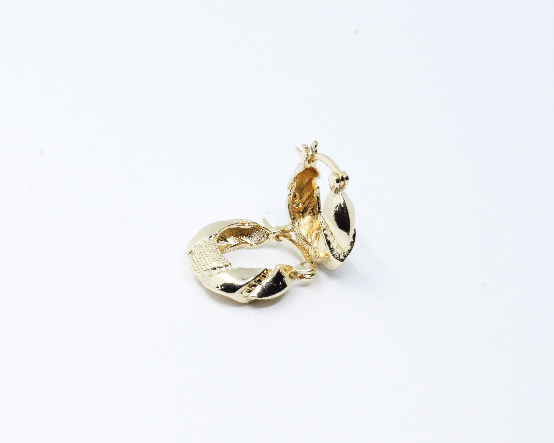 Un par de candongas doradas con texturas contrastantes que realzan su forma redondeada y su diseño audaz, creando una pieza única y llamativa.
