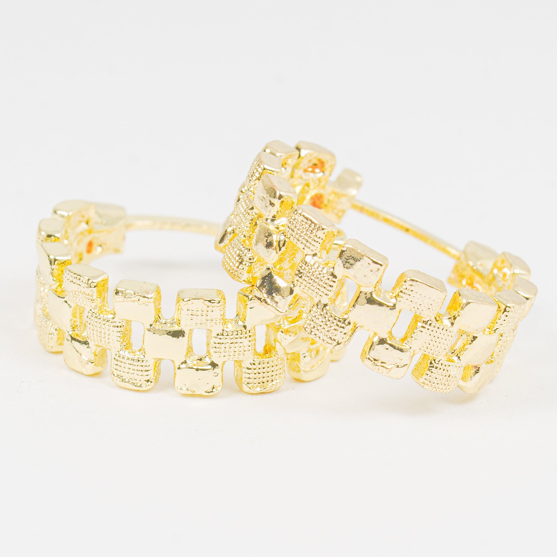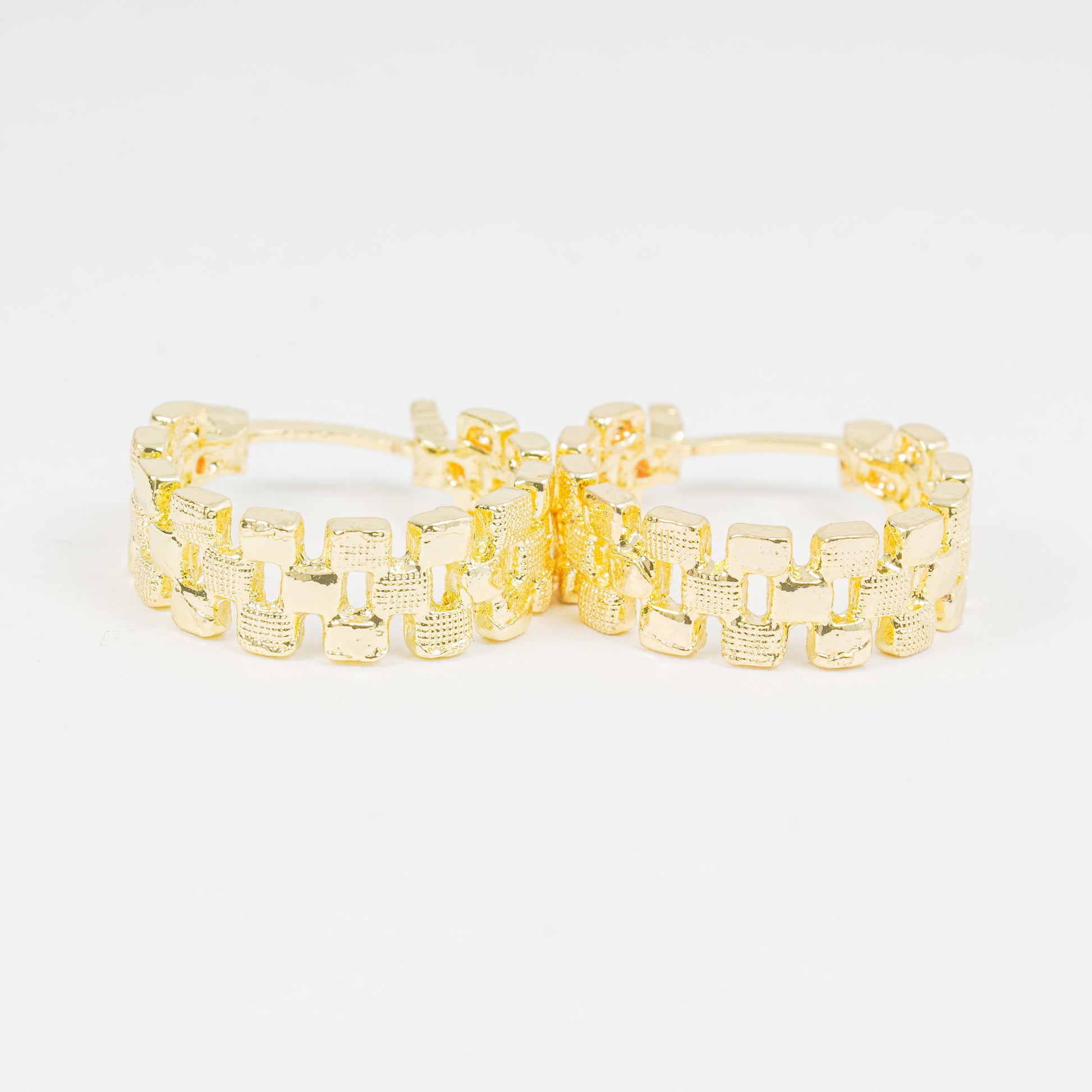 Un par de candongas doradas con tejido doble, que crean una textura ligera pero llamativa, aportando un toque de elegancia sutil. Ideales para complementar tu look con belleza y distinción.