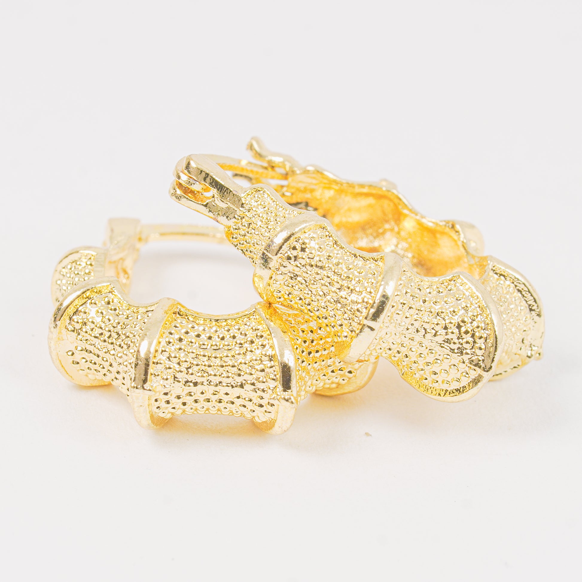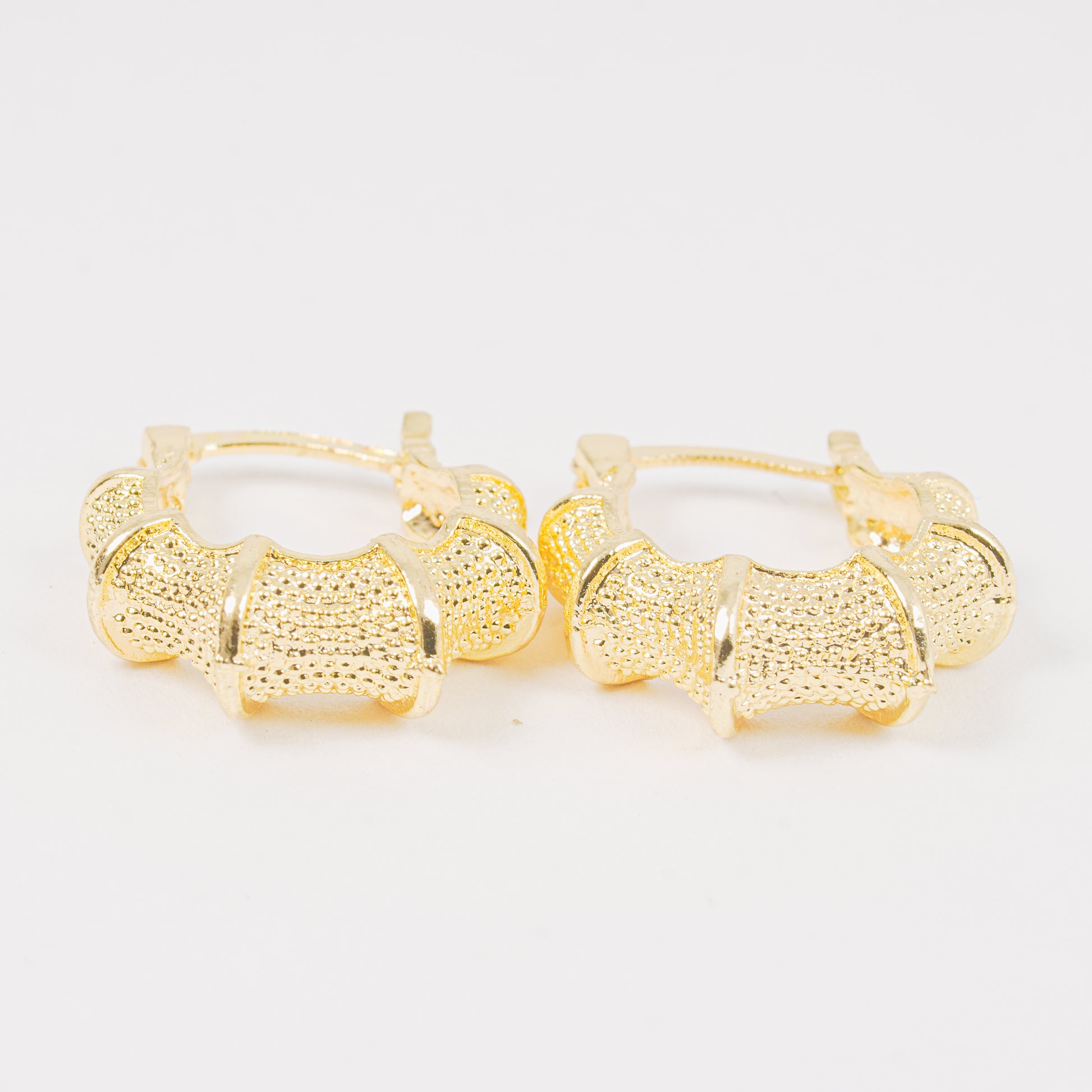 Un par de candongas doradas estilo rústico, con acabados texturizados en esferas que generan un juego de luz sutil y sofisticado. ¡Sé parte del mundo de la moda y destaca con esta joya!
