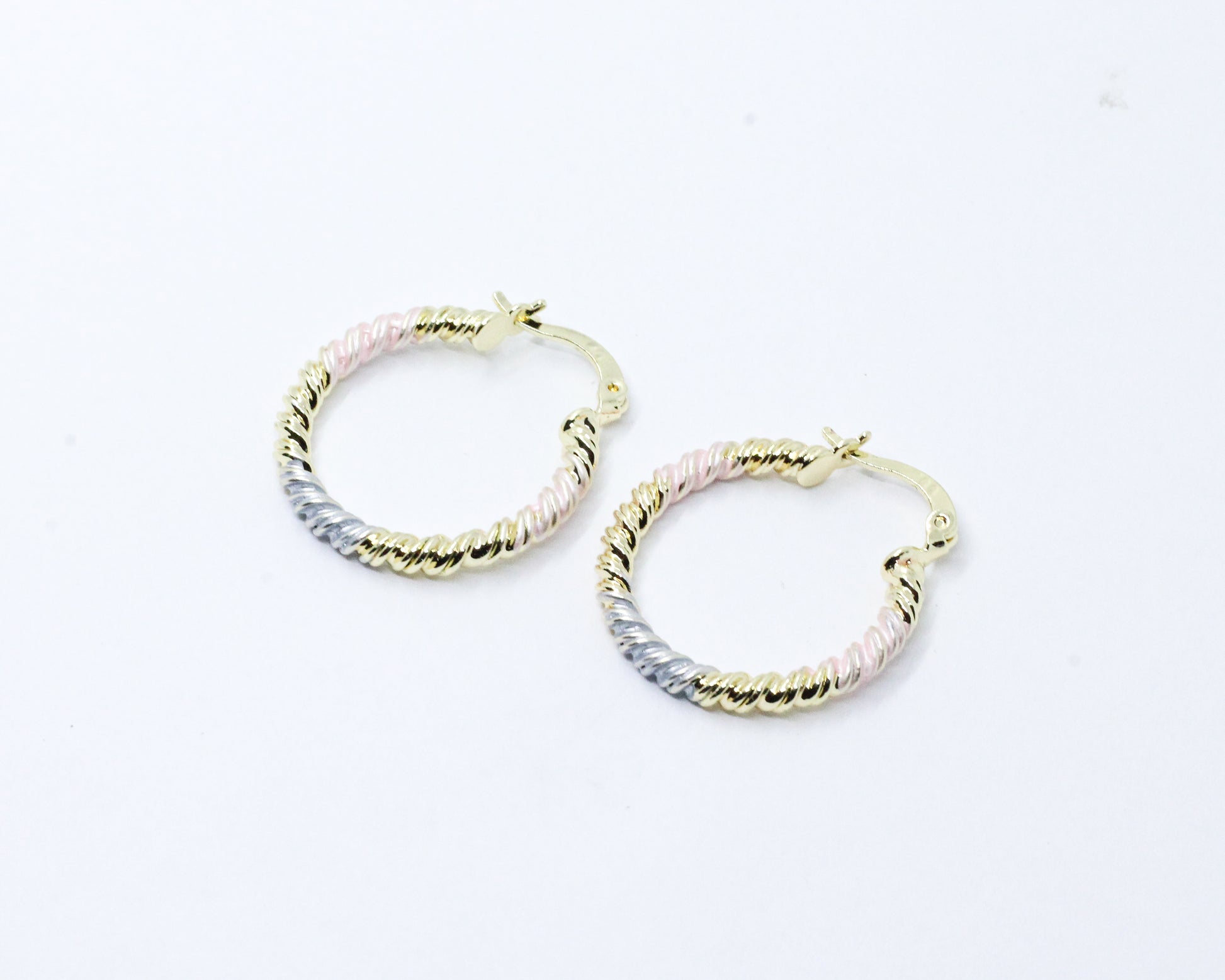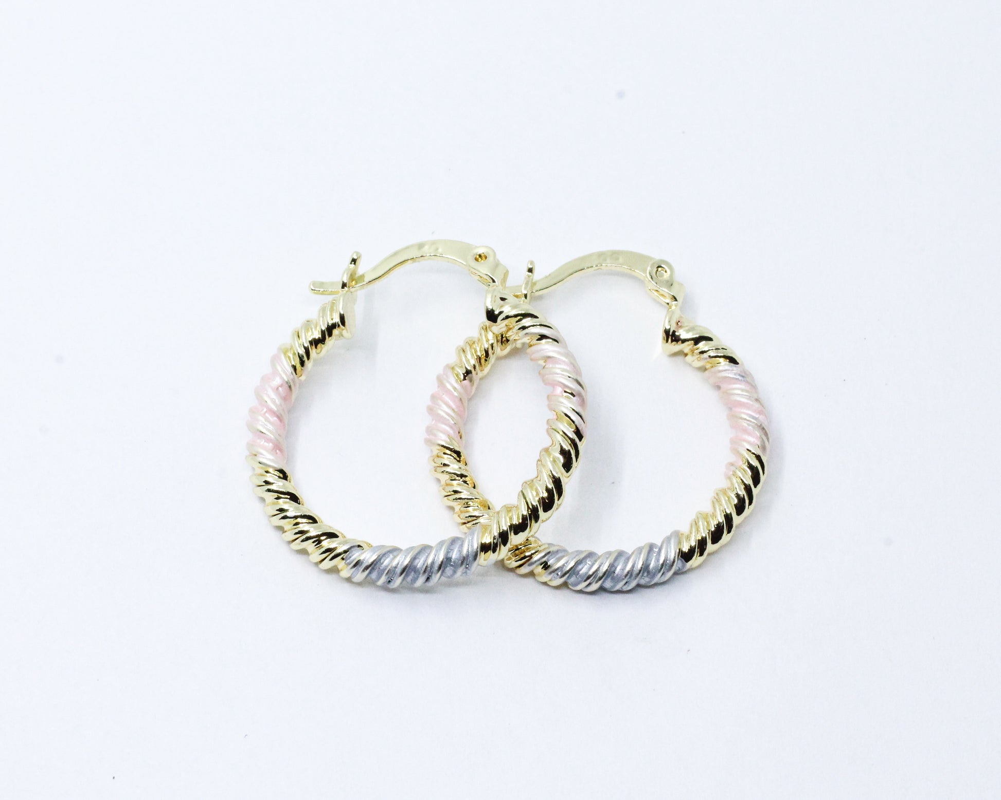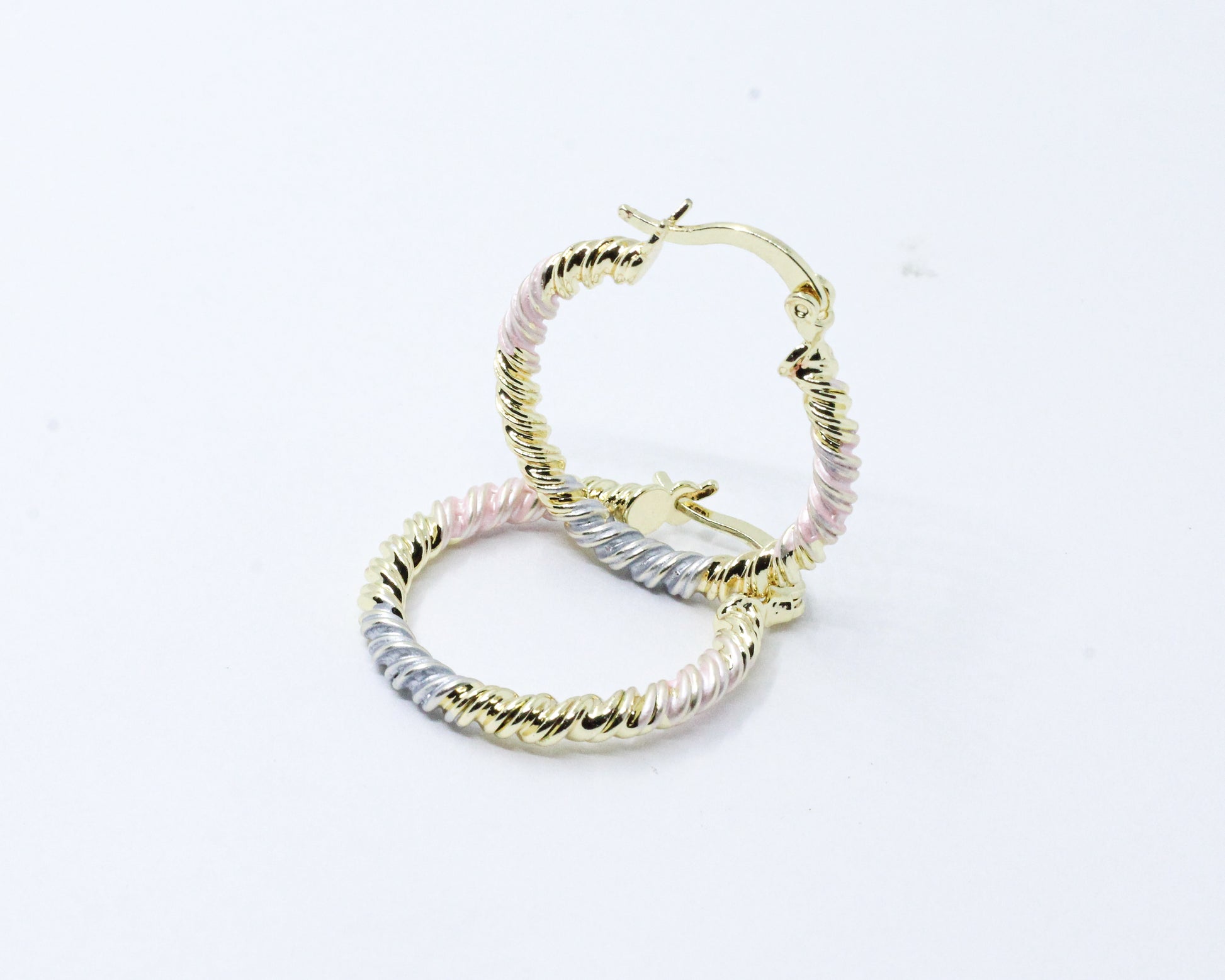 Un par de candongas tricolor con acabado en espiral que recorre toda la superficie del aro, combinando texturas dinámicas y contrastes brillantes que capturan la luz con elegancia. Un imprescindible en cualquier colección de alta calidad.