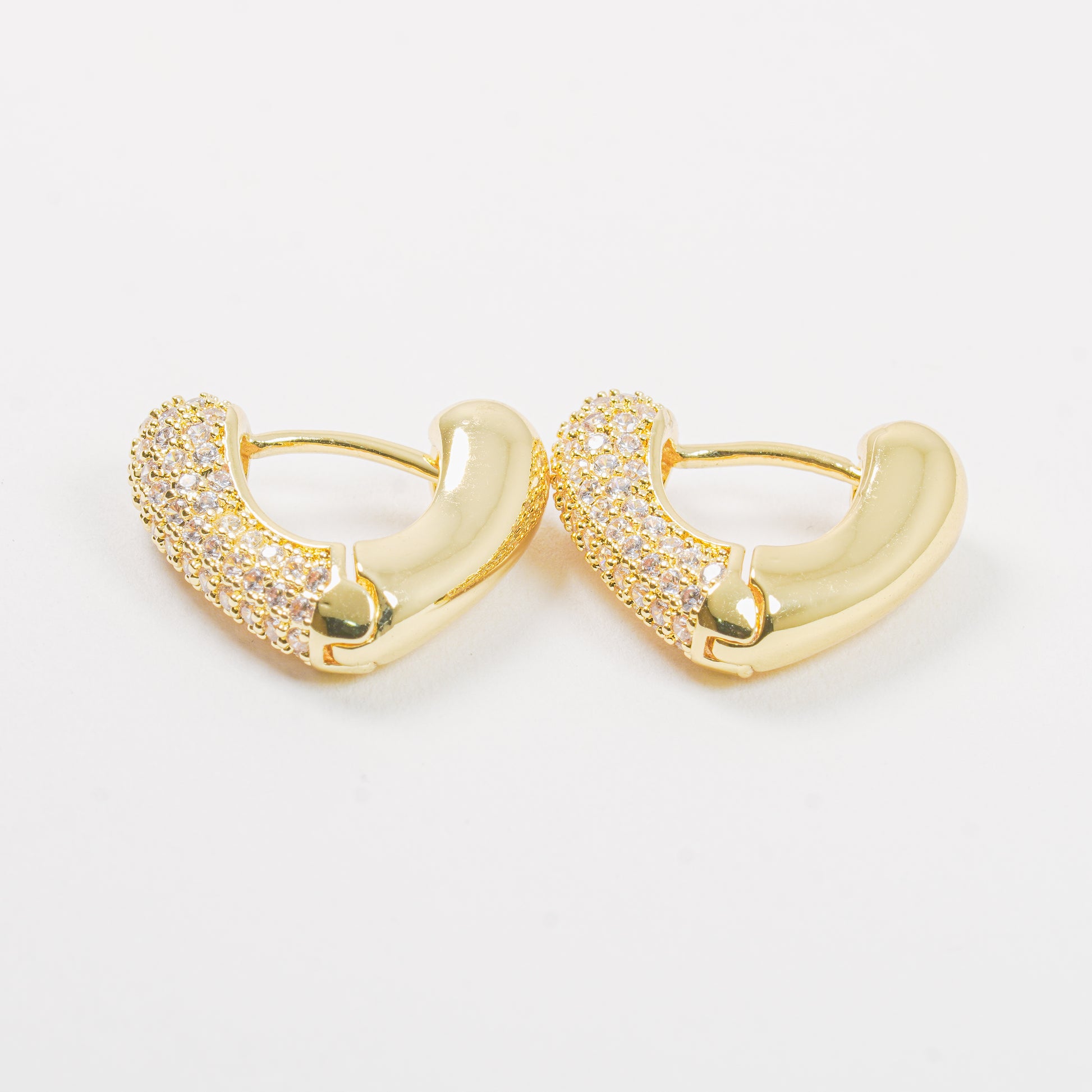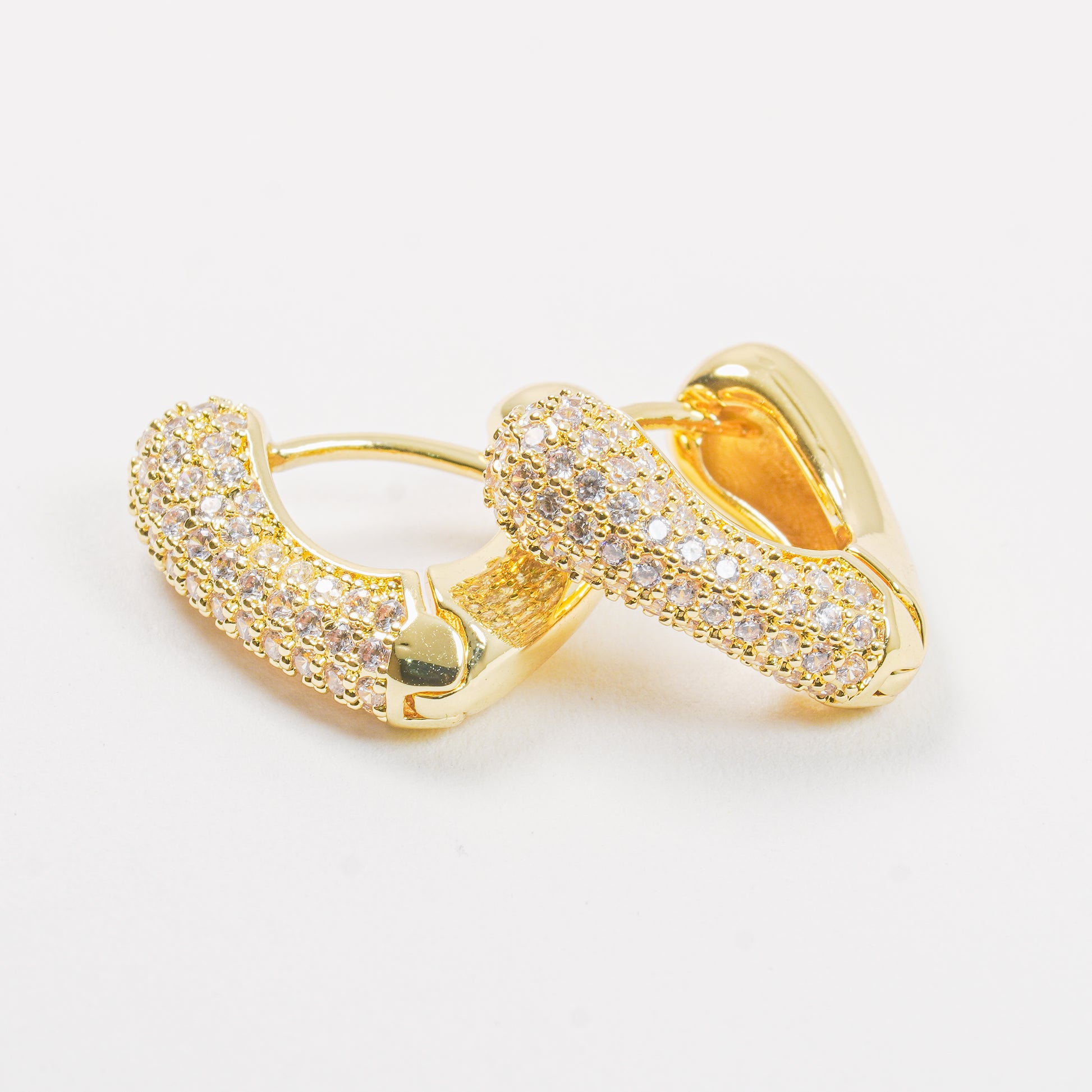 Estas candongas doradas destacan por su diseño moderno y curvo, totalmente engastado en circones blancos que aportan un brillo sofisticado y elegante. Su forma pulida y el acabado en pavé elevan cualquier look con un toque de glamour sutil.