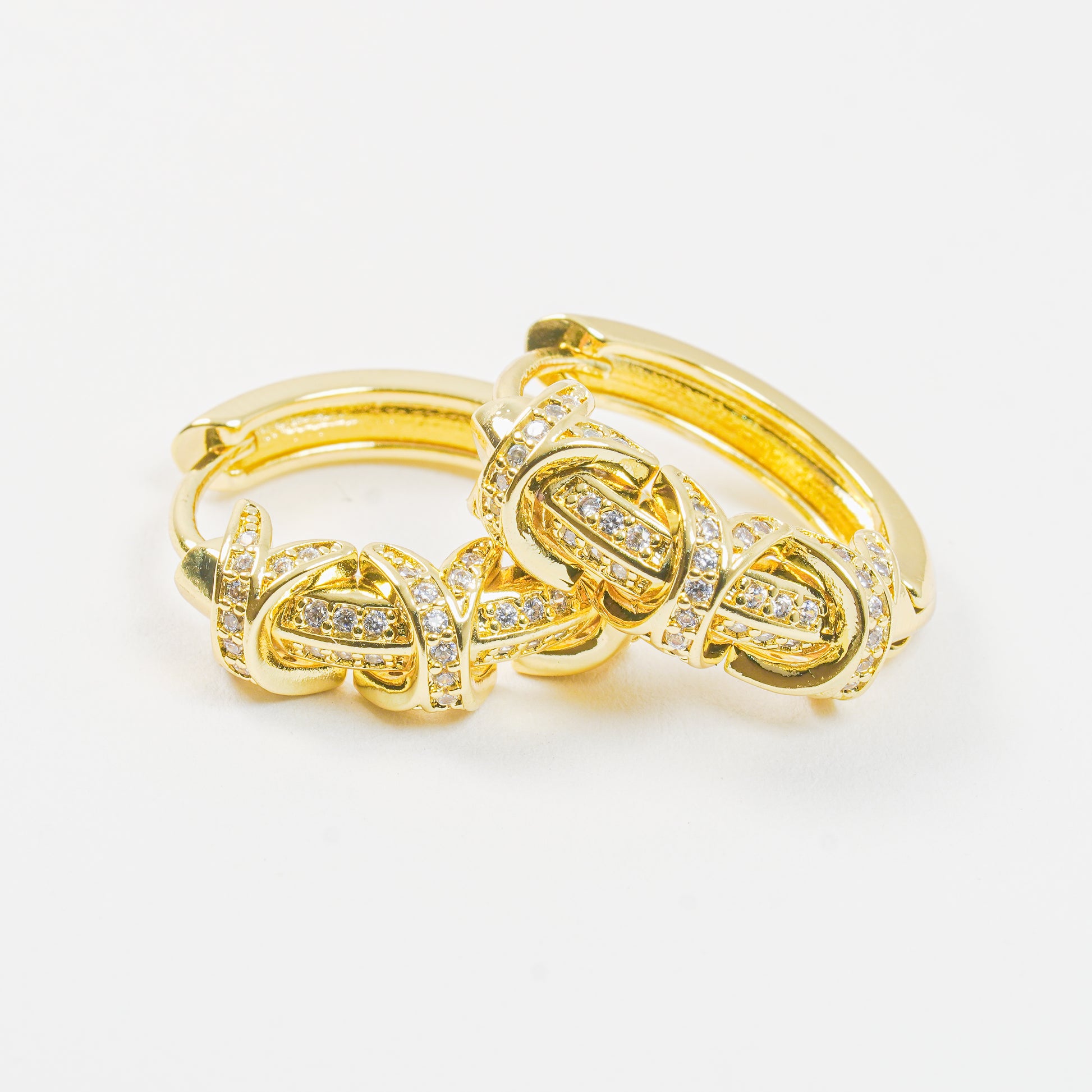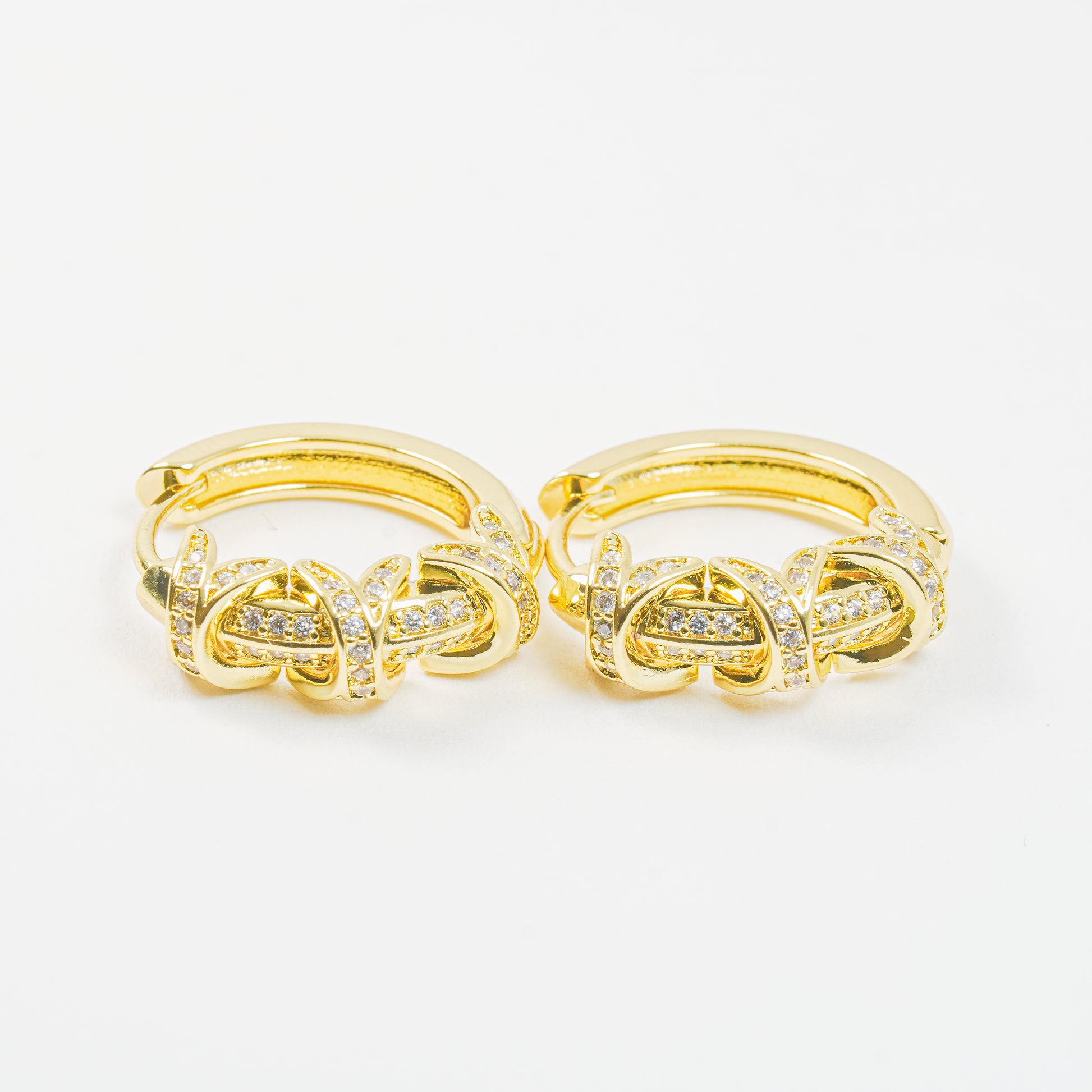 Un par de candongas doradas con un diseño entrelazado que combina volumen, brillo y elegancia. El nudo central, adornado con circones blancos incrustados, crea un efecto luminoso que resalta cada detalle y aporta un toque sofisticado a cualquier look.
