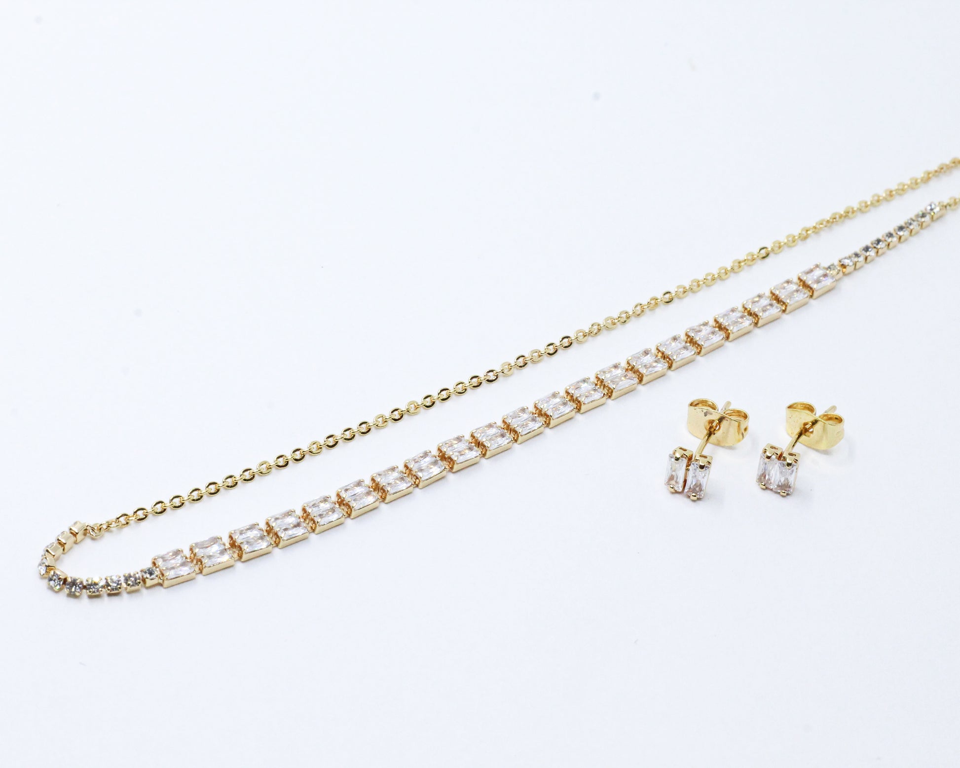 Un aderezo compuesto por topos y collar estilo baguette graduable en largor, decorado con circones alargados que denotan modernidad, mientras los microcircones aportan un toque de sutileza y delicadeza al diseño. ¡Haz una declaración de estilo con este impresionante collar Baguette!