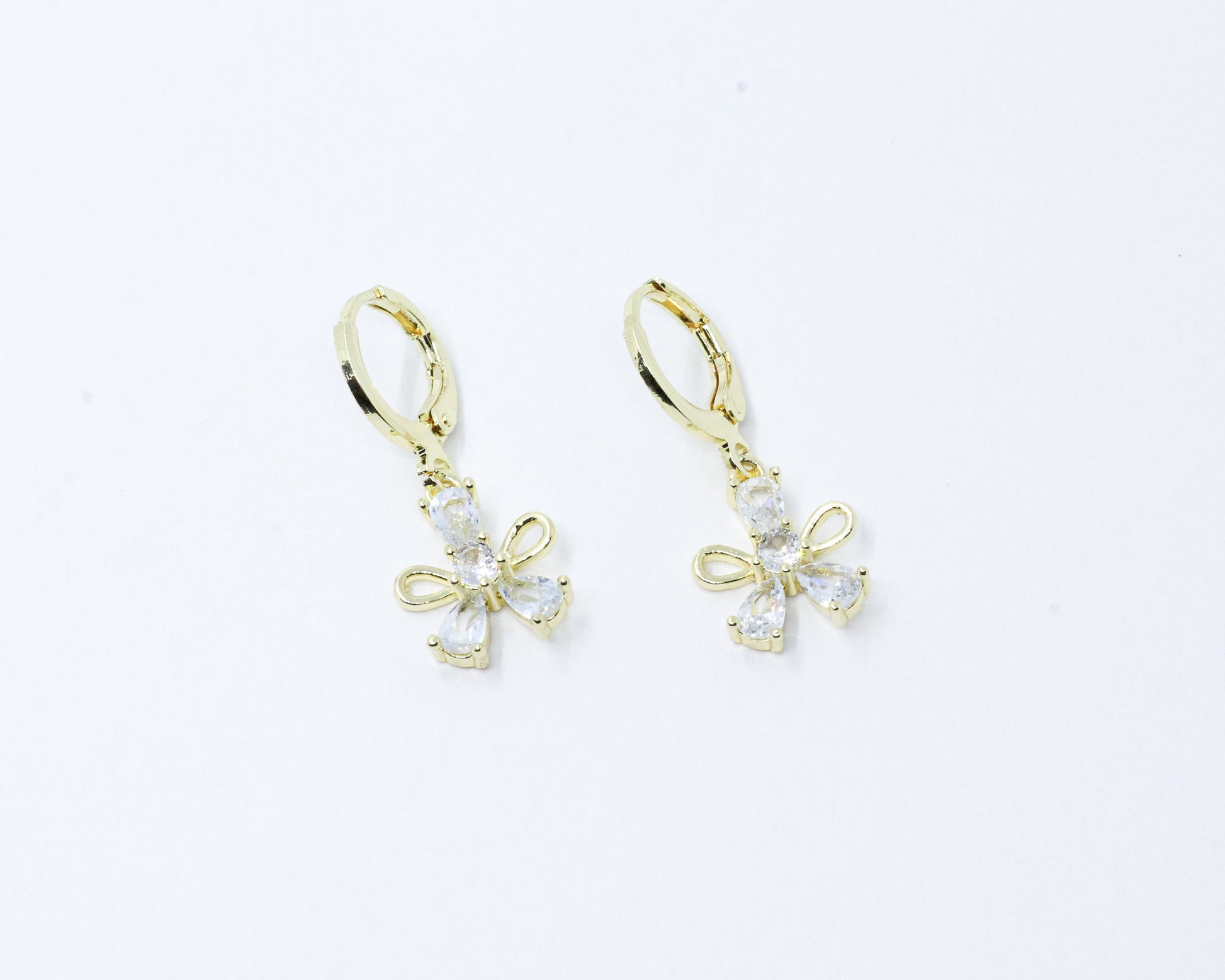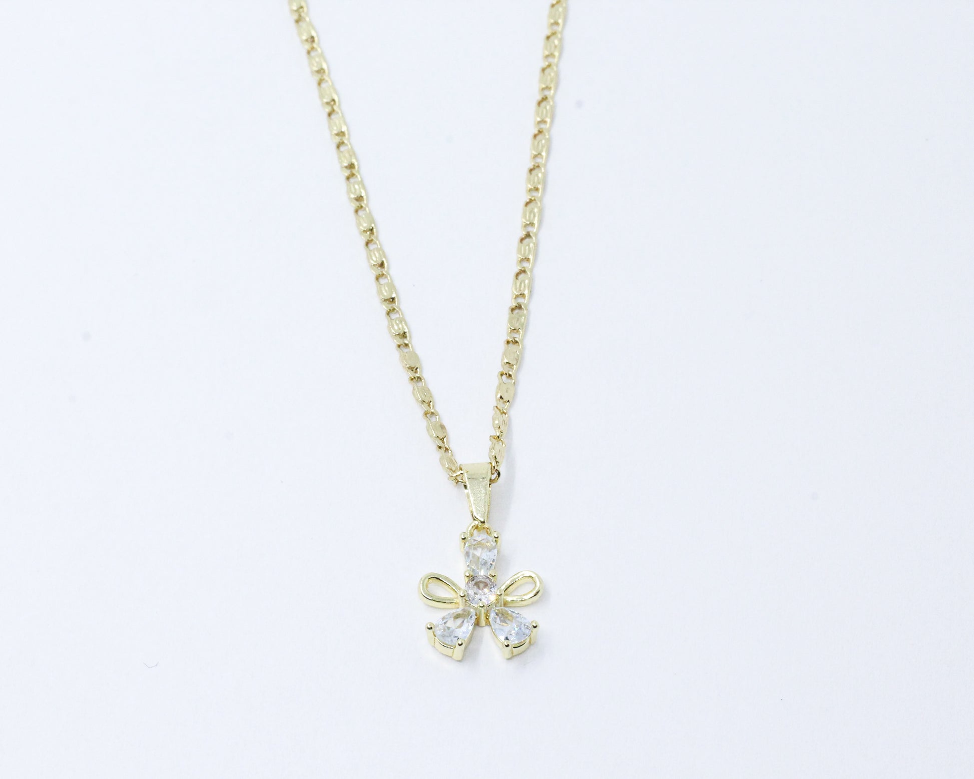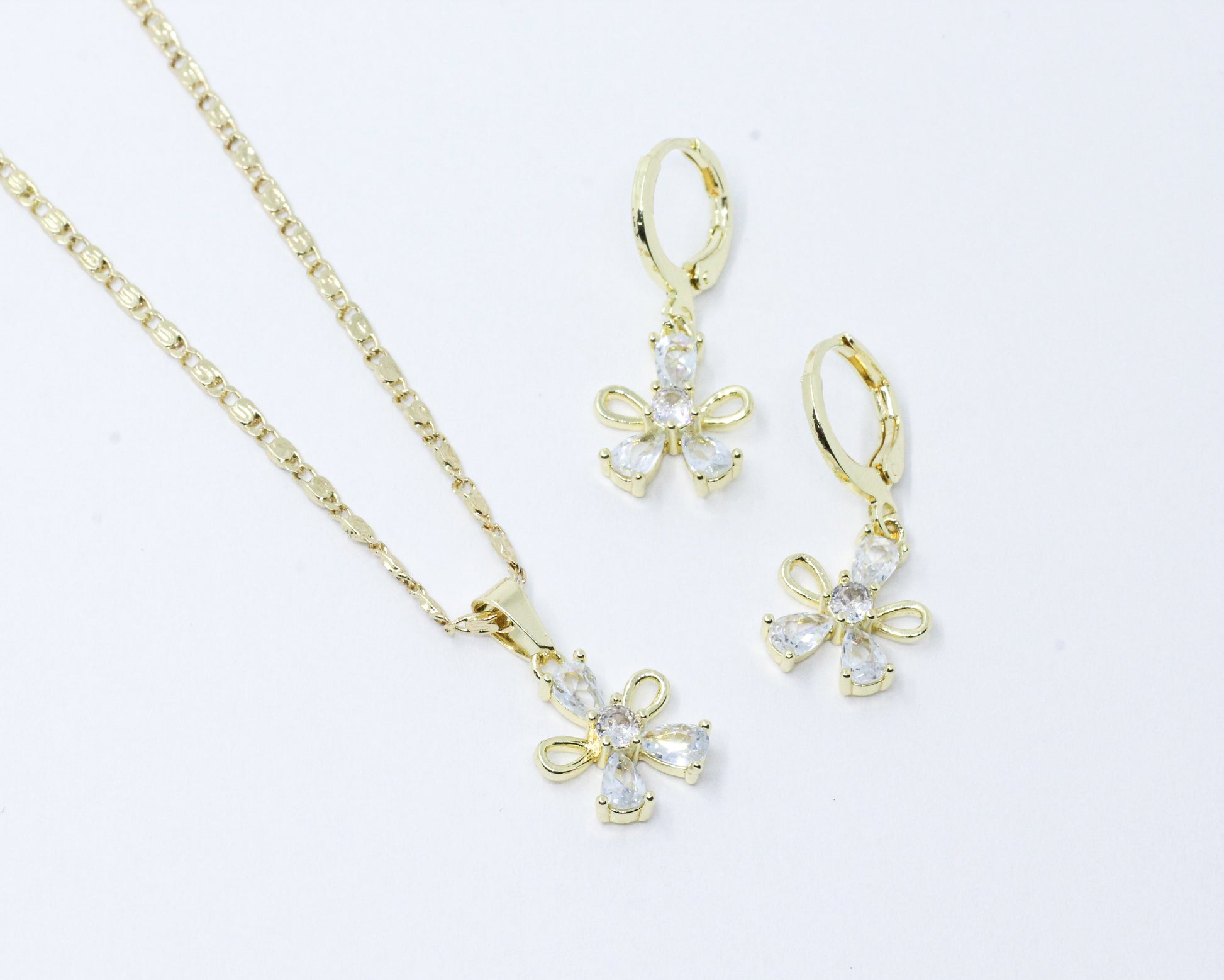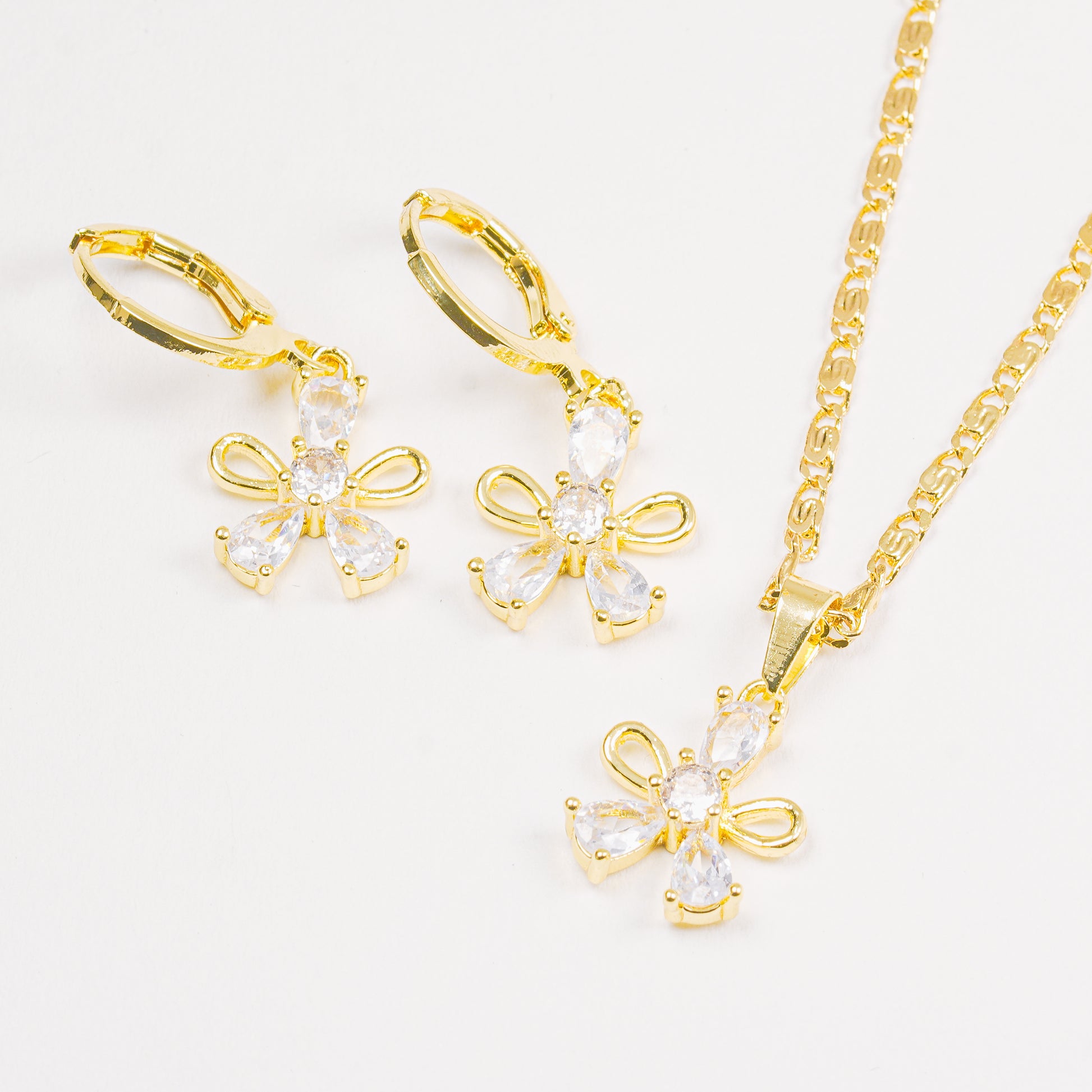 Un set de aderezo compuesto por aretes, una cadena de 45 centímetros y un dije en forma de flor estilo baguette, con circones en sus pétalos que capturan la esencia de la elegancia natural. ¡Siéntete radiante con el Set Flor Dorado Brillante!