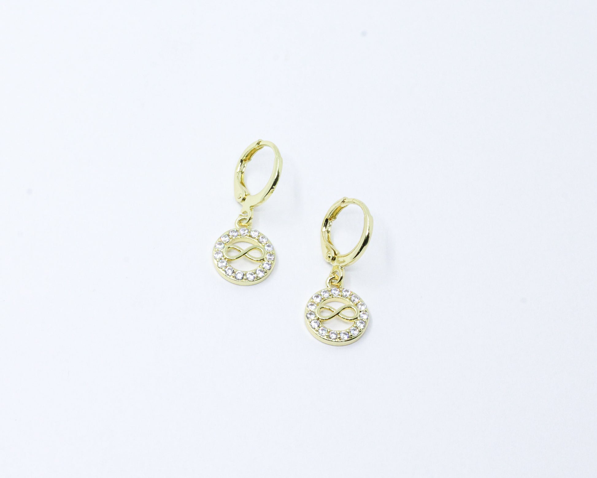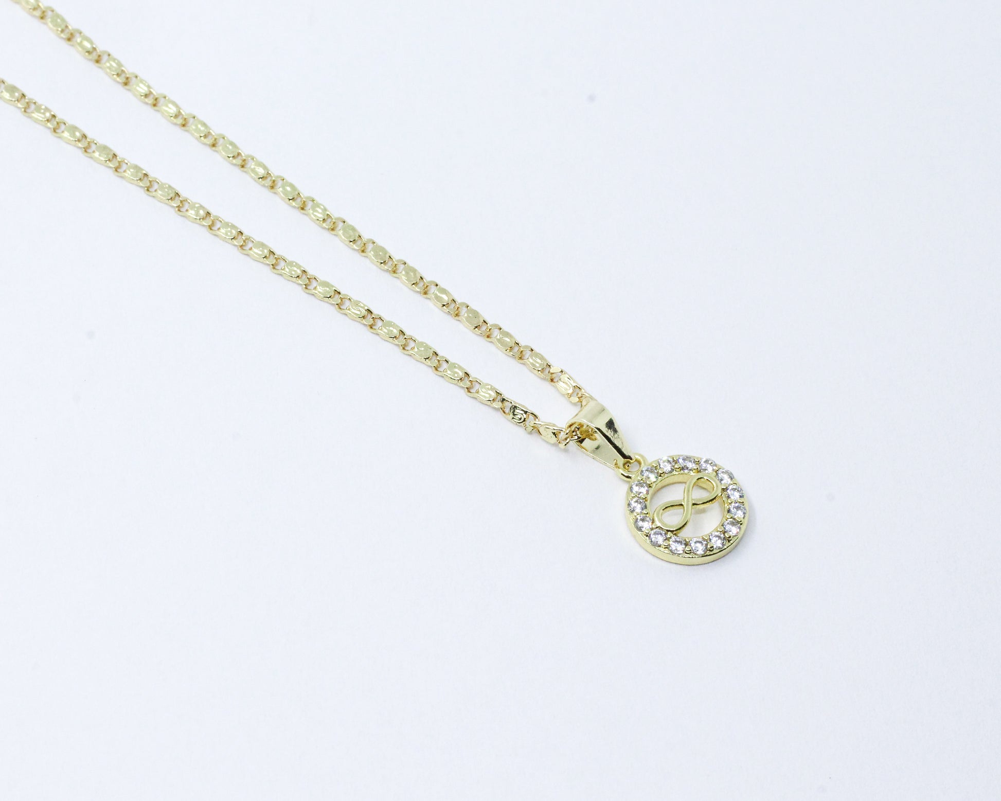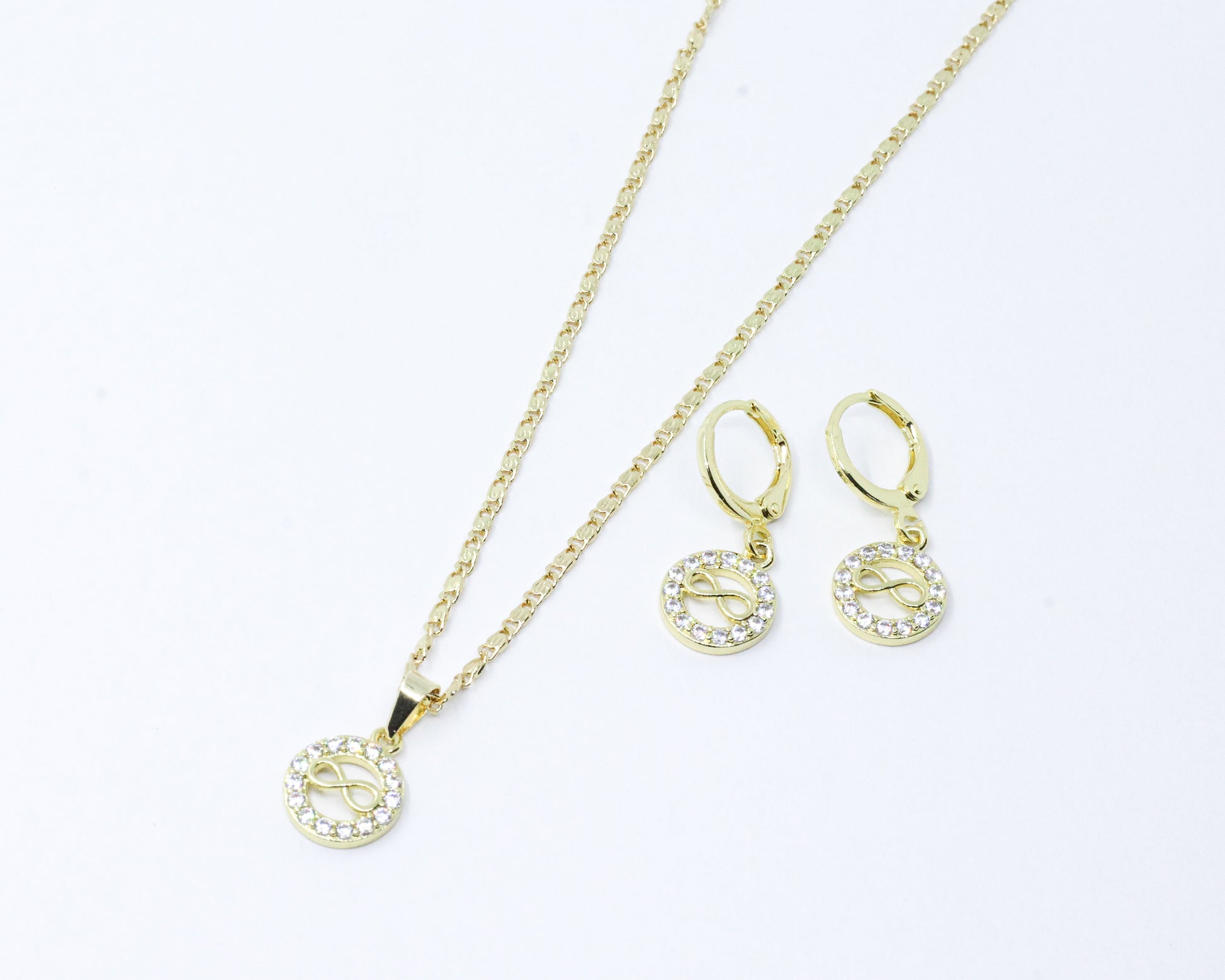 Un set de aderezo compuesto por aretes, una cadena de 45 centímetros y un dije en forma de infinito liso, con microcircones engastados en su silueta que evocan lo eterno. Completa tu look con estos infinitos dorados.