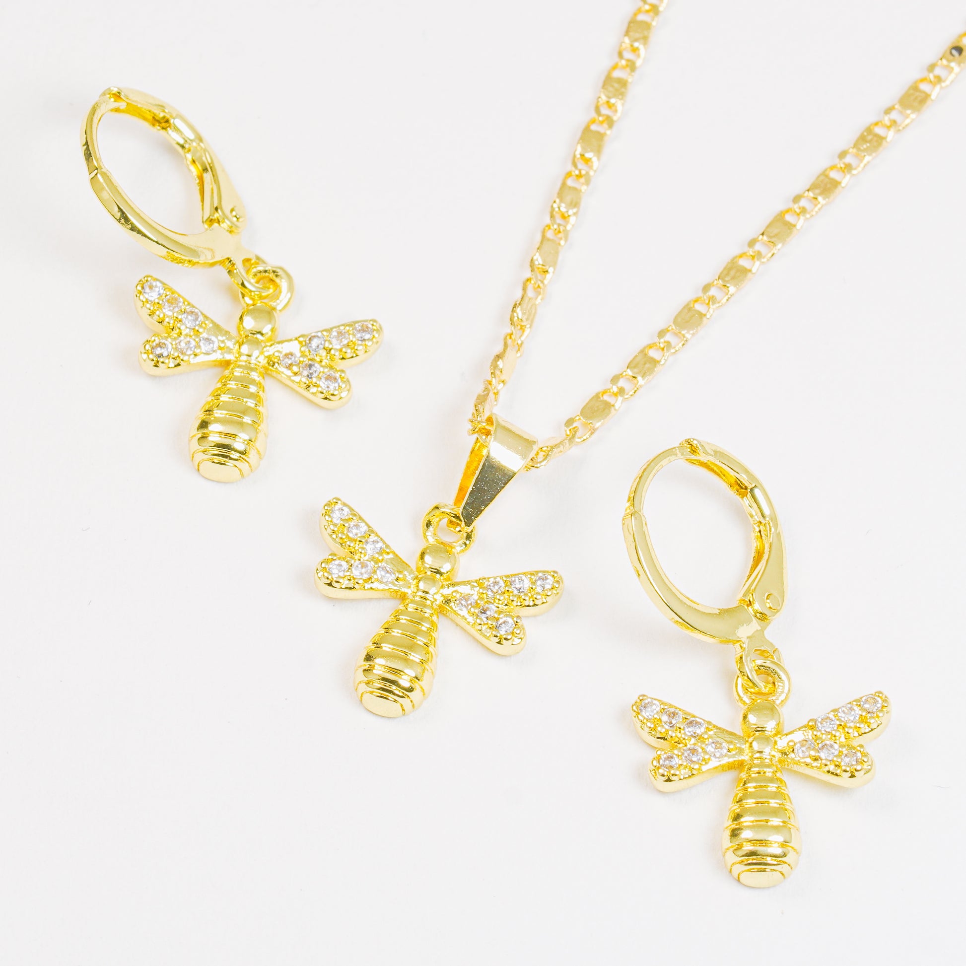 Un set de aderezo compuesto por aretes, una cadena de 45 centímetros y un dije en forma de libélula, con textura en el centro y microcircones en los laterales, que simbolizan la transformación, la libertad y la sabiduría espiritual. ¡Haz una declaración de estilo con el hermoso Set Libélula Dorada!