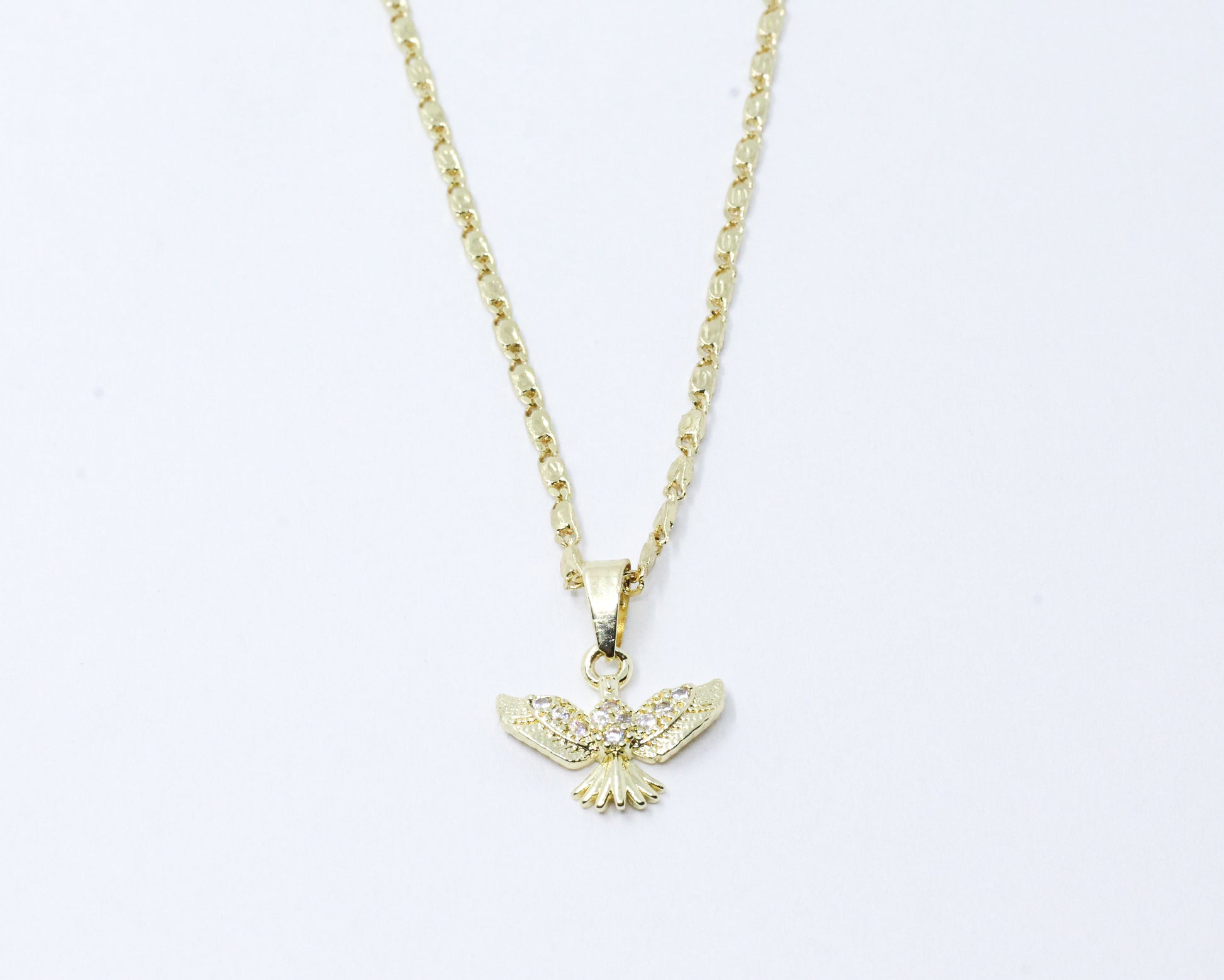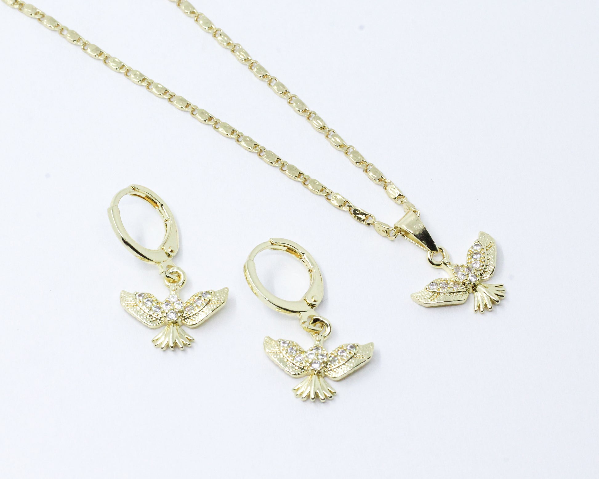 Un set de aderezo compuesto por aretes, una cadena de 45 centímetros y un dije en forma de paloma, con textura diamantada y microcircones en la parte posterior, símbolo de esperanza y libertad. ¡Realza tu look con el Set Paloma Cristal ahora!