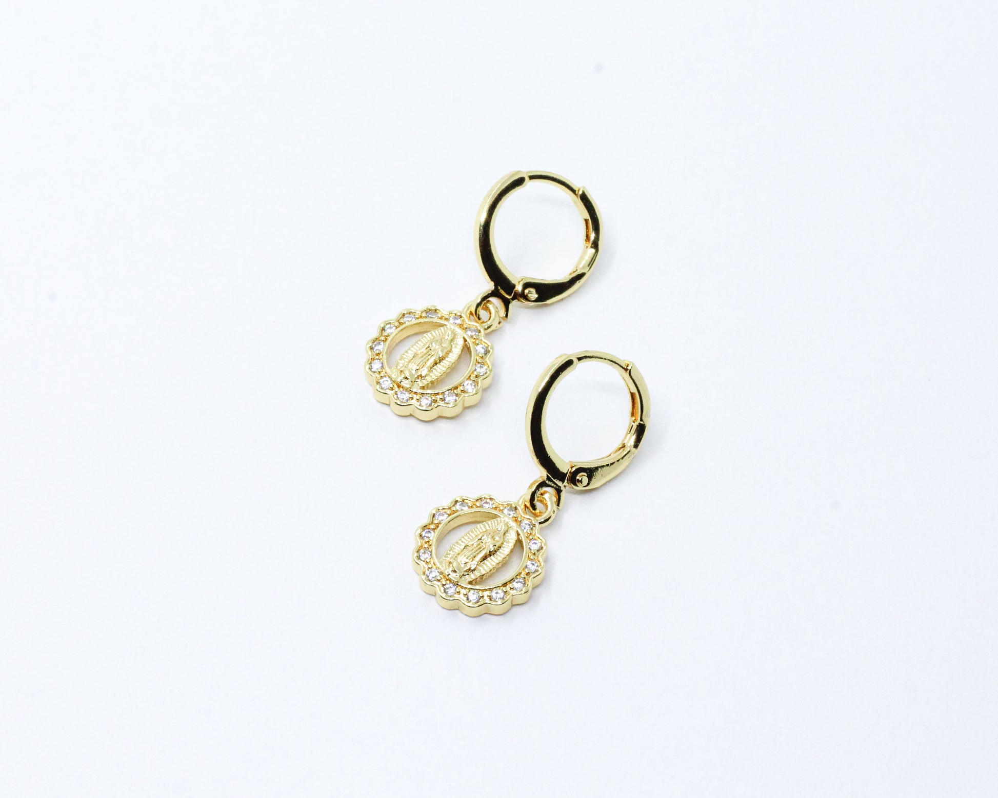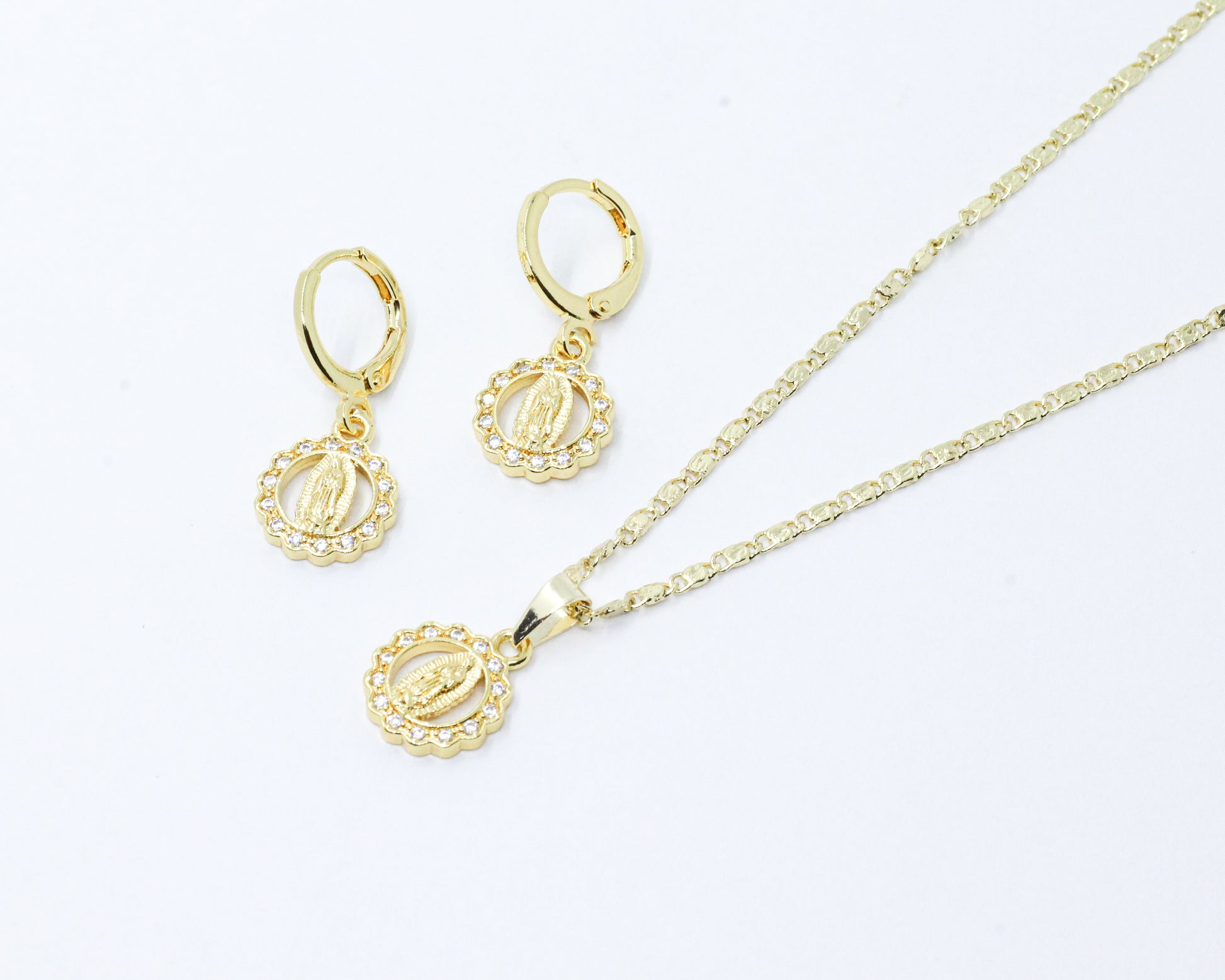 Un set de aderezo compuesto por aretes, una cadena de 45 centímetros y un dije con la imagen de la Virgen de Guadalupe en silueta texturizada, rodeada de sutiles microcircones que realzan su figura sin excesos. Demuestra tu fe y tu gusto por la moda con este hermoso set.