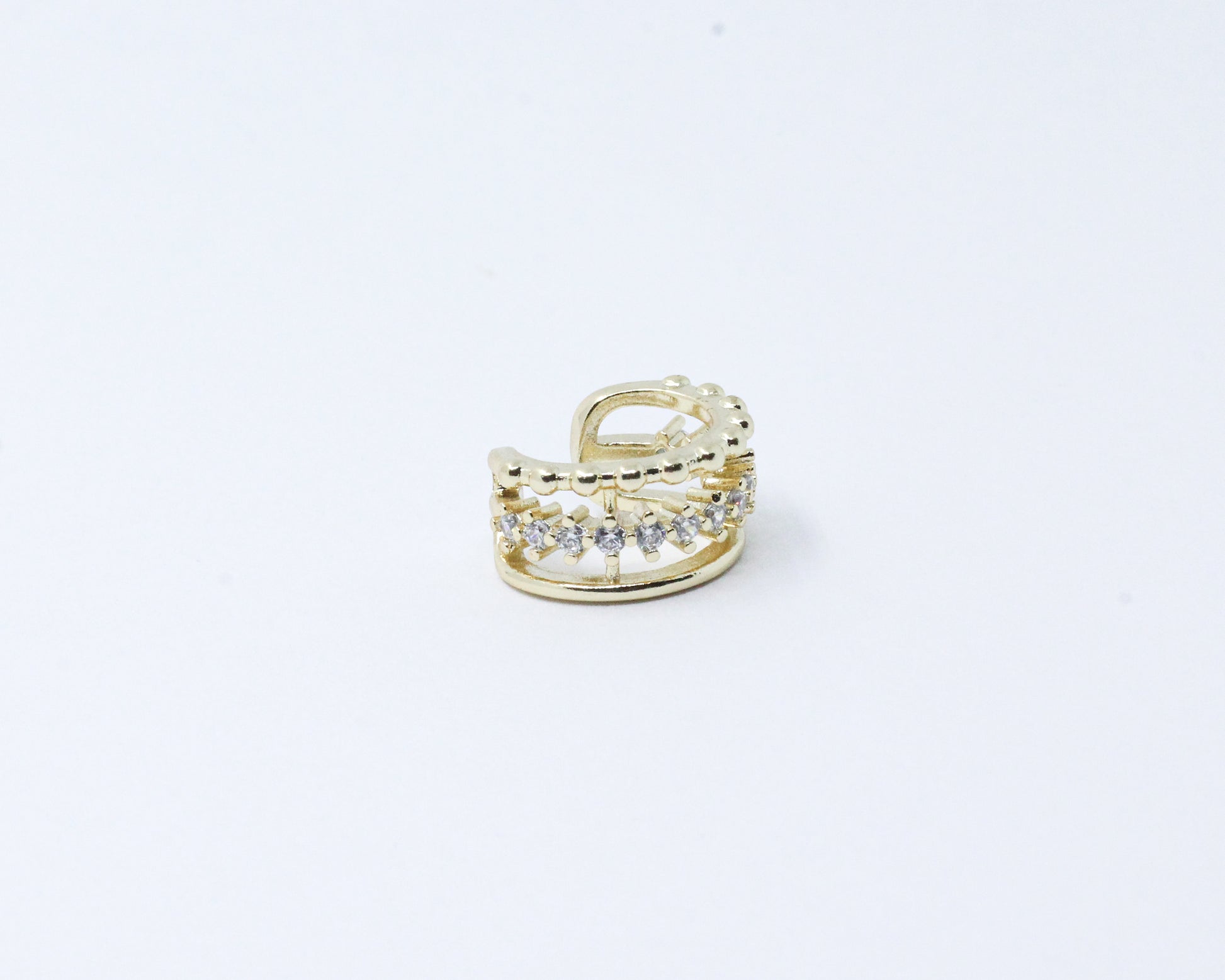 Earcuff dorado con un delicado centro de microcircones, enmarcado por esferas en los bordes que crean una ilusión de esplendor brillante y sofisticado. ¡Atrévete a añadir un poco de brillo a tu look con este exquisito earcuff!