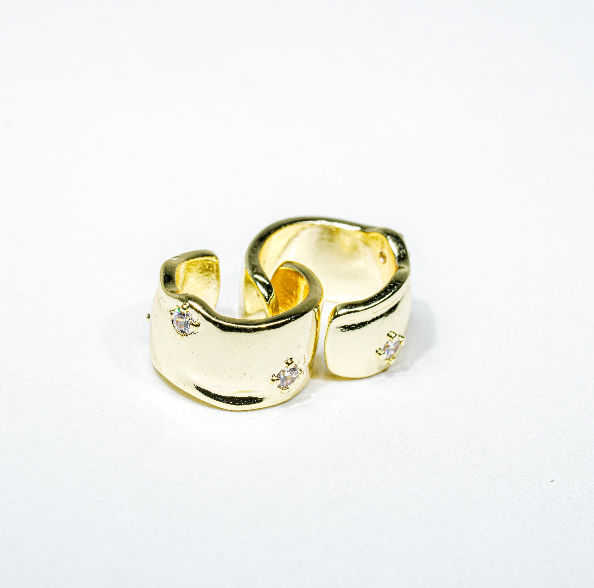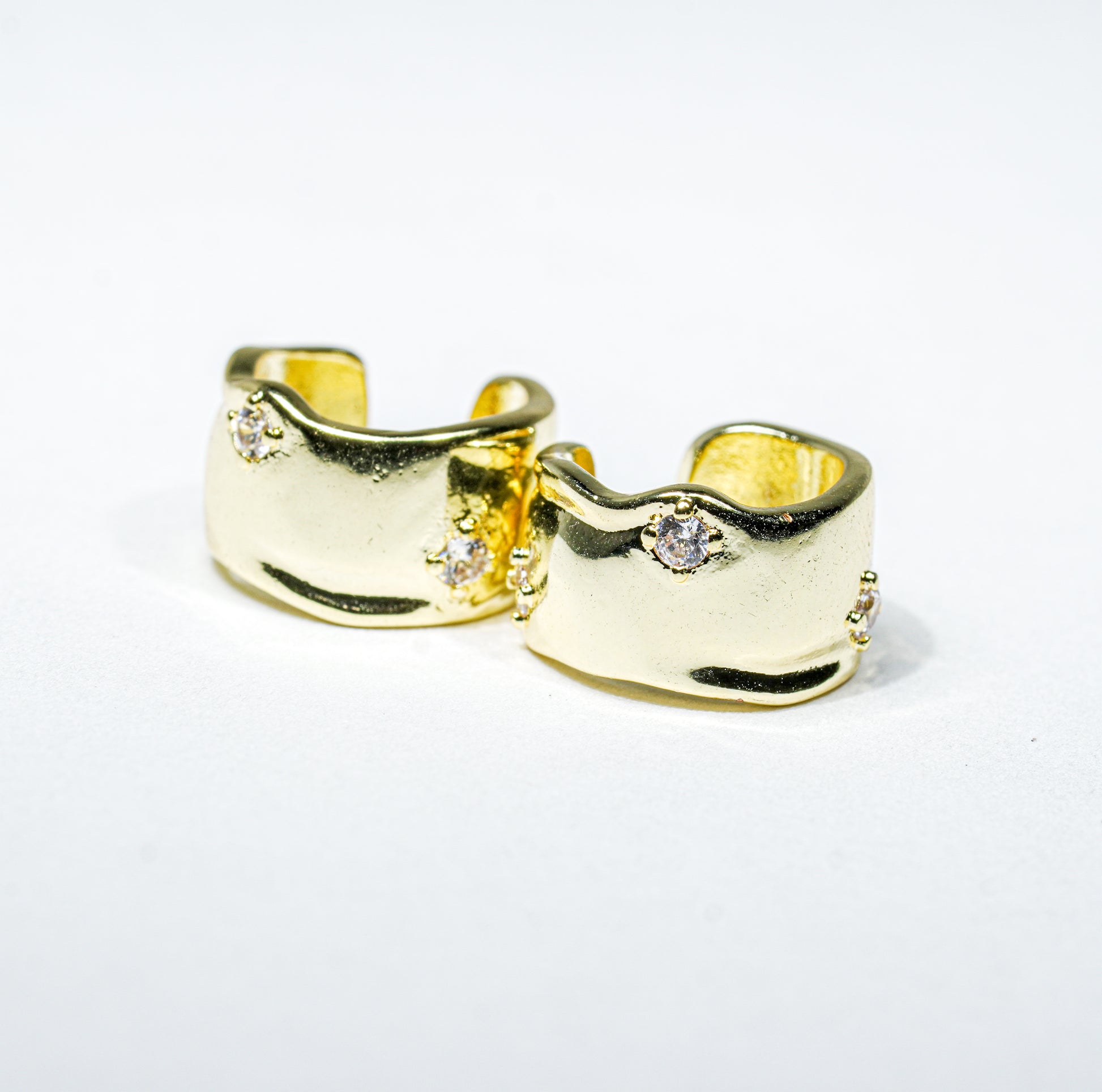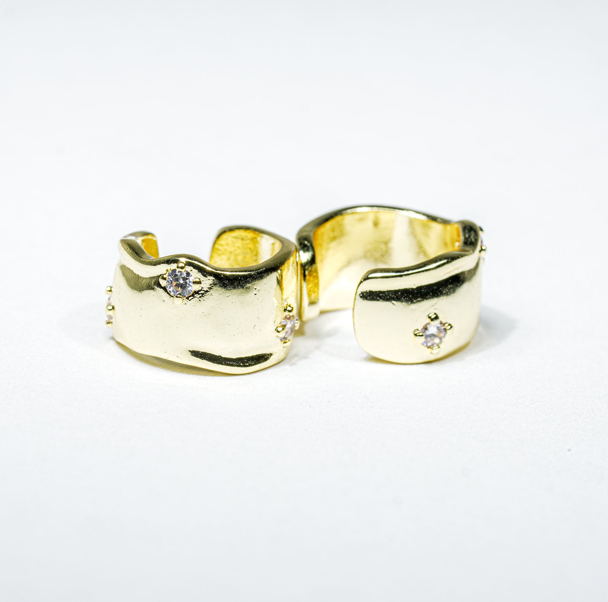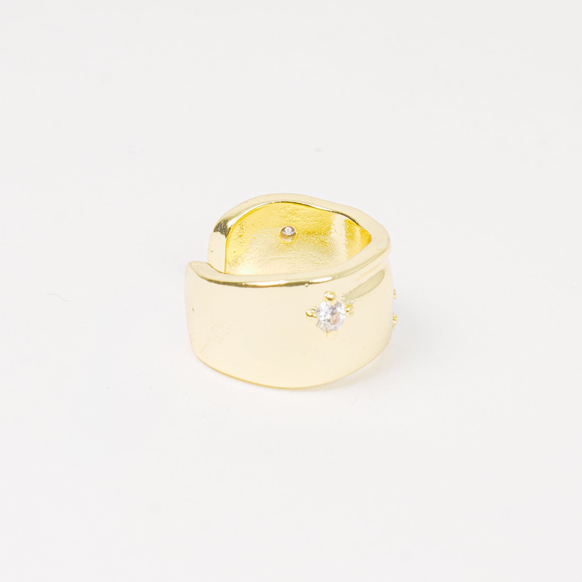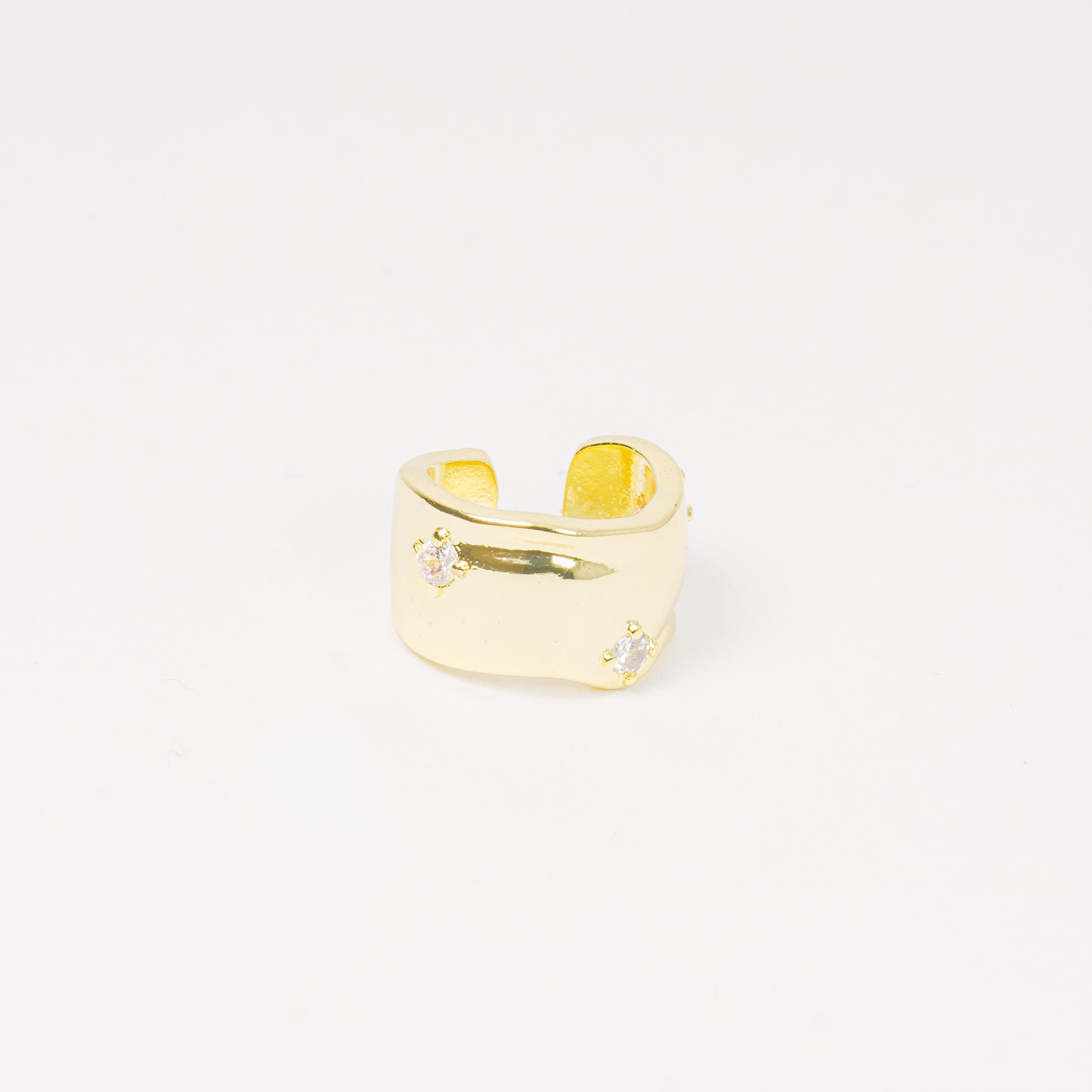 Earcuff dorado de líneas definidas y acabado totalmente liso, realzado con tres circones dispuestos de forma asimétrica que aportan un toque de brillo moderno y original.