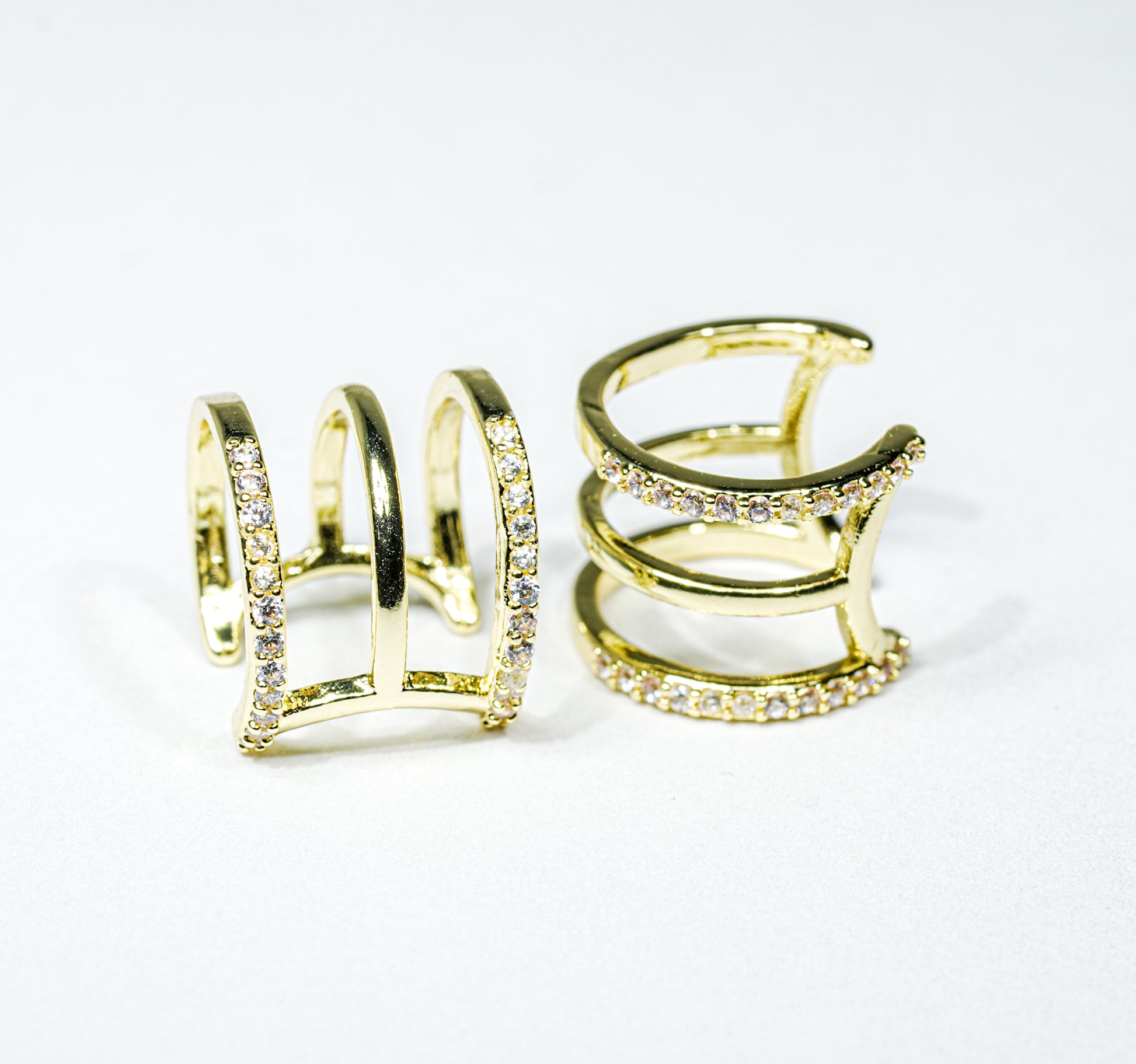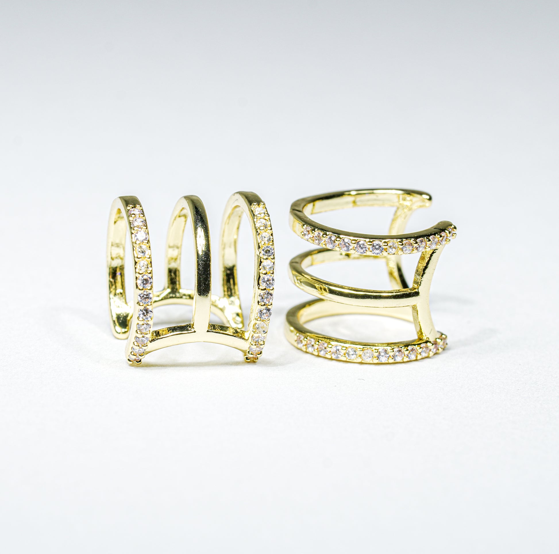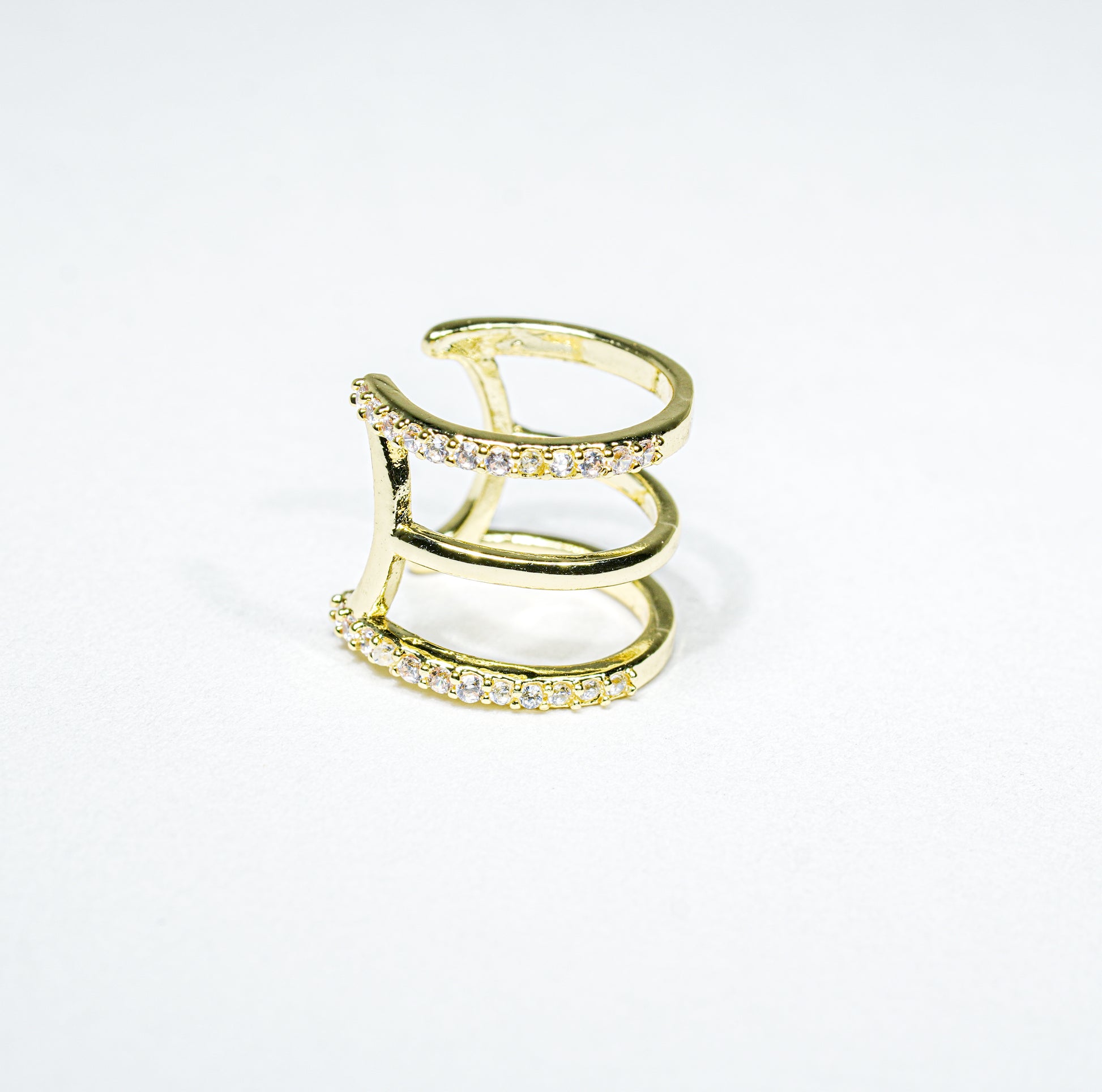 Earcuff dorado con diseño de triple aro: los aros exteriores están decorados con microcircones, mientras que el aro central presenta una línea lisa y brillante que aporta un contraste sofisticado.