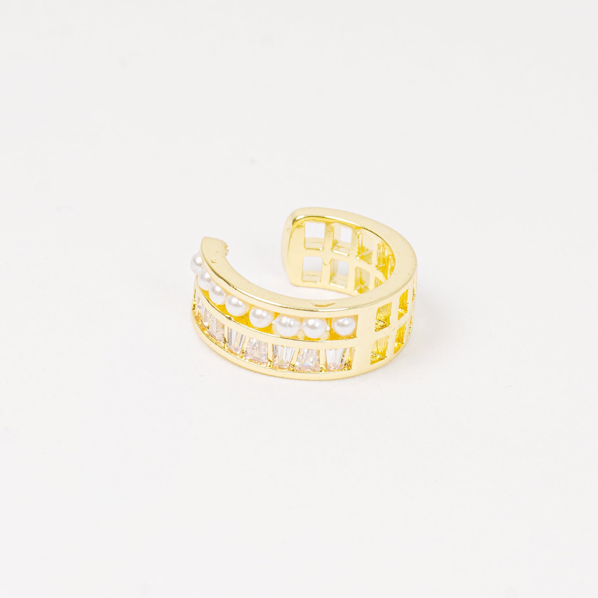 Earcuff dorado estilo baguette, con una franja engastada de circones blancos y otra adornada con finas perlas. El contraste sutil entre ambos elementos evoca una elegancia pura y refinada. Perfecto para cualquier ocasión.