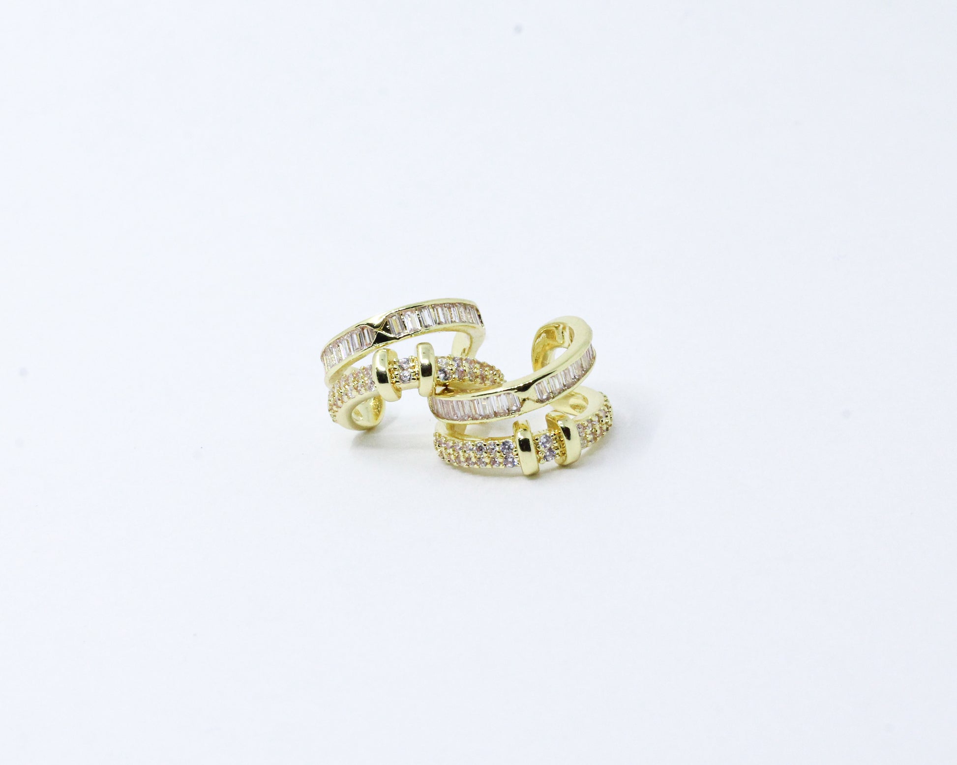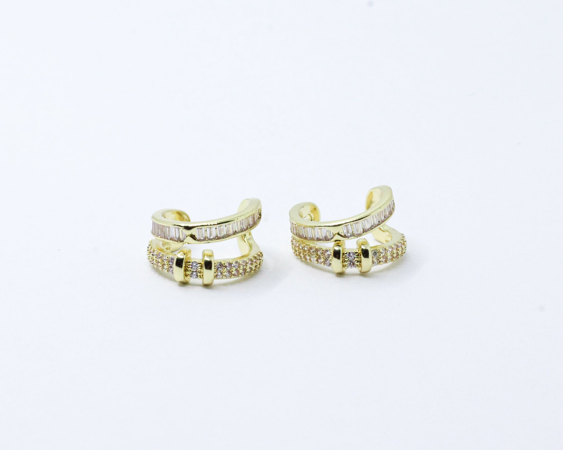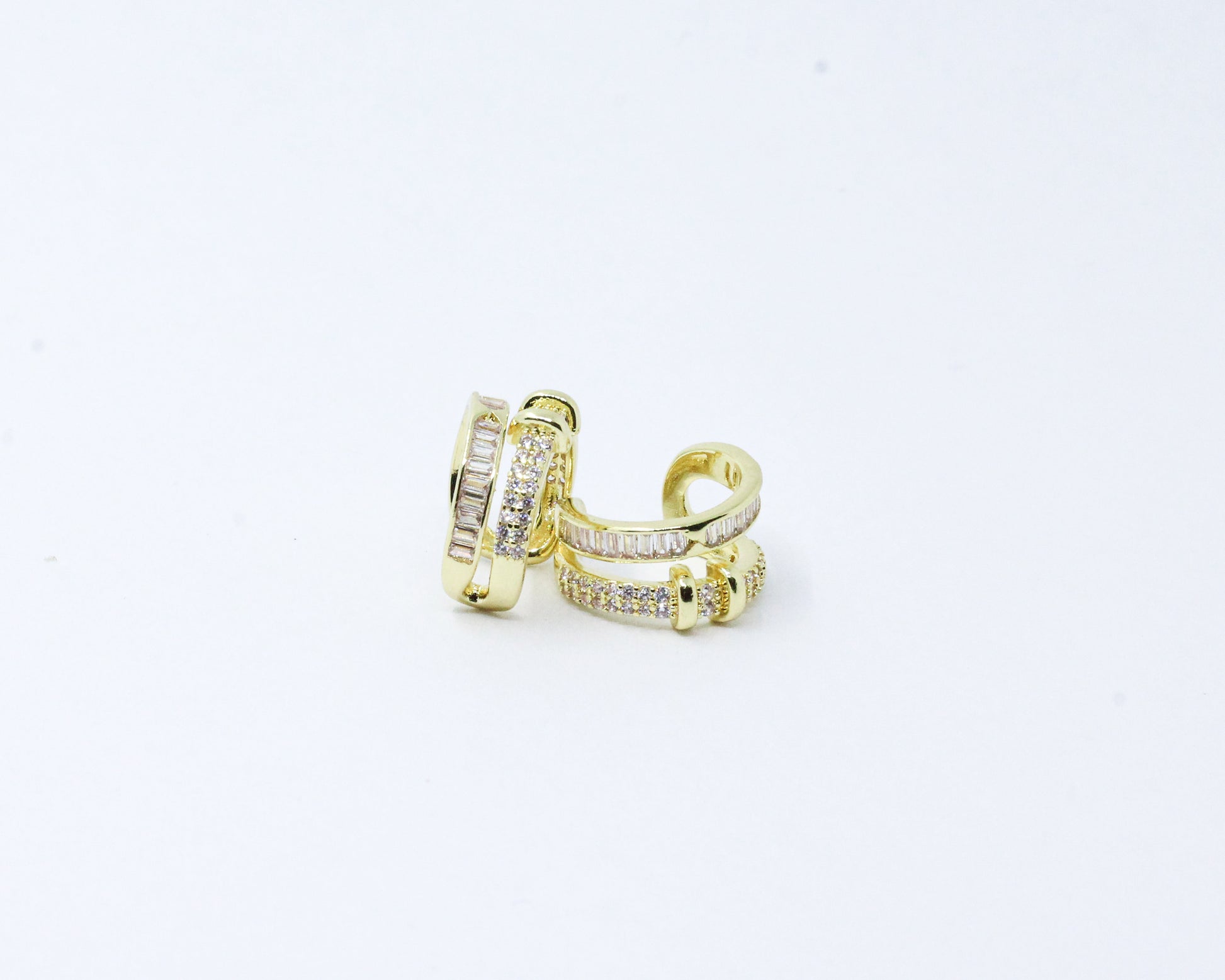 Earcuff dorado estilo baguette, con un diseño único de dos franjas paralelas: una compuesta por circones cuadrados y la otra por microcircones redondos. Juntos, aportan un destello tenue y sofisticado. Llévalo en cualquier ocasión para lucir con confianza y estilo.
