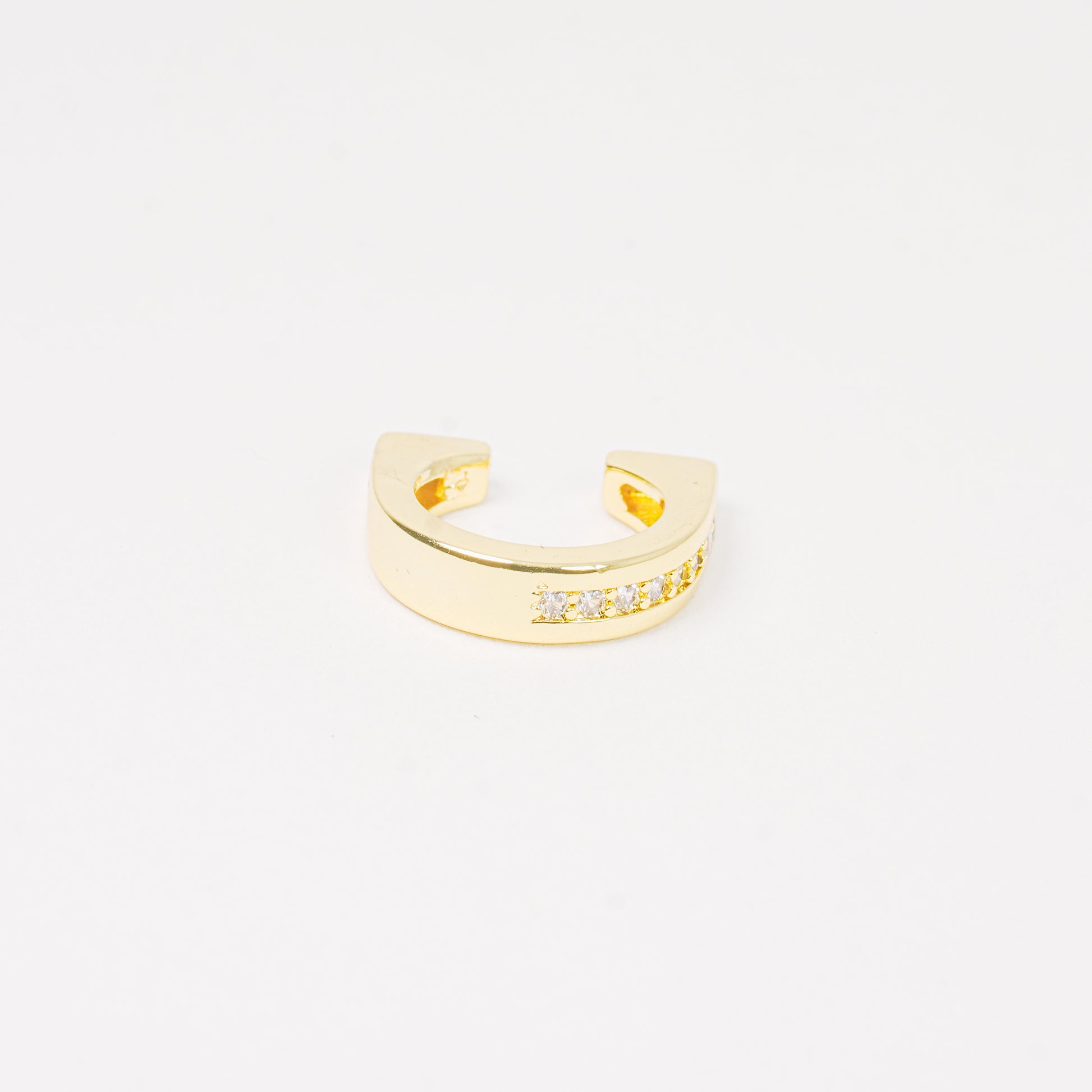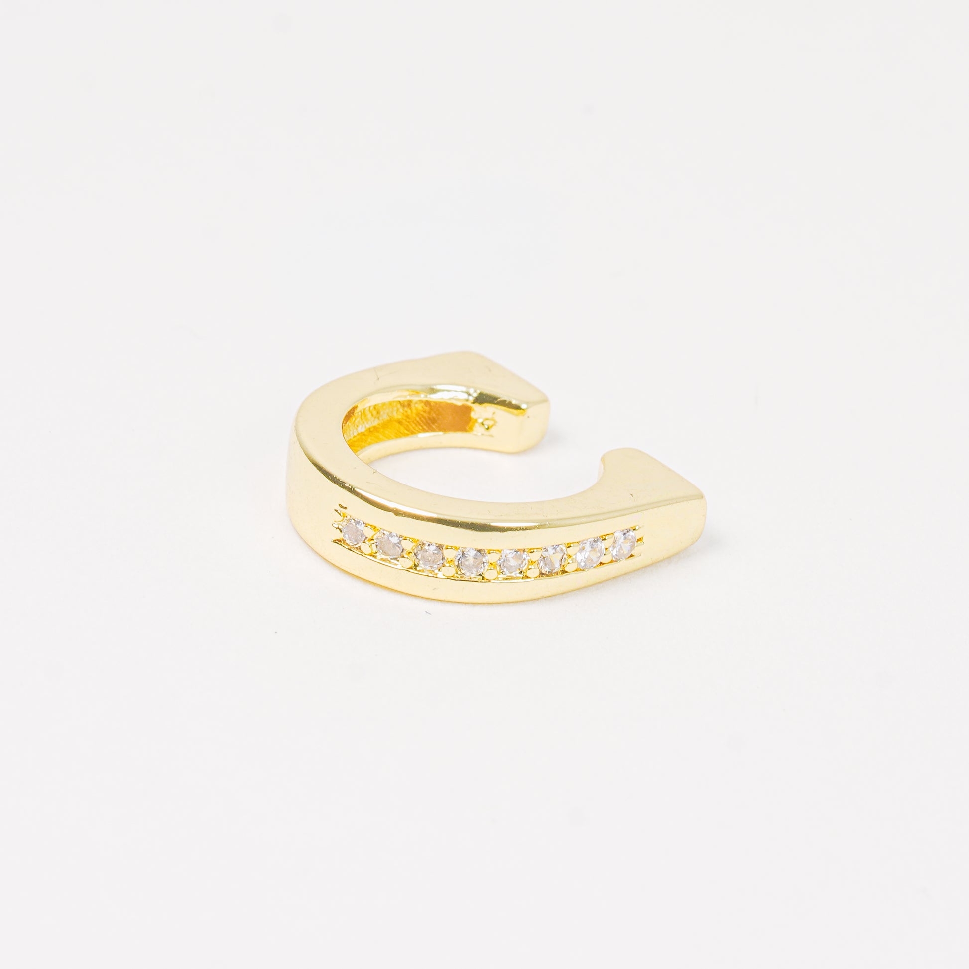 Earcuff dorado con diseño en forma de herradura, engastado con circones en uno de sus laterales, que aporta un brillo asimétrico y moderno.