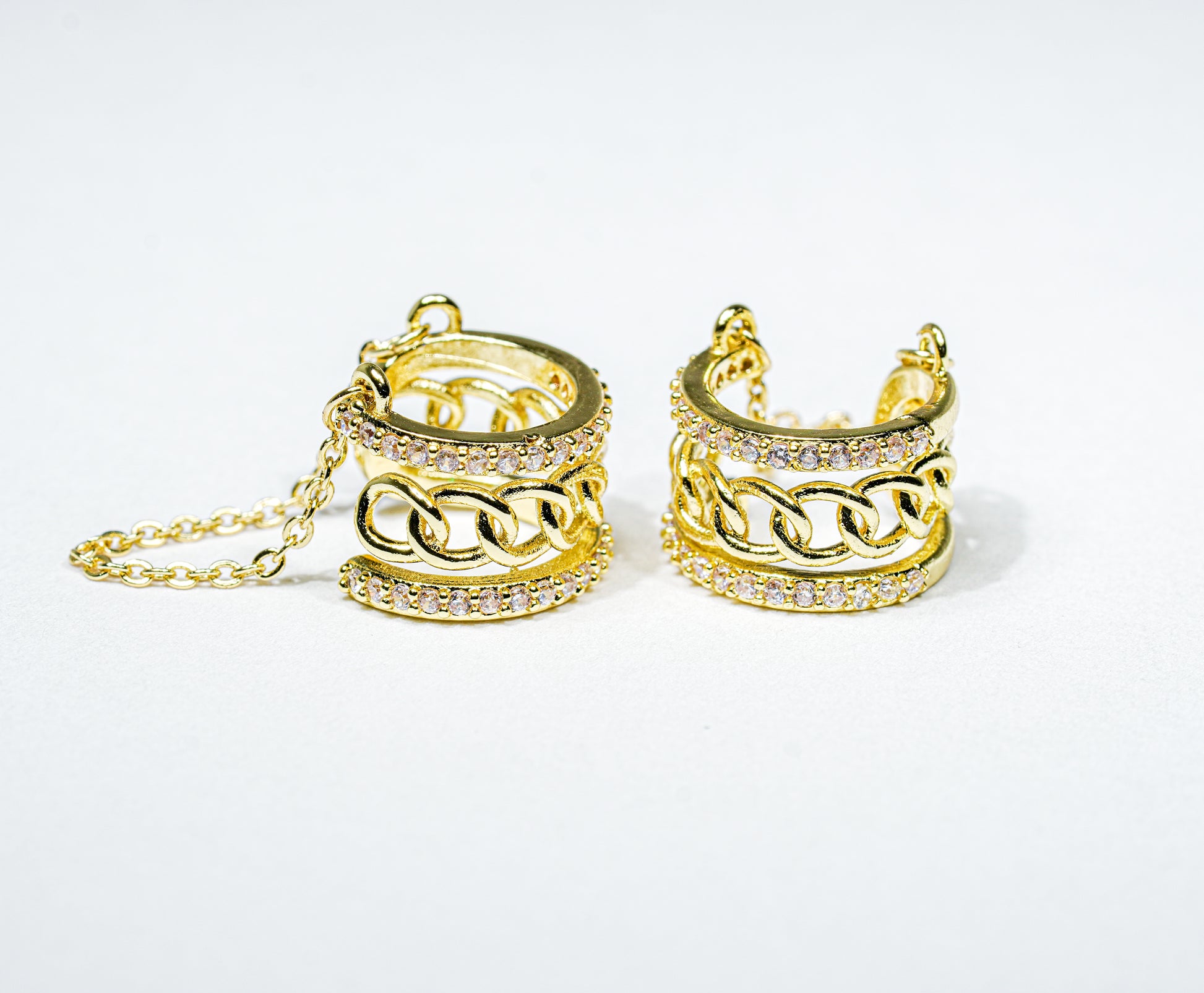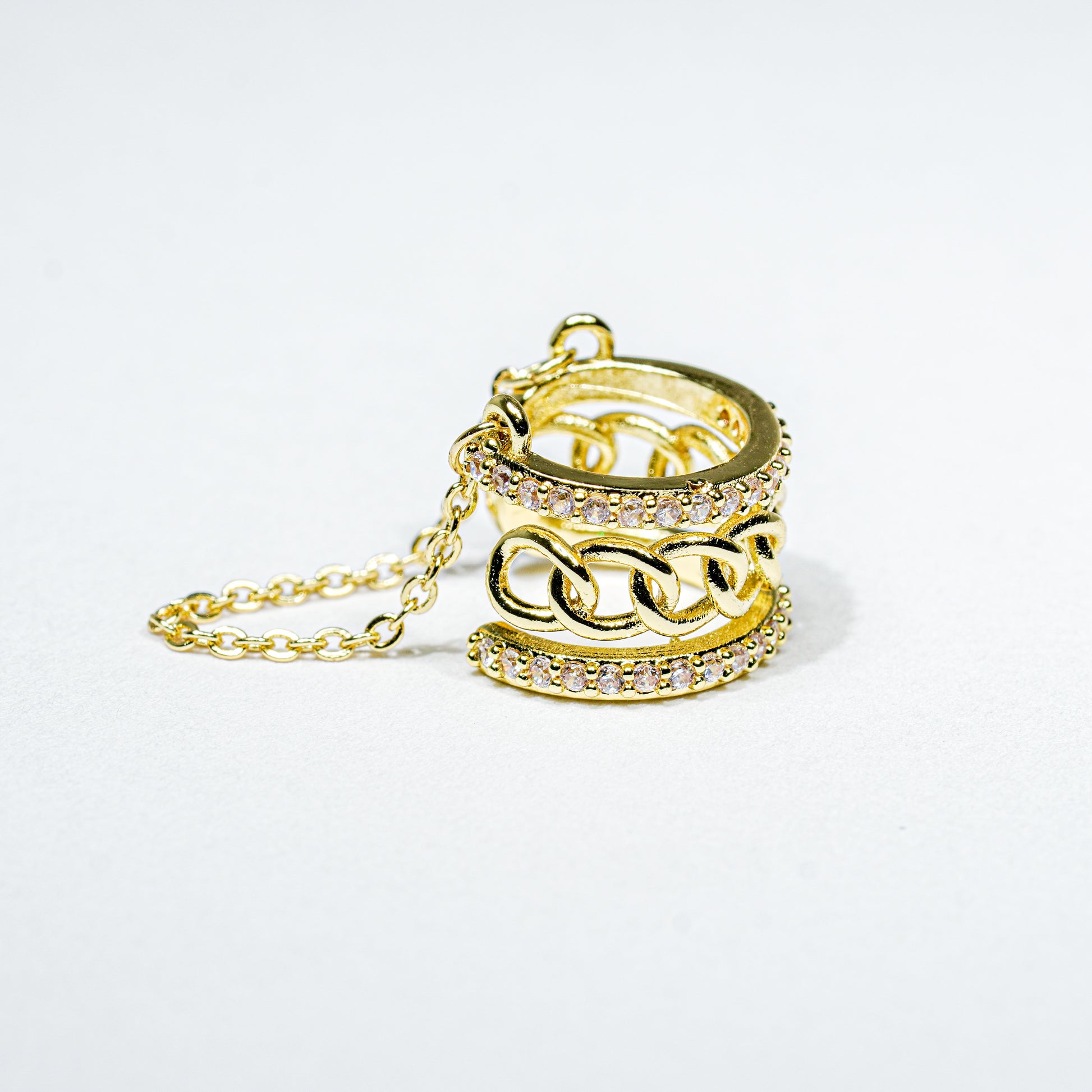 Earcuff dorado con silueta adornada de microcircones y un diseño central de pequeños eslabones lisos, complementado con una sutil cadena colgante. Una joya delicada y con estilo.