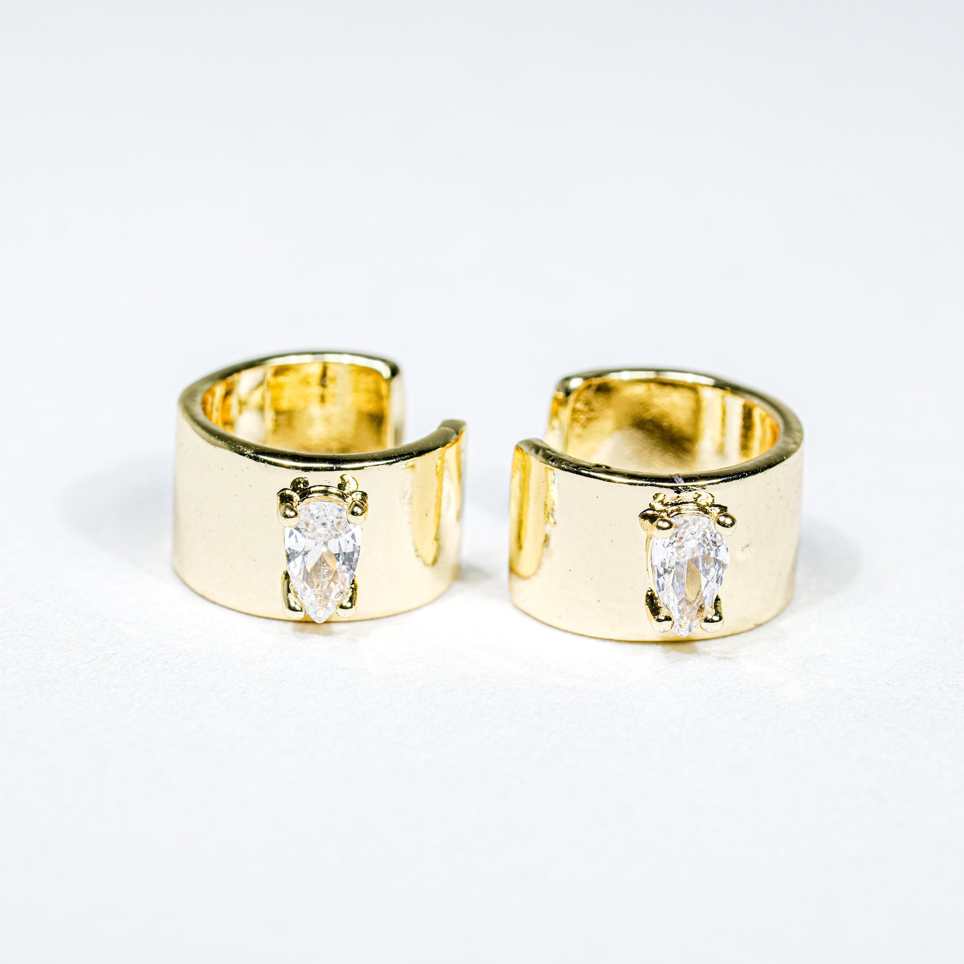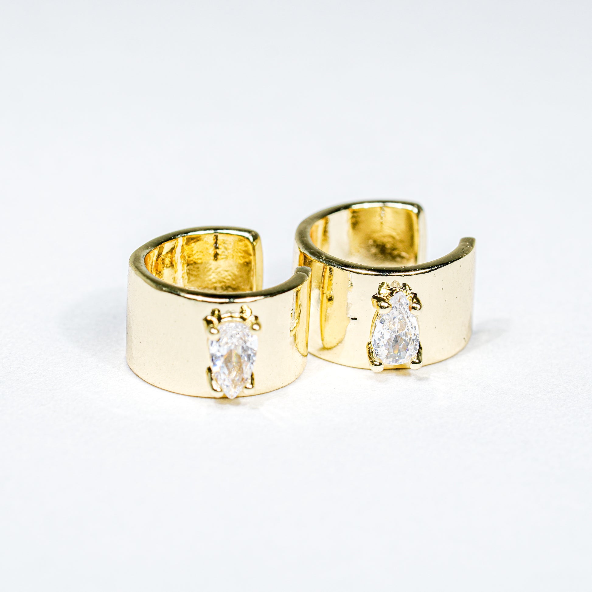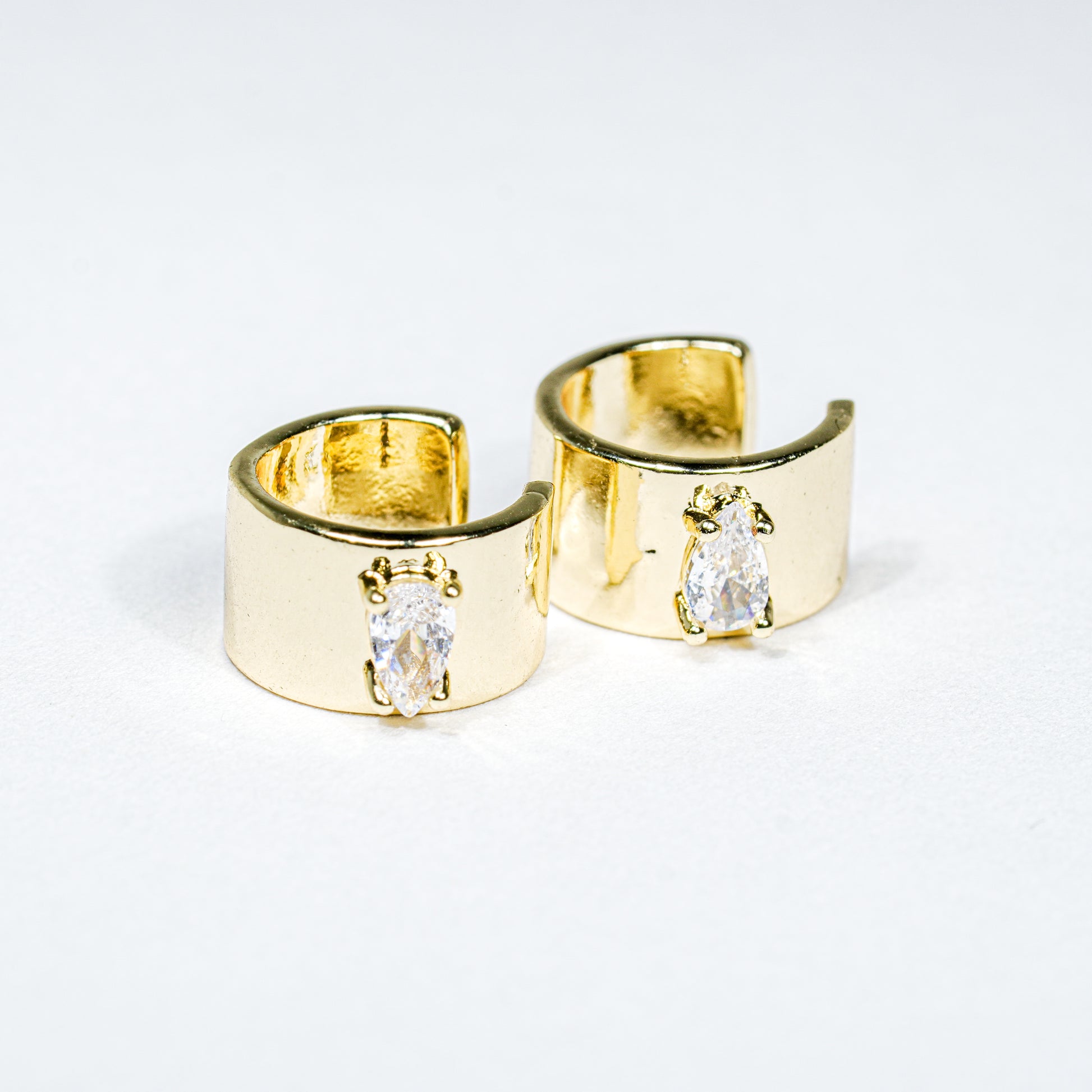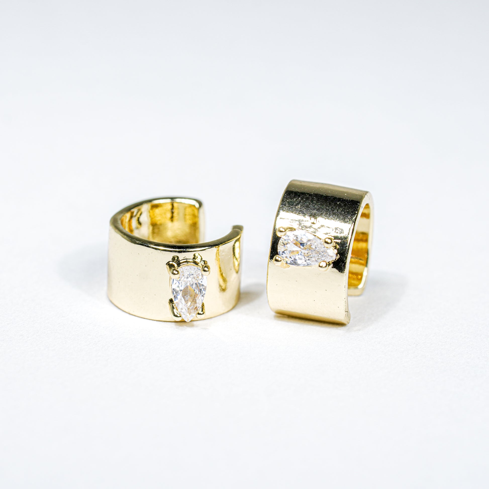 Earcuff dorado de textura gruesa y acabado liso, realzado en el centro con un circón en forma de gota que añade un toque de brillo sutil y elegante.
