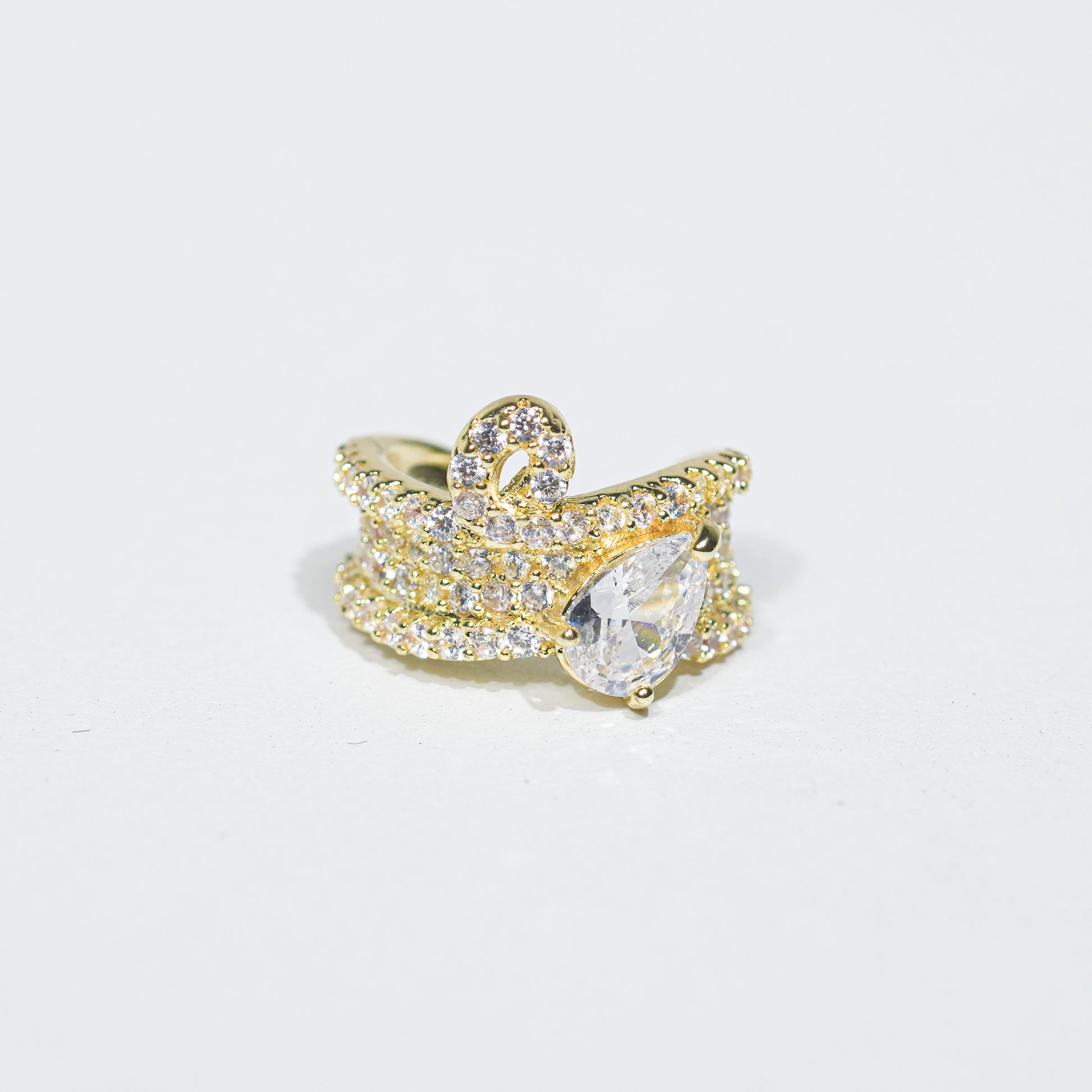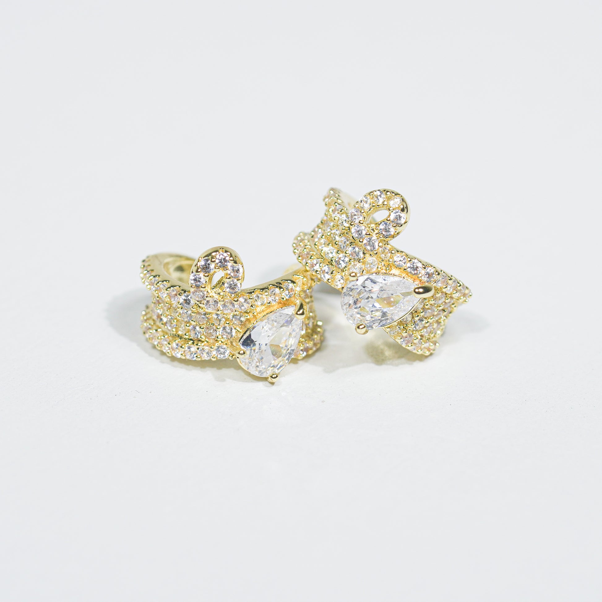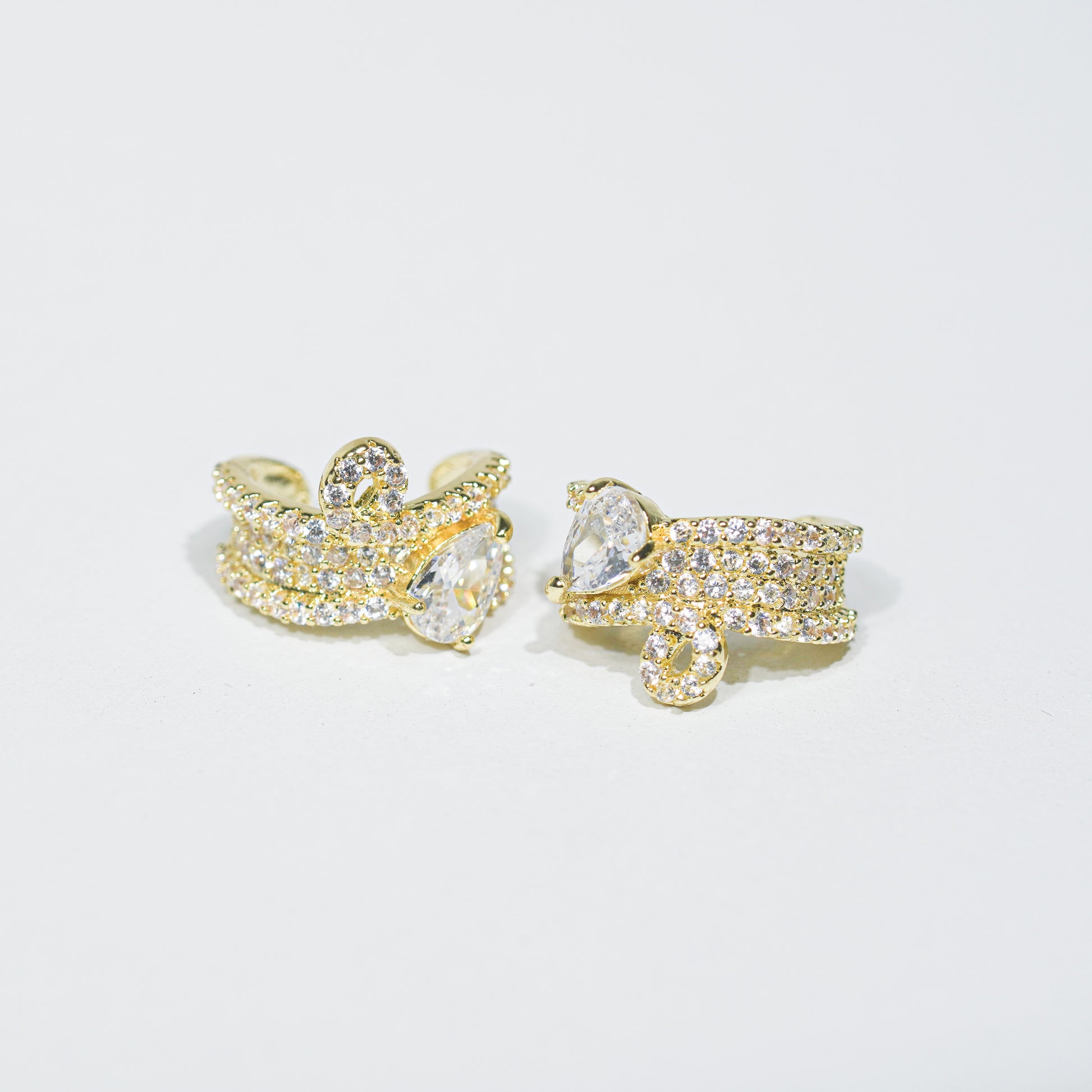 Earcuff dorado completamente engastado con microcircones, acompañado por un elegante círculo en forma de gota que añade un toque de brillo sutil y sofisticación.