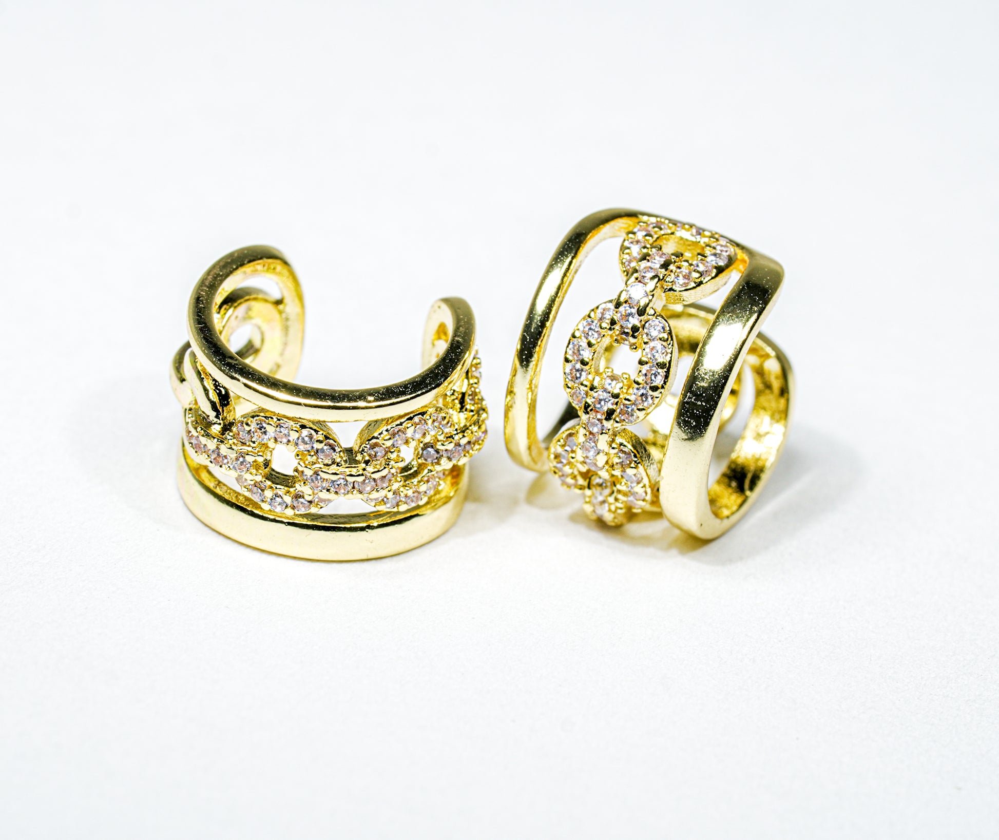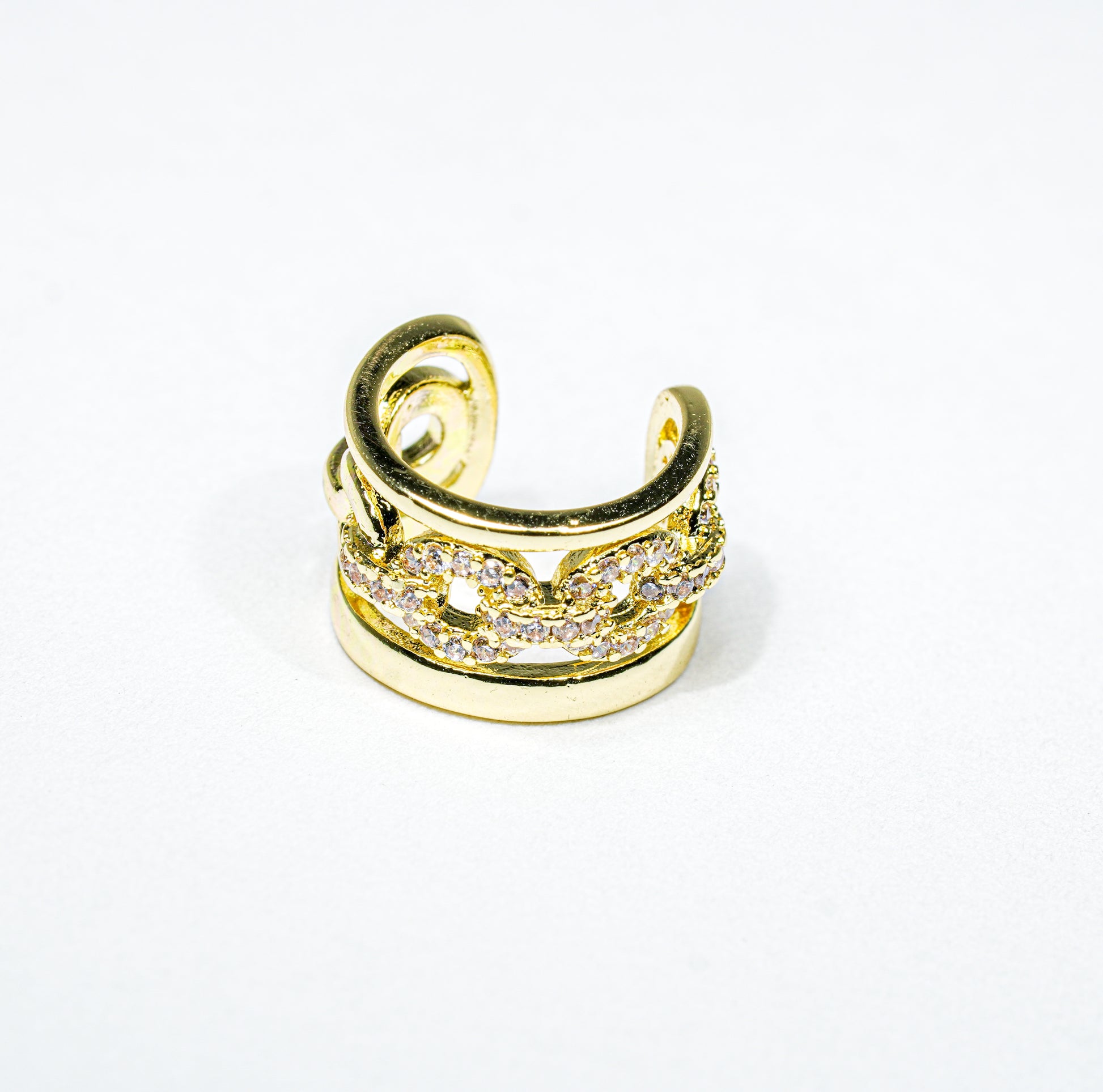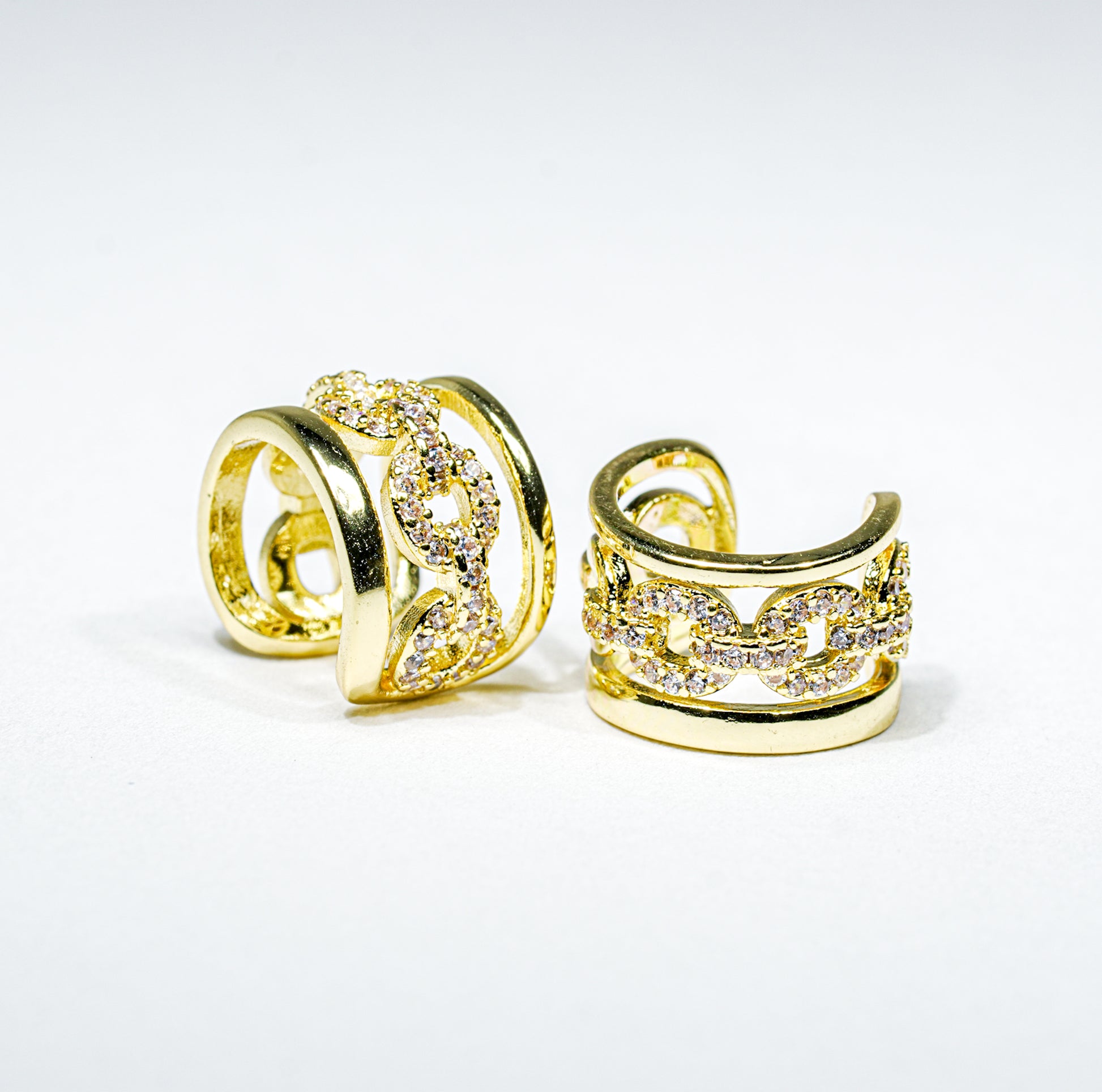 Earcuff dorado de siluetas lisas, con un diseño central en forma de eslabones, delicadamente rodeado de microcircones. Una pieza moderna con un toque de brillo sutil.