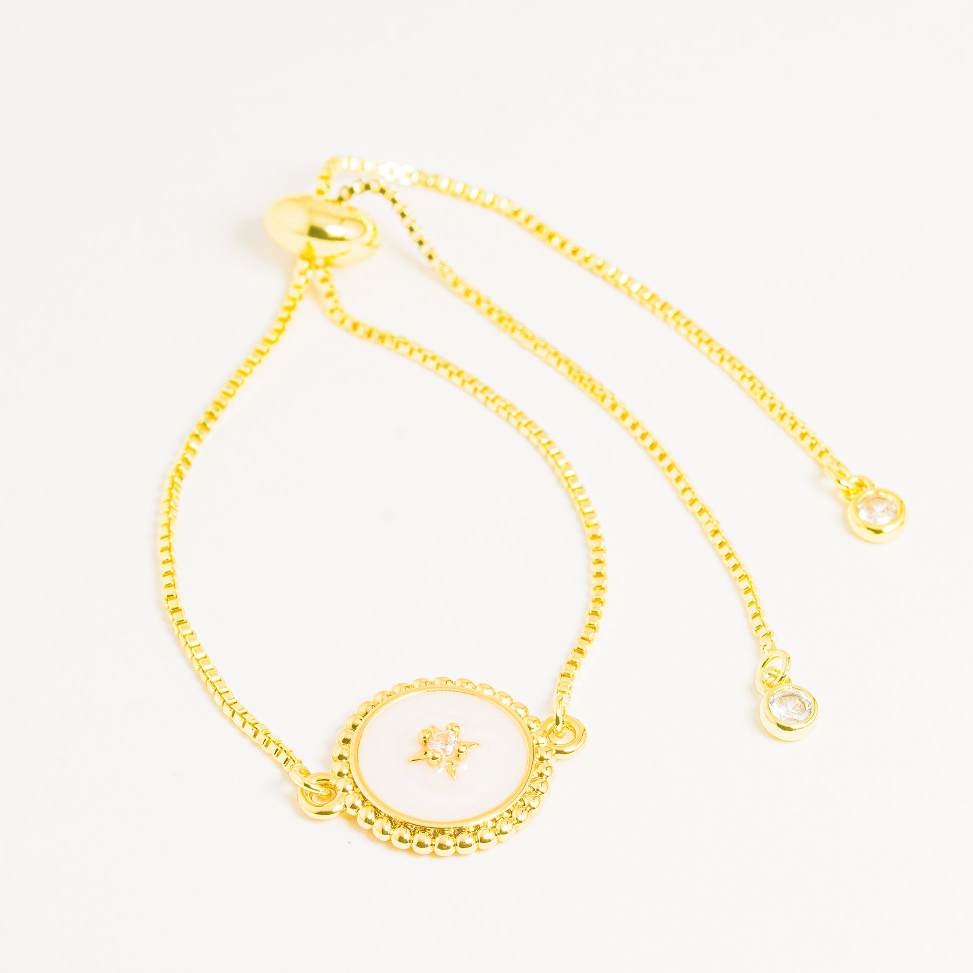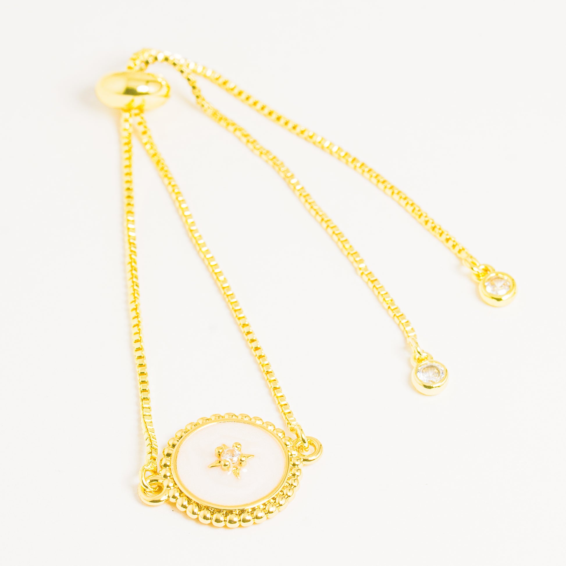 Una manilla dorada de diseño delicado y elegante, con una cadena fina que realza su acabado brillante. En el centro destaca un detalle circular de tono blanco, acompañado por un pequeño cristal que aporta un toque de luz sutil y sofisticado.