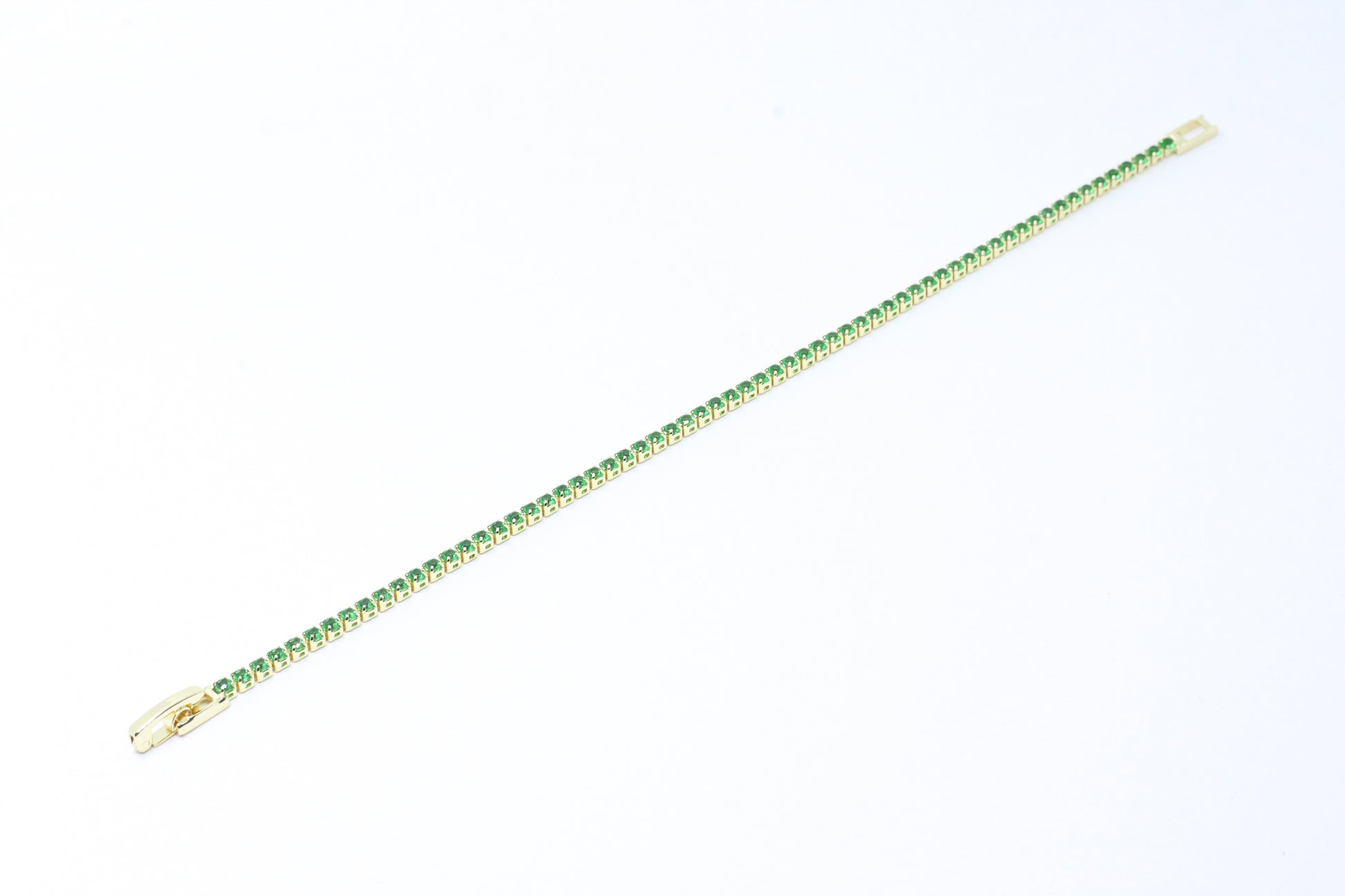 Una pulsera estilo tenis con una impecable hilera de circones en tono verde esmeralda, montados sobre una base dorada que realza sutilmente cada destello con elegancia. Añade un toque de estilo a tu look con la Pulsera Tenis Verde Esmeralda.