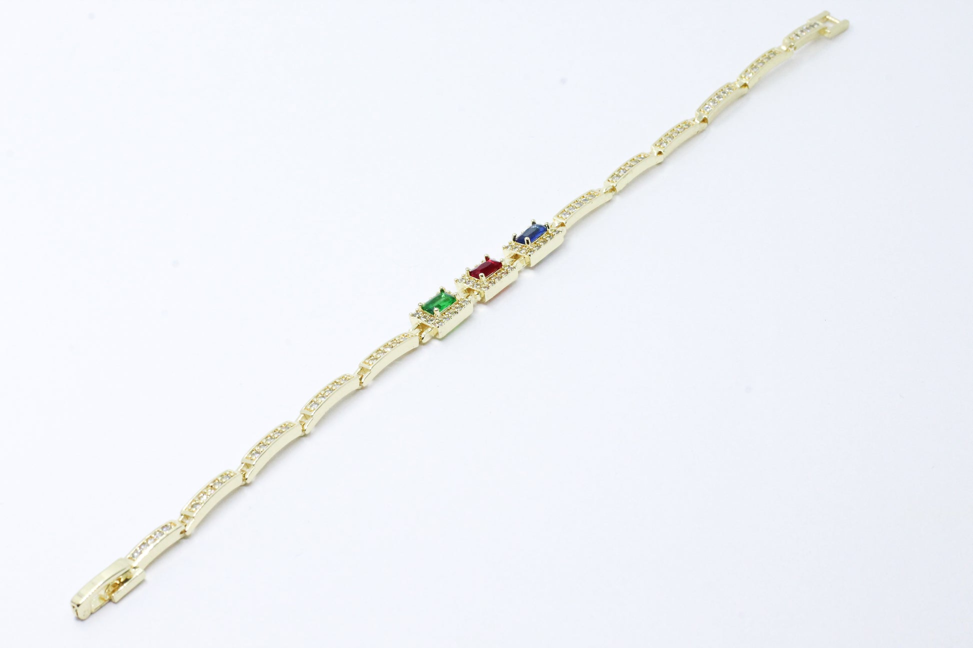 Una pulsera dorada con eslabones rectangulares engastados con microcircones. En el centro, tres piedras multicolor añaden un destello vibrante y sofisticado que realza el diseño con un toque de color único. Aprovecha al máximo su belleza y versatilidad, y añade un toque de lujo a tu estilo diario.