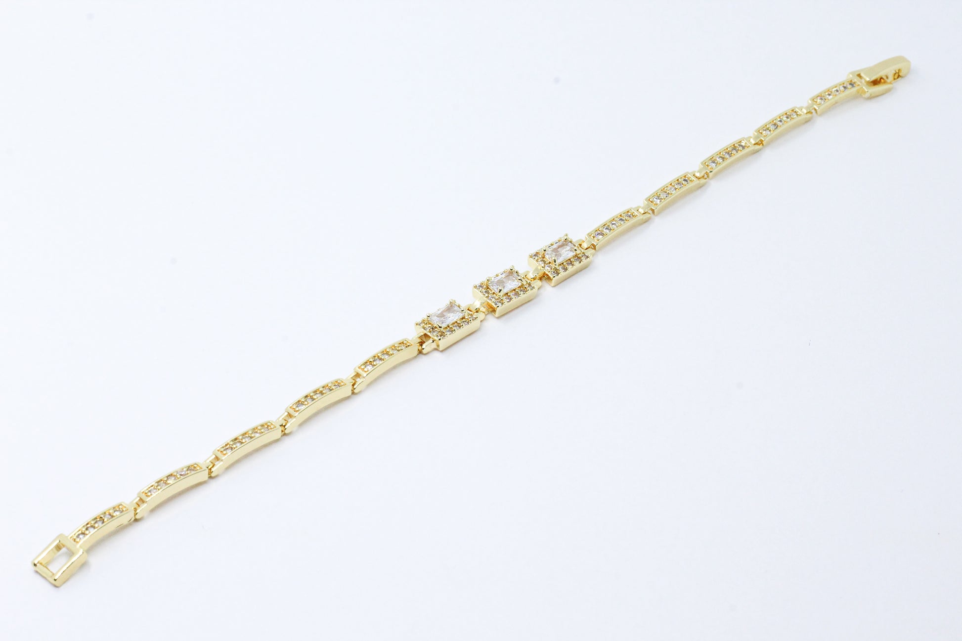 Una pulsera dorada con eslabones rectangulares engastados con microcircones. En el centro, tres piedras blancas añaden un destello vibrante y sofisticado que realza el diseño con un toque de color único. Dale un toque de lujo y elegancia a tu estilo con esta hermosa pulsera.